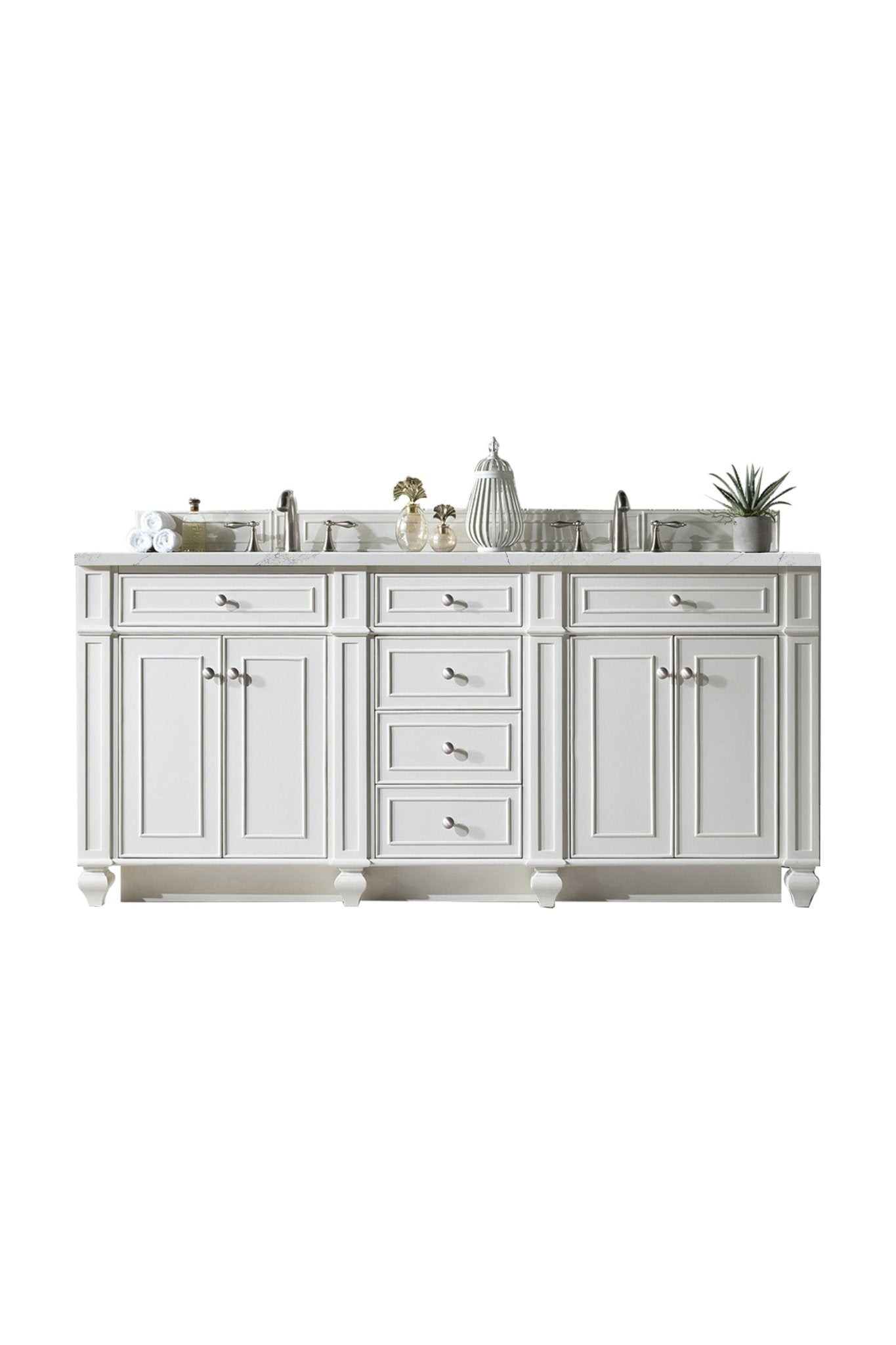 The Bristol 72" Bright White Double Vanity features a full plinth base, also known as a toe kick or pedestal base. This wraparound base allows for quick clean ups. This vanity is complimented by Satin Nickel door and drawer pulls, along with an optional wood backsplash. The look is completed with a 3 CM eased edge Ethereal Noctis Silestone top and one white ceramic rectangular sink.