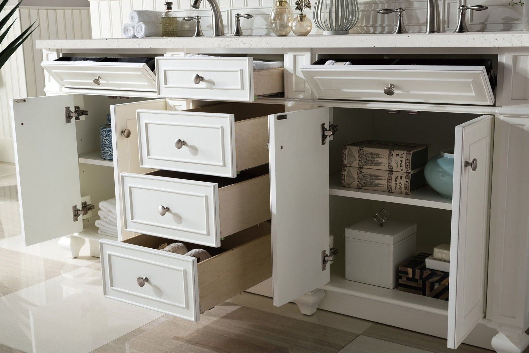 Detailed and distinctive, the Bristol 72” Double Vanity in Bright White features recessed and raised picture frame molding. This four-door cabinet with two shelves and six drawers, top outside drawers are tip out style. Gracefully supported by tulip-shaped legs, this vanity offers a mix of craftsmanship and functionality. Completed with a Lime Delight Silestone top which lends warm, textured beige tones, the Bristol vanity can complement a variety of decors and is a sophisticated vanity solution for your small bathroom.
