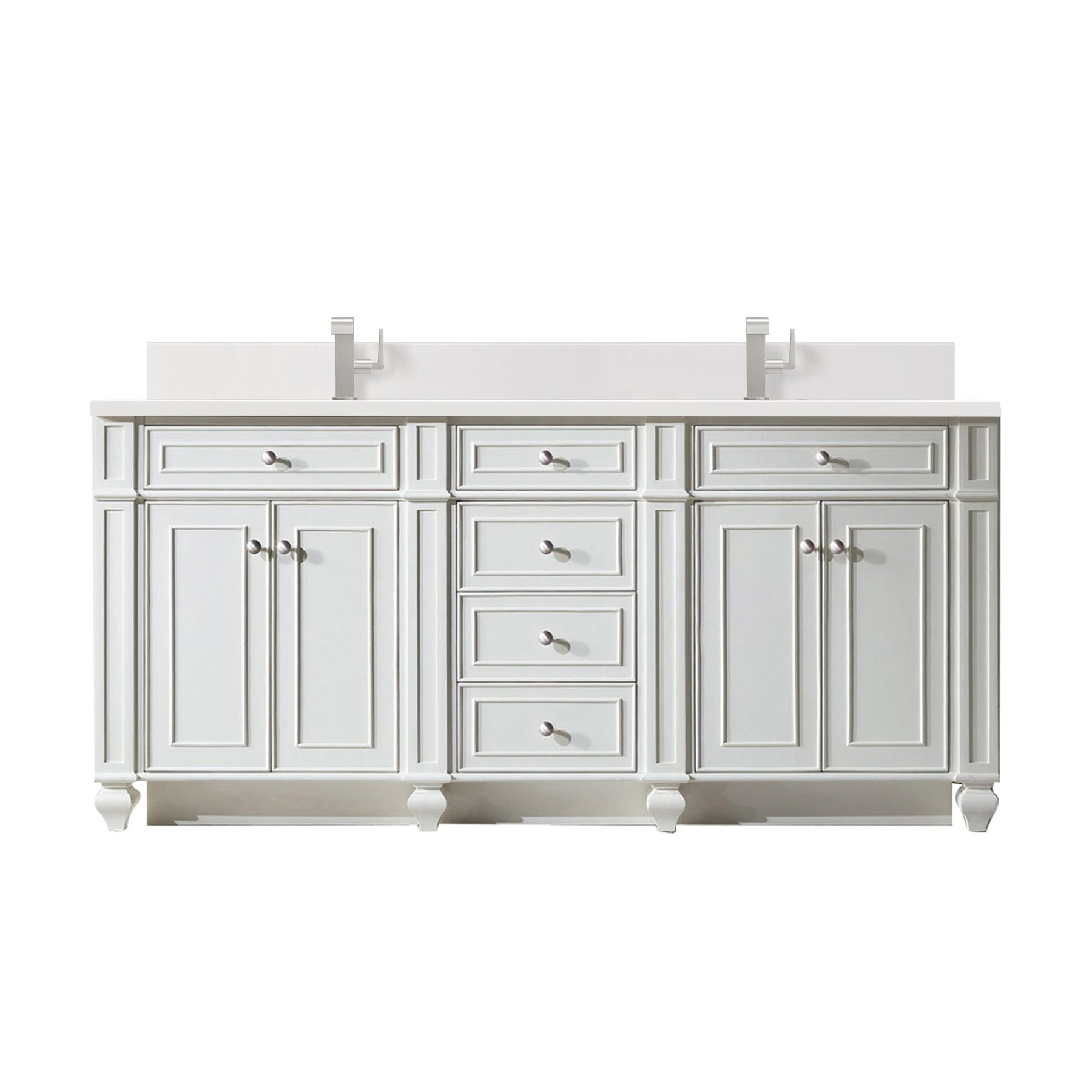 Detailed and distinctive, the Bristol 72” Double Vanity in Bright White features recessed and raised picture frame molding. This four-door cabinet with two shelves and six drawers, top outside drawers are tip out style. Gracefully supported by tulip-shaped legs, this vanity offers a mix of craftsmanship and functionality. The timeless, White Zeus Silestone top and backsplash provides a contemporary touch, or choose to use the top with included wood backsplash.