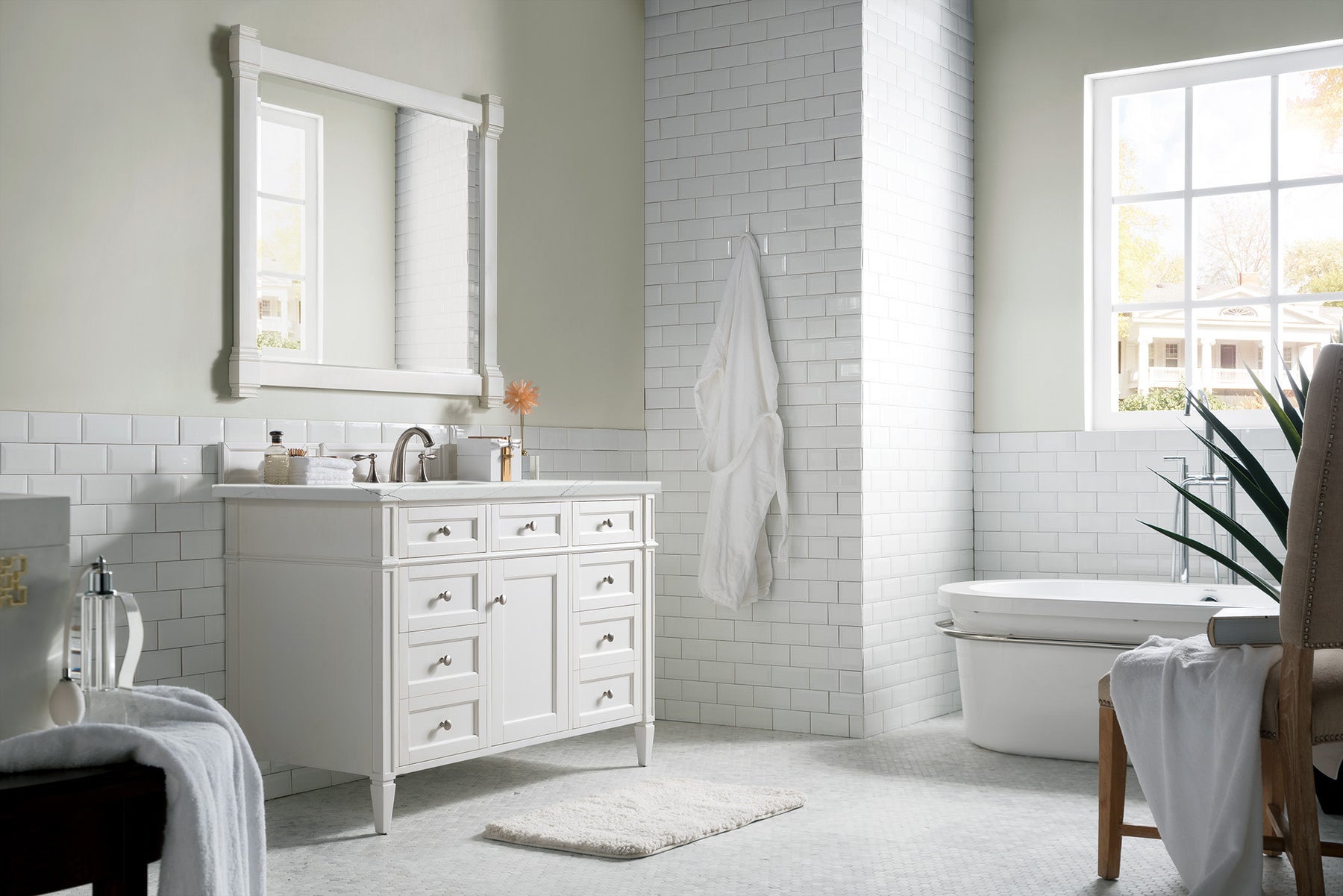 he Brittany 48" Bright White single vanity by James Martin Vanities features classic details that bridge both traditional and transitional styles. This beautiful piece of furniture includes one hide-away top row tip-out drawer, plus six full-depth drawers, two of which are double-height for storage of taller items. This cabinet also has one door, which conceals an interior shelf, for ample storage. Hand crafted in yellow poplar solids and yellow poplar veneers with Satin Nickel hardware. Matching wood backsplash is included. Completing the look is an Ethereal Noctis Silestone top by Cosentino, featuring modern, intricate black and gray nuances to add contrast and elegance to the white background.