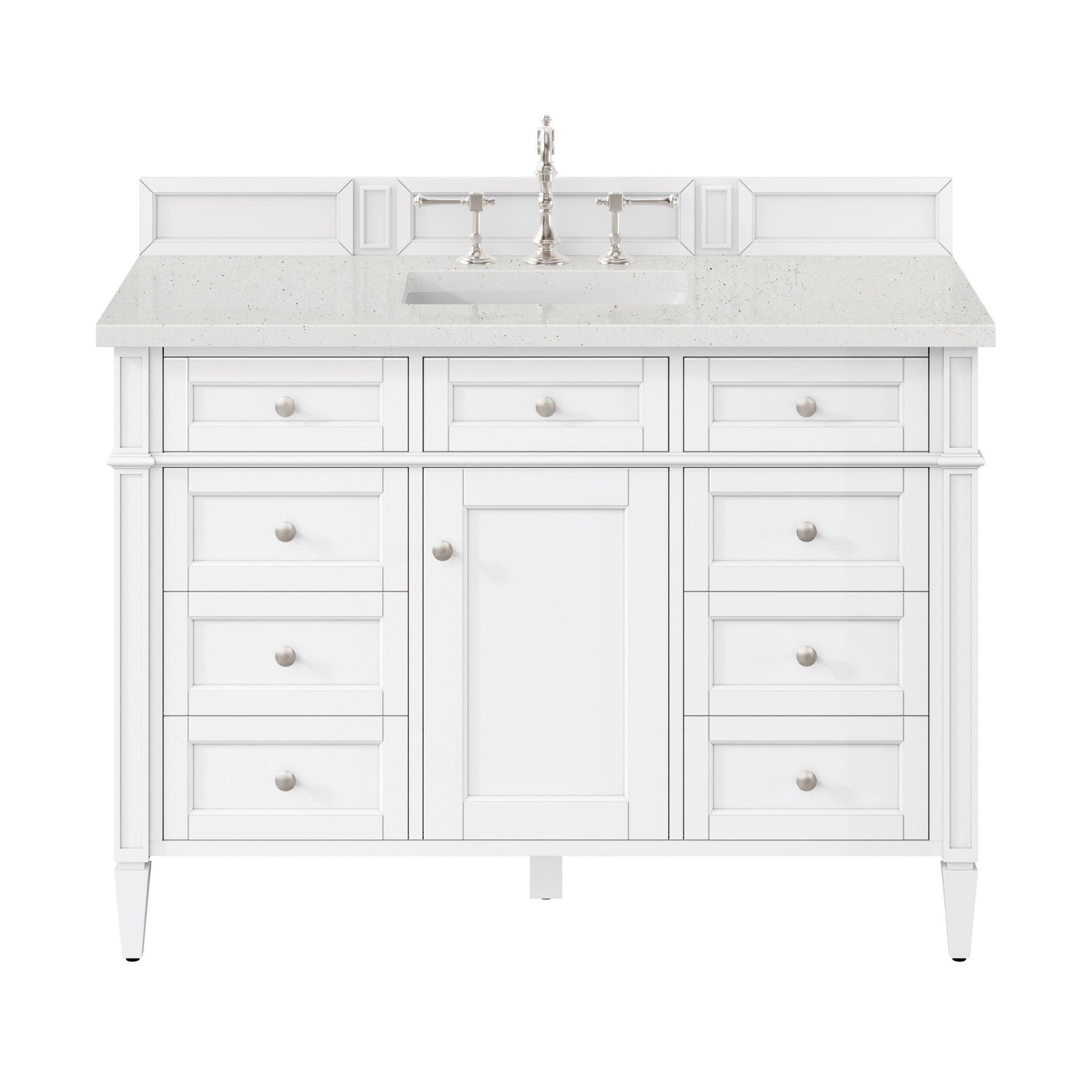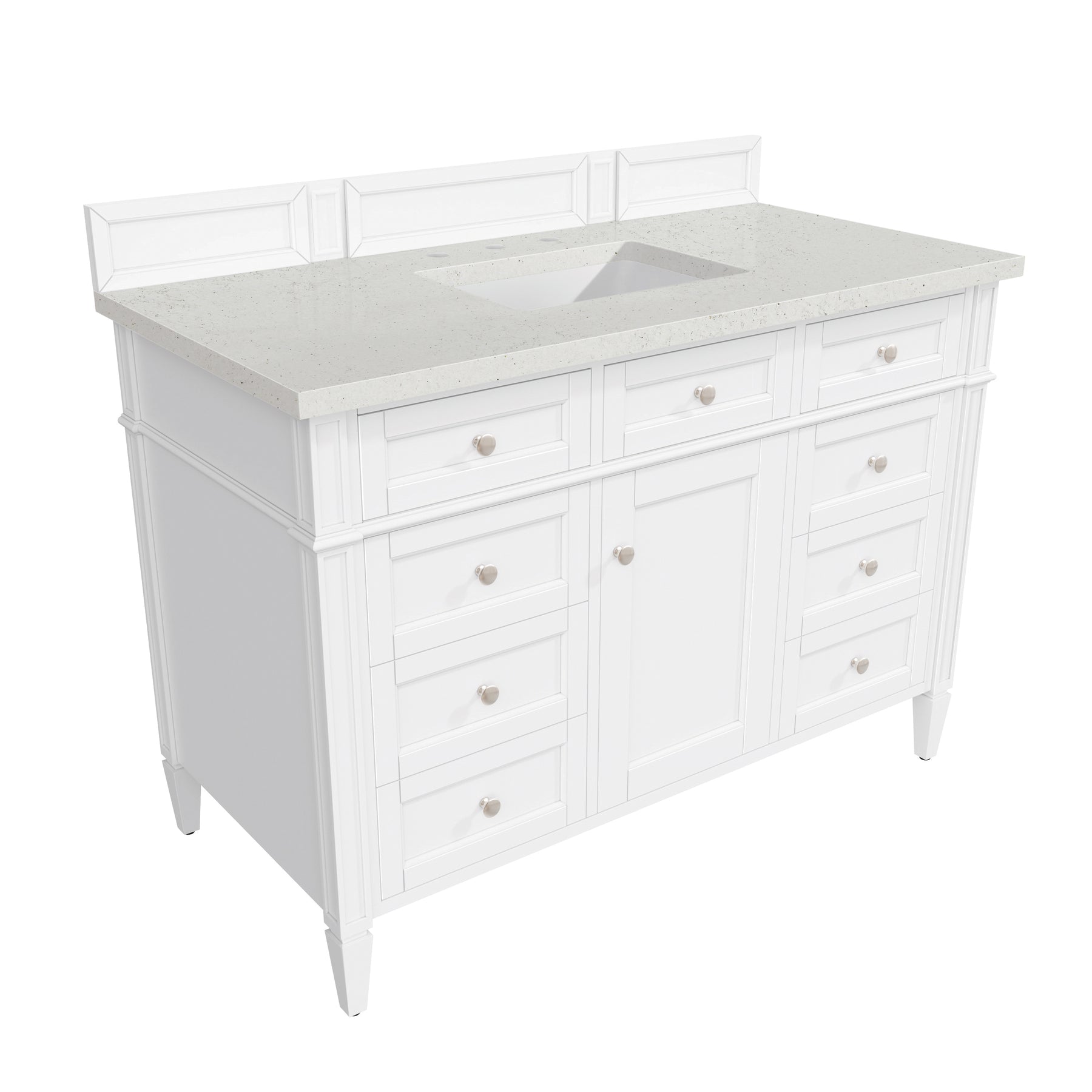 The Brittany 48" Bright White single vanity by James Martin Vanities features classic details that bridge both traditional and transitional styles. This beautiful piece of furniture includes one hide-away top row tip-out drawer, plus six full-depth drawers, two of which are double-height for storage of taller items. This cabinet also has one door, which conceals an interior shelf, for ample storage. Hand crafted in yellow Poplar solids and yellow Poplar veneers with Satin Nickel hardware. Matching wood backsplash is included. The Lime Delight Silestone top lends warm, textured beige tones to perfectly complement the finish on the vanity.