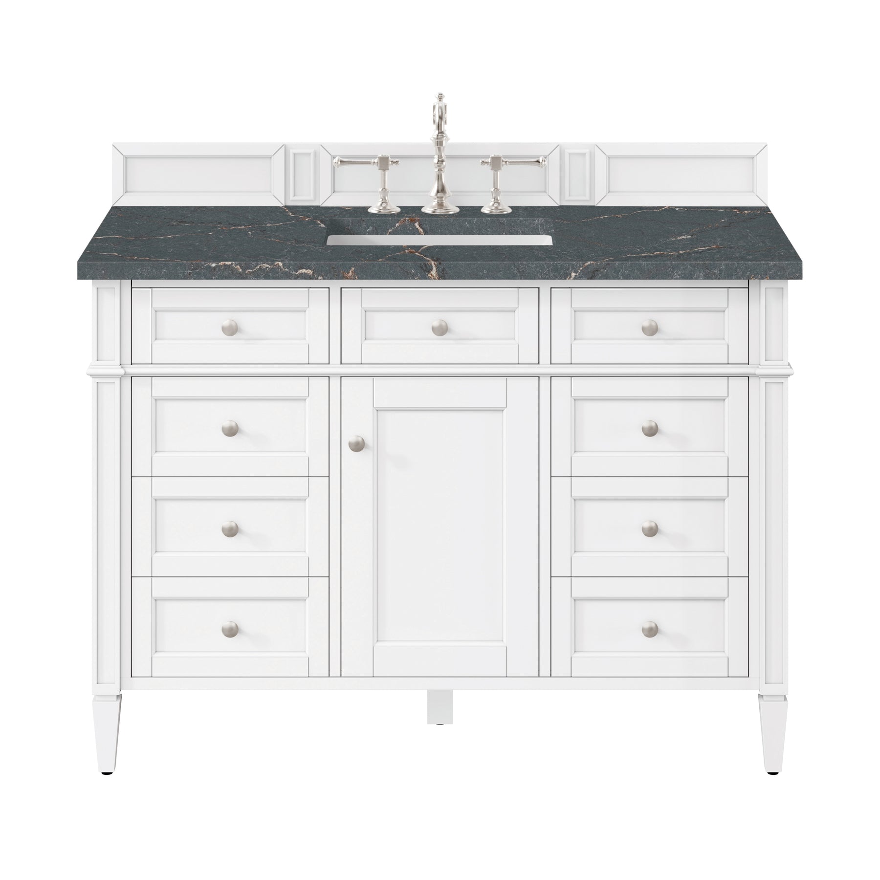 The Brittany 48" Bright White single vanity by James Martin Vanities features classic details that bridge both traditional and transitional styles. This beautiful piece of furniture includes one hide-away top row tip-out drawer, plus six full-depth drawers, two of which are double-height for storage of taller items. This cabinet also has one door, which conceals an interior shelf, for ample storage. Hand crafted in yellow Poplar solids and yellow Poplar veneers with Satin Nickel hardware. Matching wood backsplash is included. The finish and hardware accents are enhanced by the Parisien Bleu Silestone top, offering a deep bluish hue with broad and intricate neutral veins highlighted by fine coppery accents.