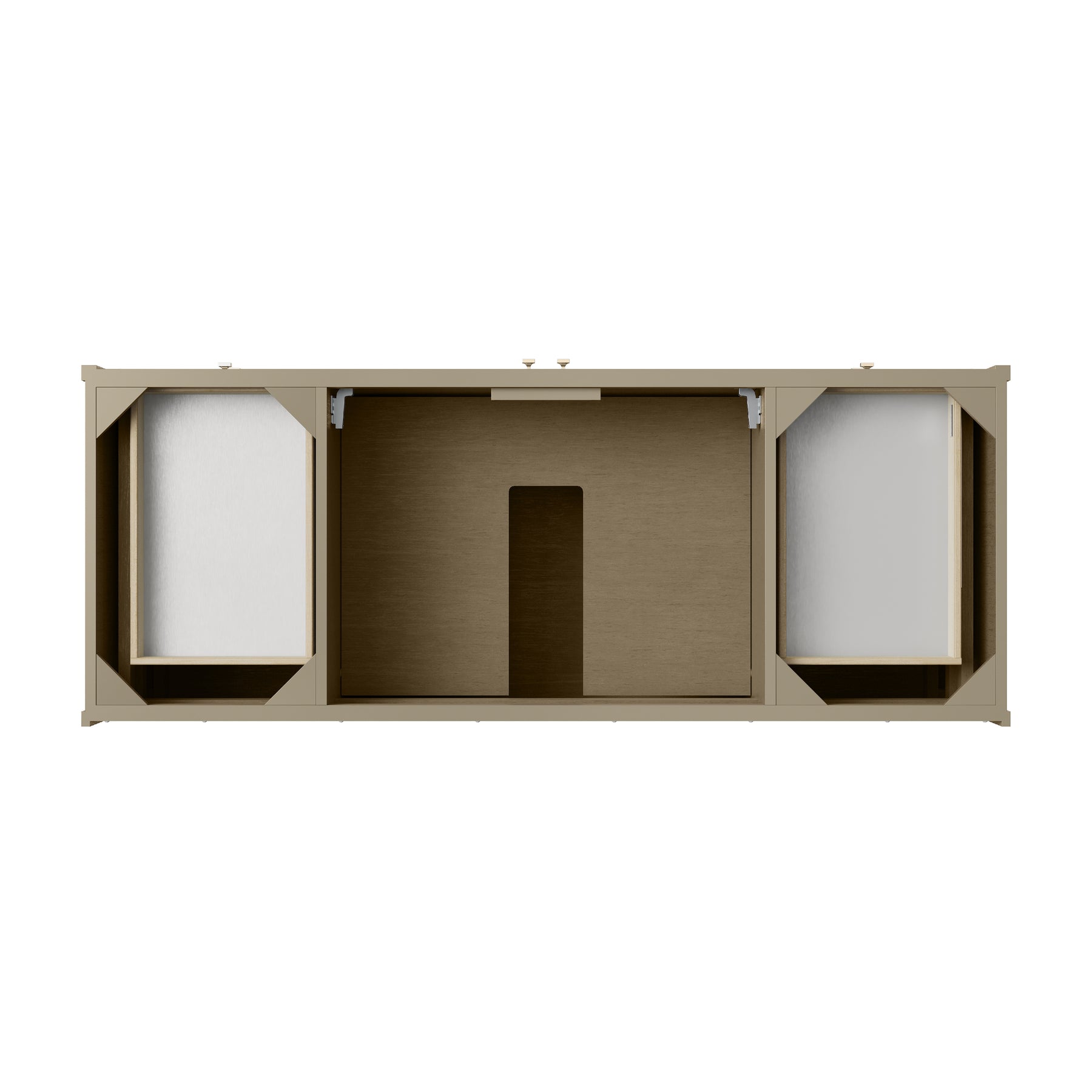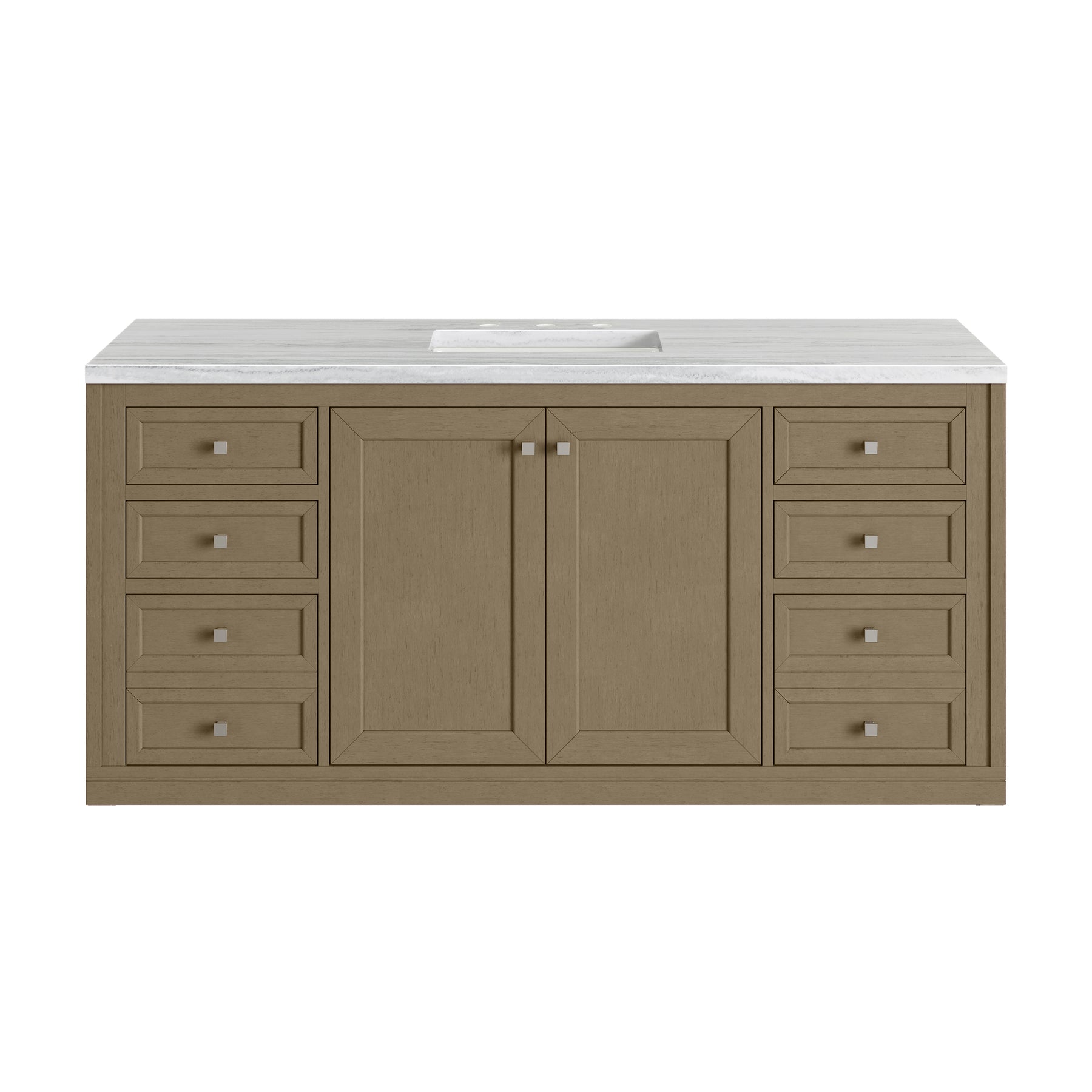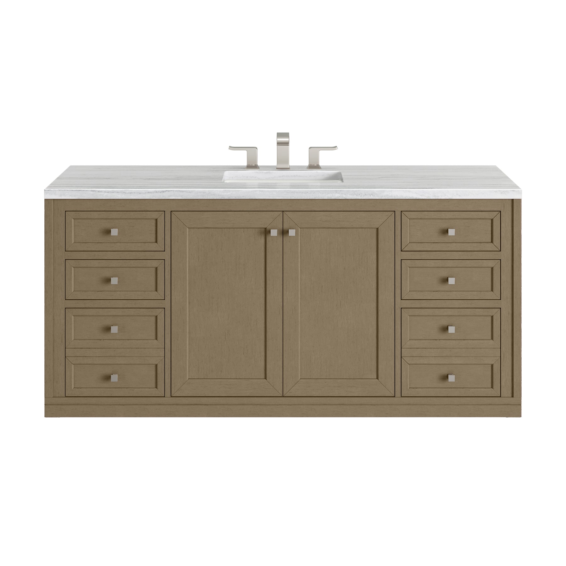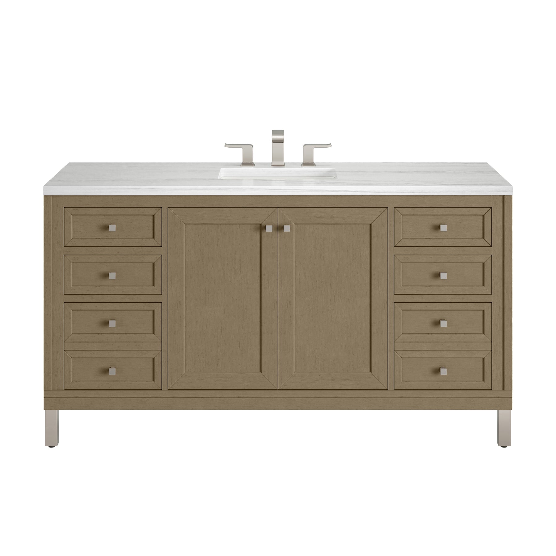 The sophisticated details and clean lines of the Chicago 60" Single Vanity by James Martin Vanities make it the perfect choice for any bathroom. Featuring a Walnut Whisper finish, this vanity offers ample storage with its double-door cabinet, adjustable interior shelves, and six drawers (four standard; two double-deep). Brushed Nickel knobs and legs add a contemporary touch; or choose to forego the metal legs for a modern wall-mounted installation. The addition of a modern Arctic Fall Solid Surface top with undermount sink completes the look.