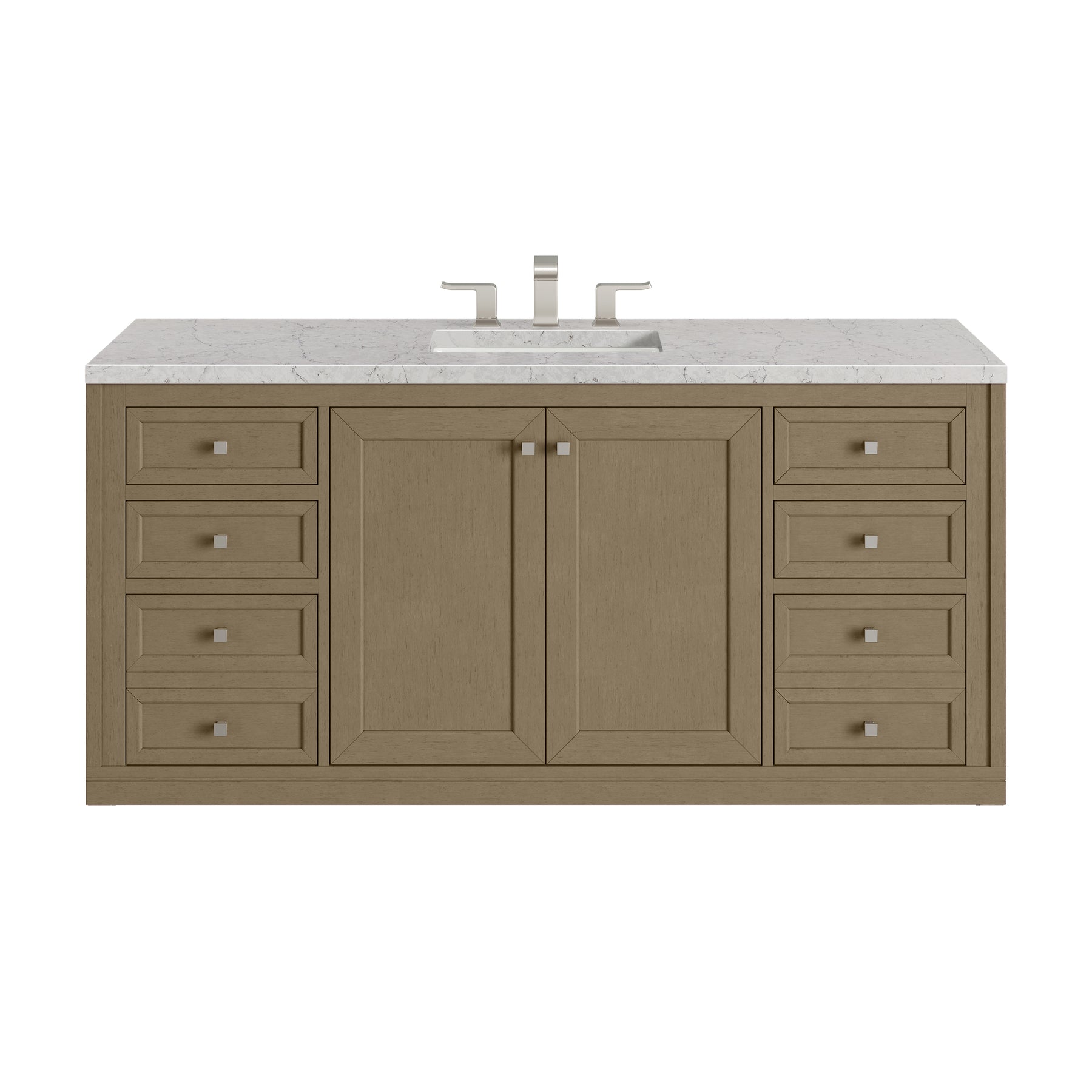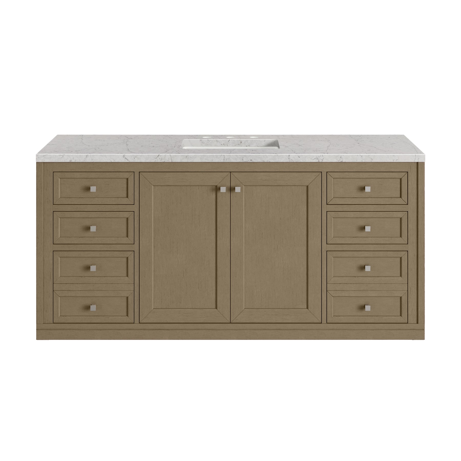 The sophisticated details and clean lines of the Chicago 60" Single Vanity by James Martin Vanities make it the perfect choice for any bathroom. Featuring a Walnut Whisper finish, this vanity offers ample storage with its double-door cabinet, adjustable interior shelves, and six drawers (four standard; two double-deep). Brushed Nickel knobs and legs add a contemporary touch; or choose to forego the metal legs for a modern wall-mounted installation. The addition of a beautiful Eternal Jasmine Pearl SilestoneĀ® top with undermount sink completes the look.