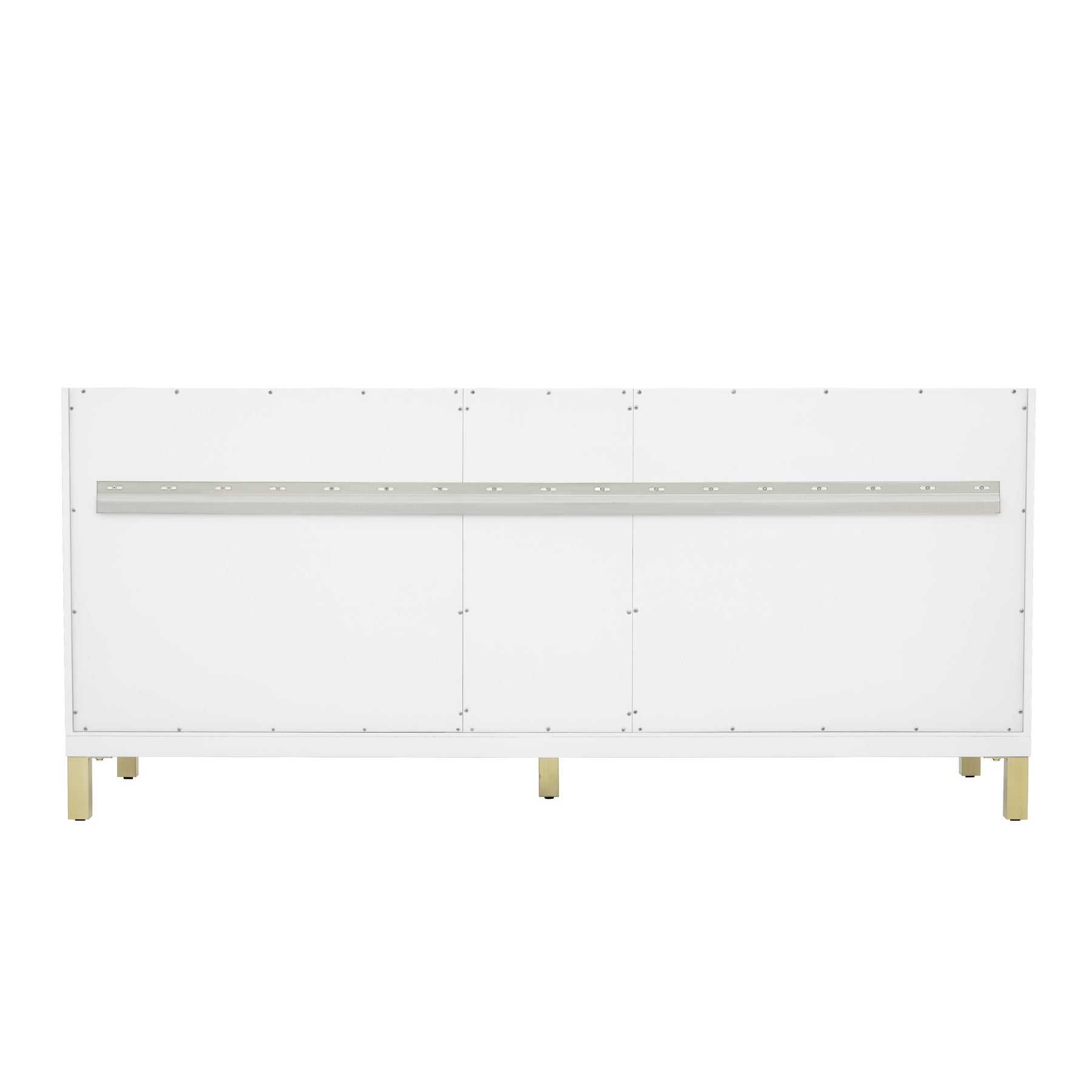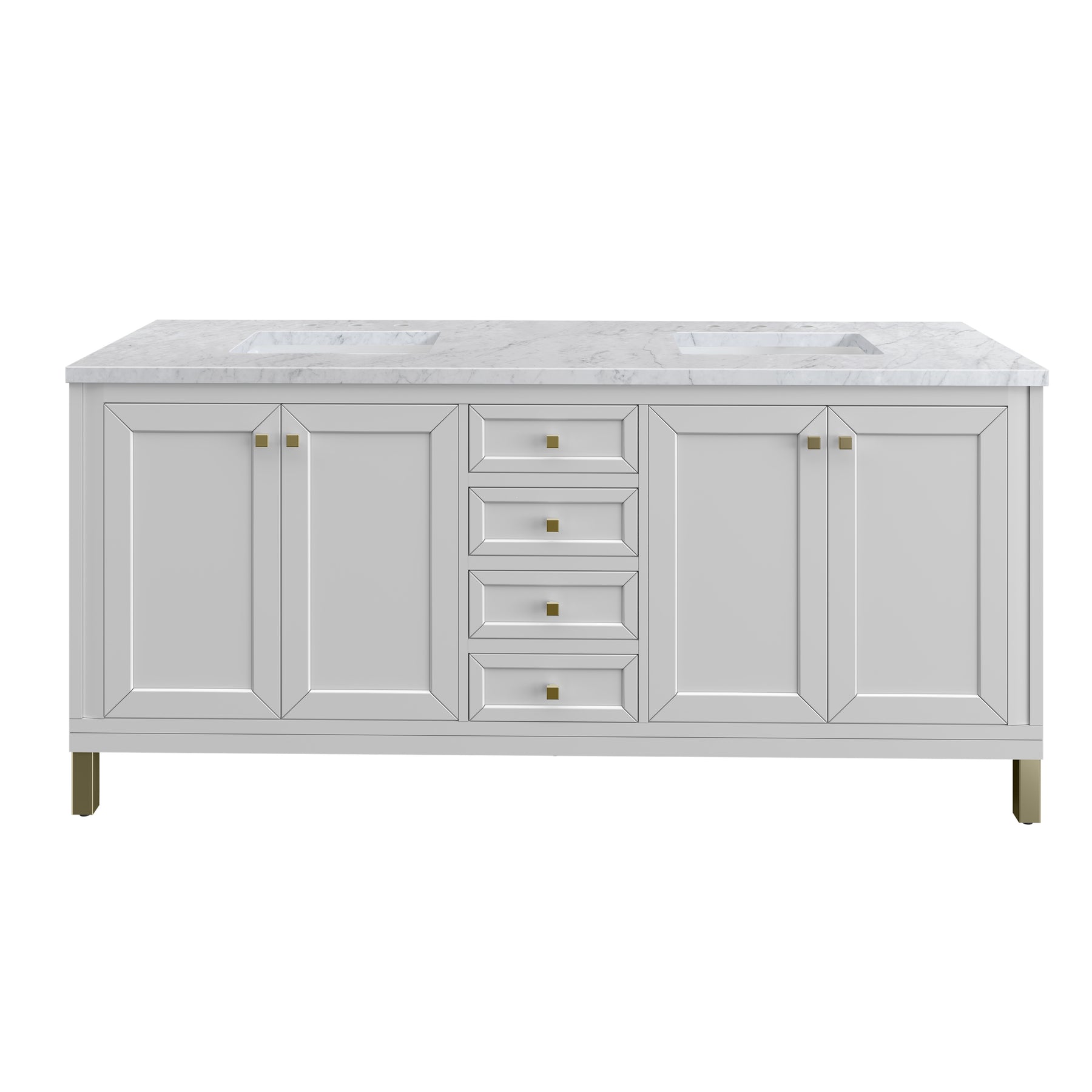 The sophisticated details and clean lines of the Chicago 72" Double Vanity by James Martin Vanities make it the perfect choice for any bathroom. Featuring a Glossy White finish, this vanity offers ample storage with its two double-door cabinets, adjustable interior shelves, and three drawers (two standard; one double-deep). Champagne Brass knobs and legs add a contemporary touch; or choose to forego the metal legs for a modern wall-mounted installation. The addition of a Carrara White Marble top with undermount sinks completes the look.