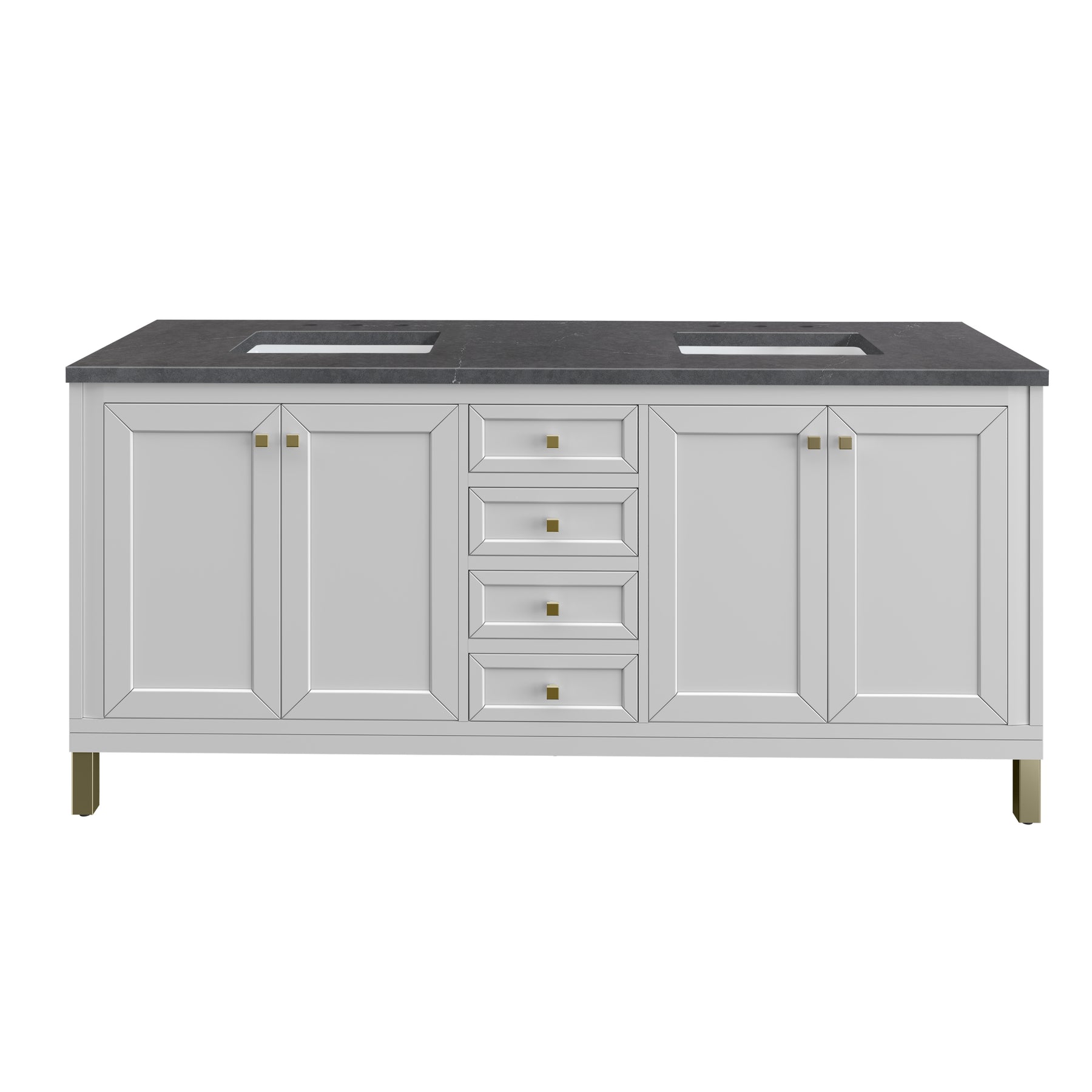 The sophisticated details and clean lines of the Chicago 72" Double Vanity by James Martin Vanities make it the perfect choice for any bathroom. Featuring a Glossy White finish, this vanity offers ample storage with its two double-door cabinets, adjustable interior shelves, and three drawers (two standard; one double-deep). Champagne Brass knobs and legs add a contemporary touch; or choose to forego the metal legs for a modern wall-mounted installation. The addition of a matte Charcoal Soapstone SilestoneĀ® top with undermount sinks completes the look.