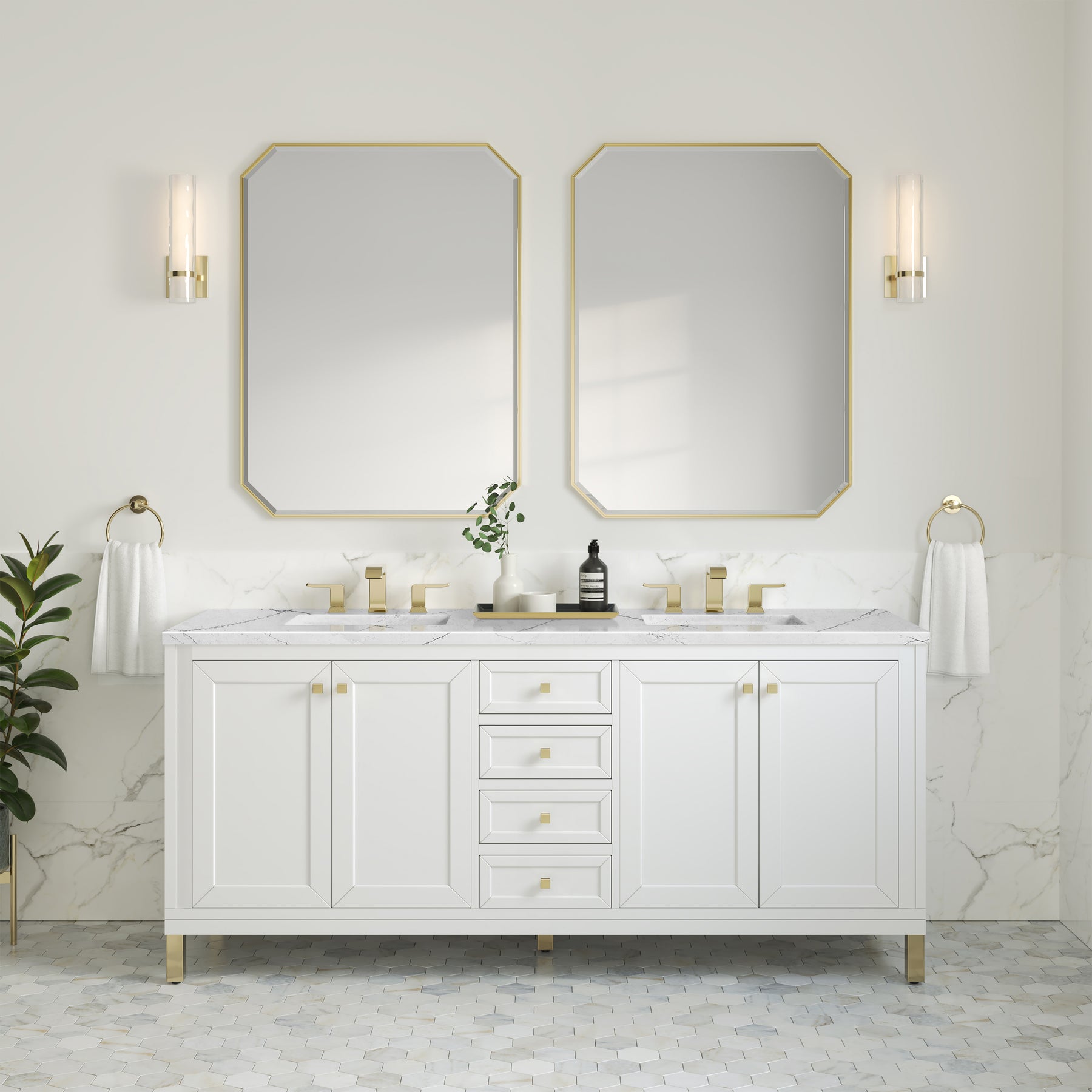 The sophisticated details and clean lines of the Chicago 72" Double Vanity by James Martin Vanities make it the perfect choice for any bathroom. Featuring a Glossy White finish, this vanity offers ample storage with its two double-door cabinets, adjustable interior shelves, and three drawers (two standard; one double-deep). Champagne Brass knobs and legs add a contemporary touch; or choose to forego the metal legs for a modern wall-mounted installation. The addition of a stunning Ethereal Noctis SilestoneĀ® top with undermount sinks completes the look.