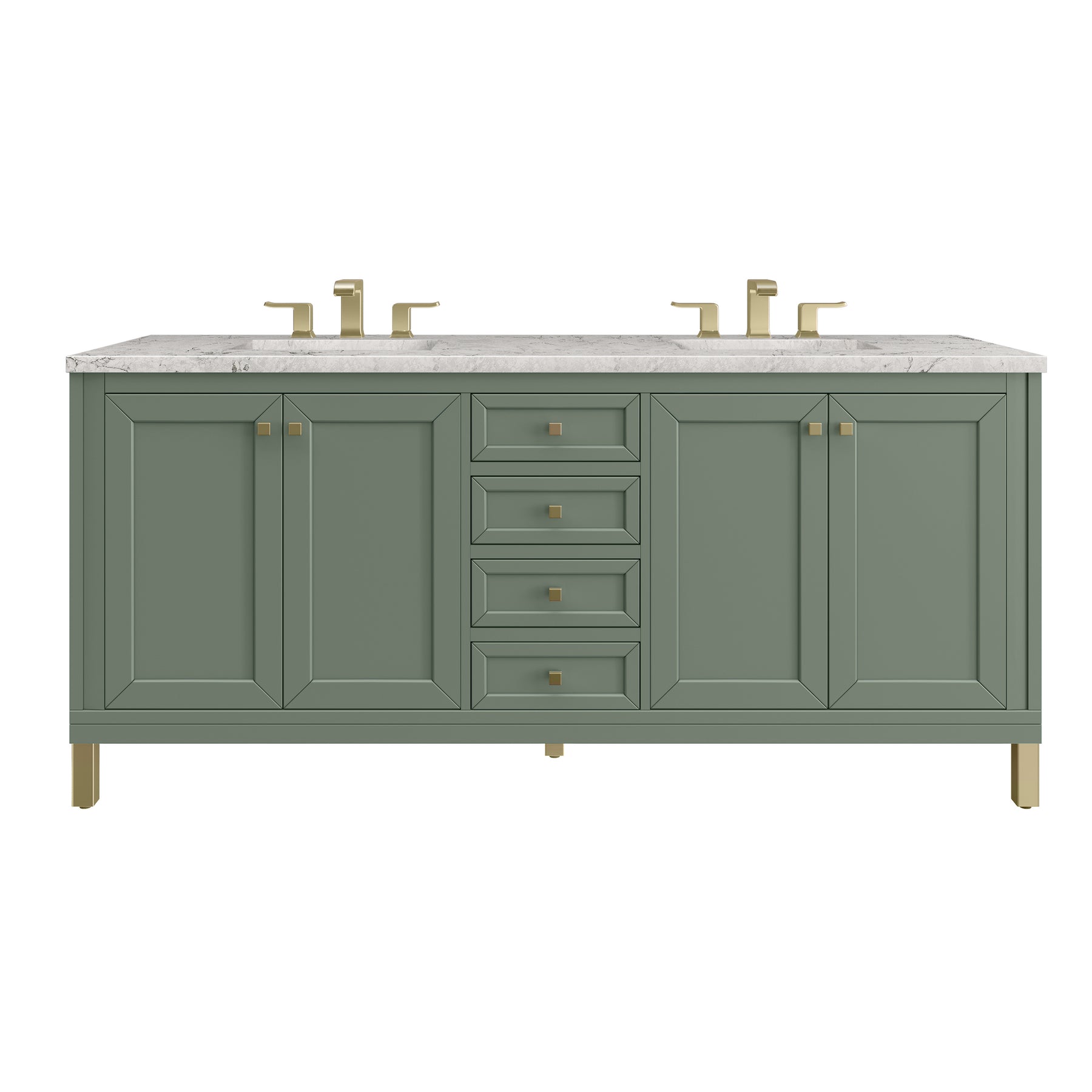 The sophisticated details and clean lines of the Chicago 72" Double Vanity by James Martin Vanities make it the perfect choice for any bathroom. Featuring a Smokey Celadon finish, this vanity offers ample storage with its two double-door cabinets, adjustable interior shelves, and three drawers (two standard; one double-deep). Champagne Brass knobs and legs add a contemporary touch; or choose to forego the metal legs for a modern wall-mounted installation. The addition of a beautiful Eternal Jasmine Pearl Silestone® top with undermount sinks completes the look.