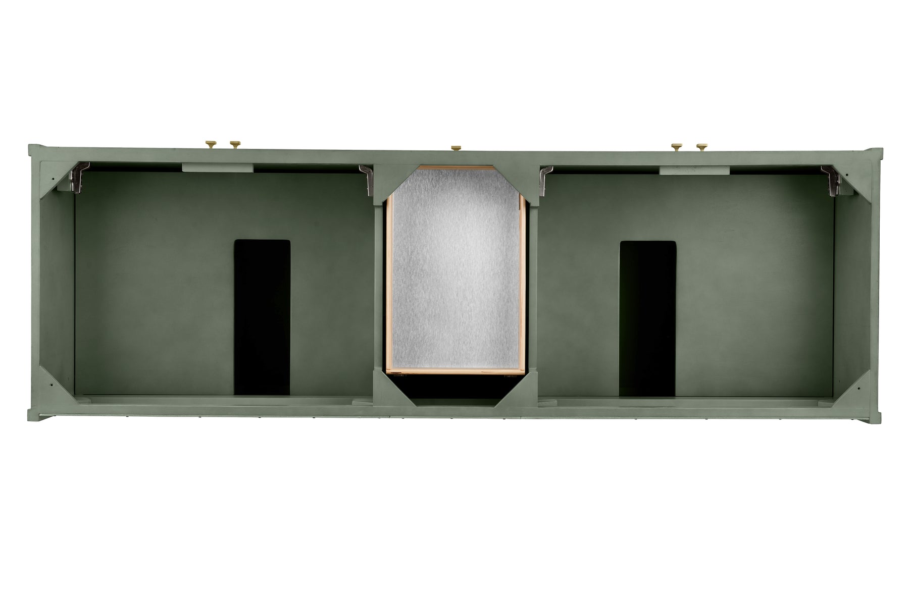 The sophisticated details and clean lines of the Chicago 72" Double Vanity by James Martin Vanities make it the perfect choice for any bathroom. Featuring a Smokey Celadon finish, this vanity offers ample storage with its two double-door cabinets, adjustable interior shelves, and three drawers (two standard; one double-deep). Champagne Brass knobs and legs add a contemporary touch; or choose to forego the metal legs for a modern wall-mounted installation. The addition of a classic White Zeus SilestoneĀ® top with undermount sinks completes the look.