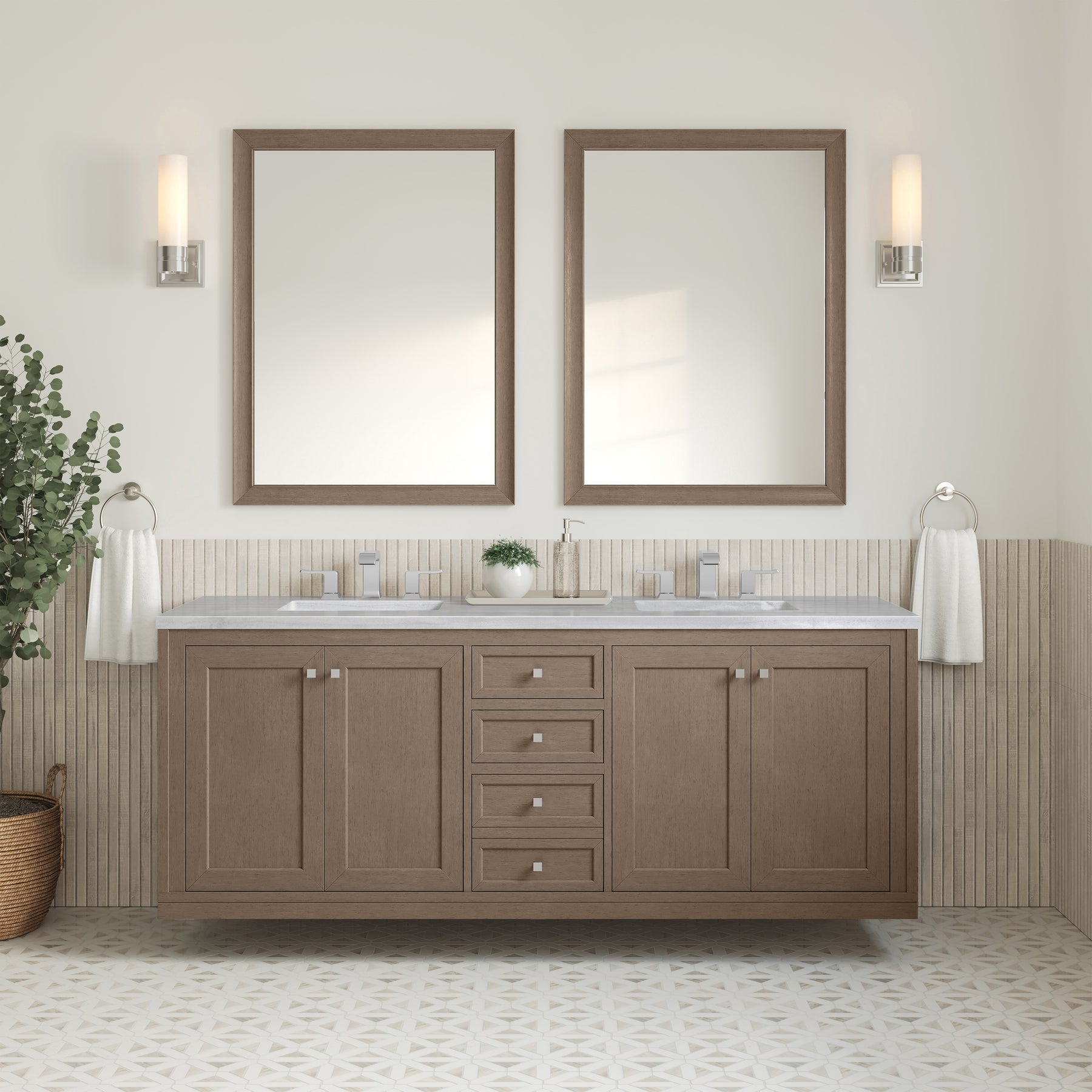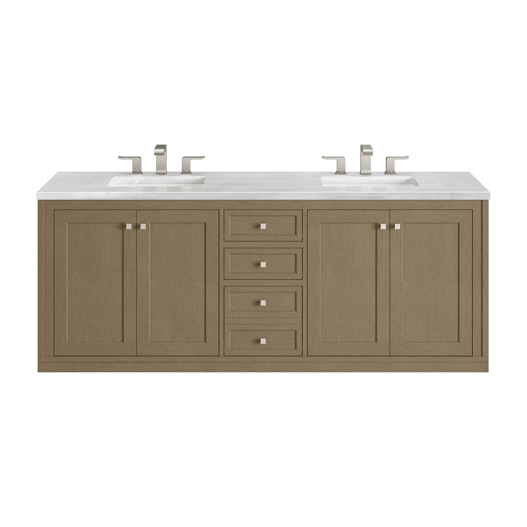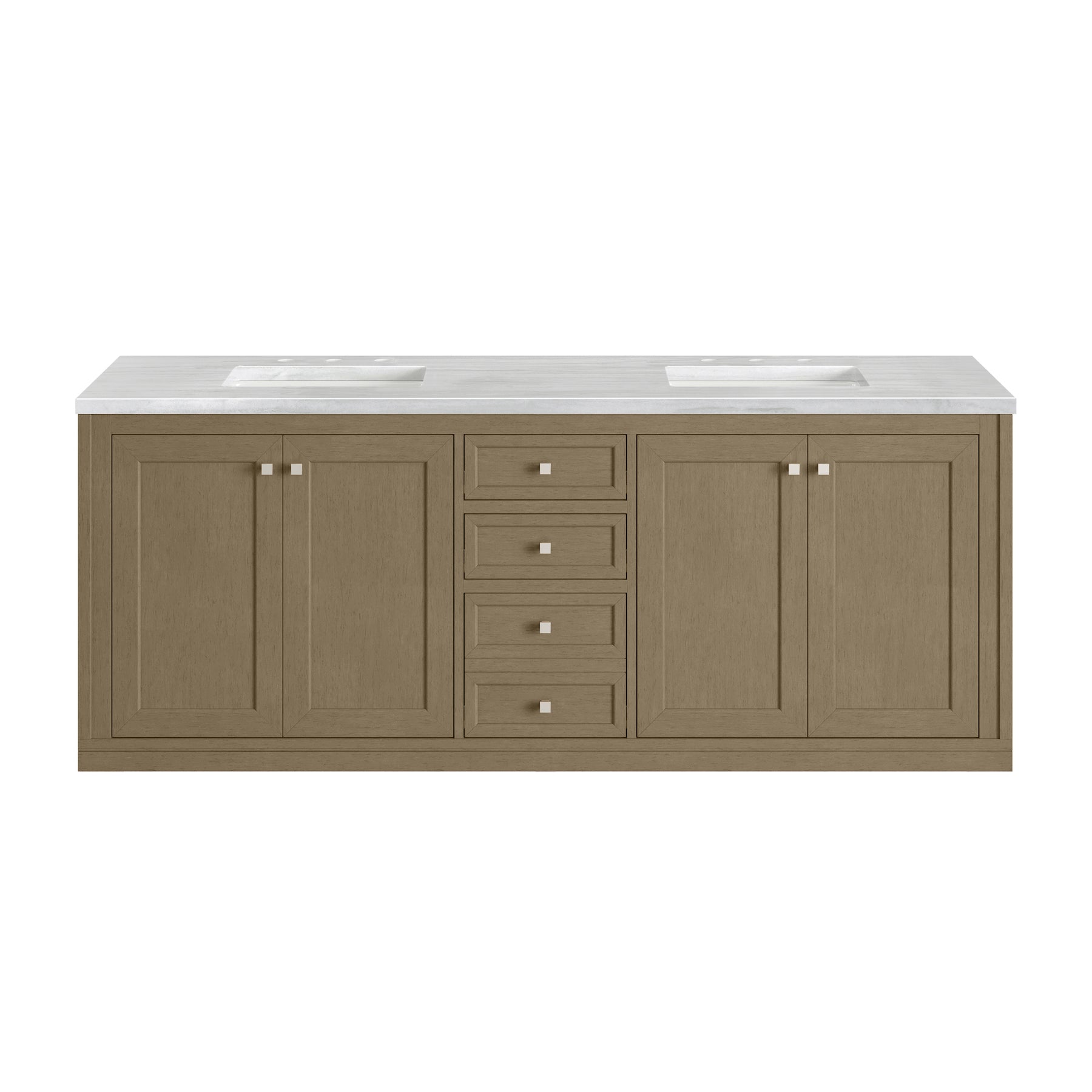 The sophisticated details and clean lines of the Chicago 72" Double Vanity by James Martin Vanities make it the perfect choice for any bathroom. Featuring a Walnut Whisper finish, this vanity offers ample storage with its two double-door cabinets, adjustable interior shelves, and three drawers (two standard; one double-deep). Brushed Nickel knobs and legs add a contemporary touch; or choose to forego the metal legs for a modern wall-mounted installation. The addition of a modern Arctic Fall Solid Surface top with undermount sinks completes the look.