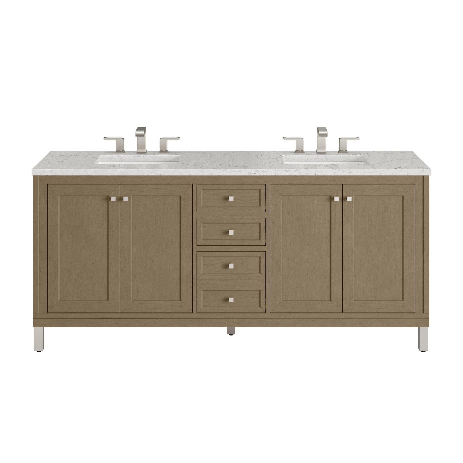 The sophisticated details and clean lines of the Chicago 72" Double Vanity by James Martin Vanities make it the perfect choice for any bathroom. Featuring a Walnut Whisper finish, this vanity offers ample storage with its two double-door cabinets, adjustable interior shelves, and three drawers (two standard; one double-deep). Brushed Nickel knobs and legs add a contemporary touch; or choose to forego the metal legs for a modern wall-mounted installation. The addition of a beautiful Eternal Jasmine Pearl Silestone® top with undermount sinks completes the look.