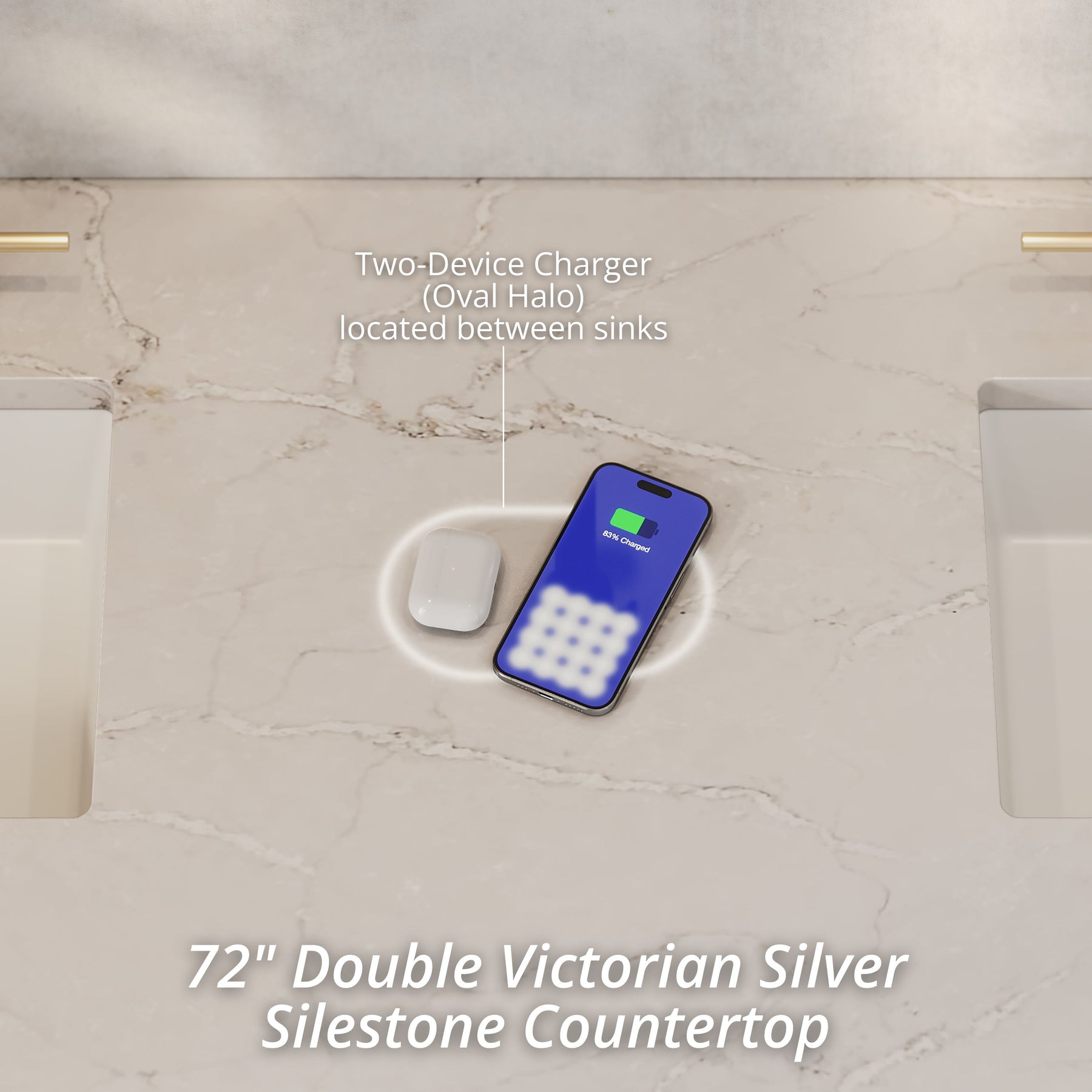 This unit is enabled with FreePower wireless charging; featuring a two-device charger seamlessly embedded into the countertop, indicated by a light-up halo in between the sinks. Designed for modern living, FreePower offers convenient, integrated, wireless charging when and where you need it.