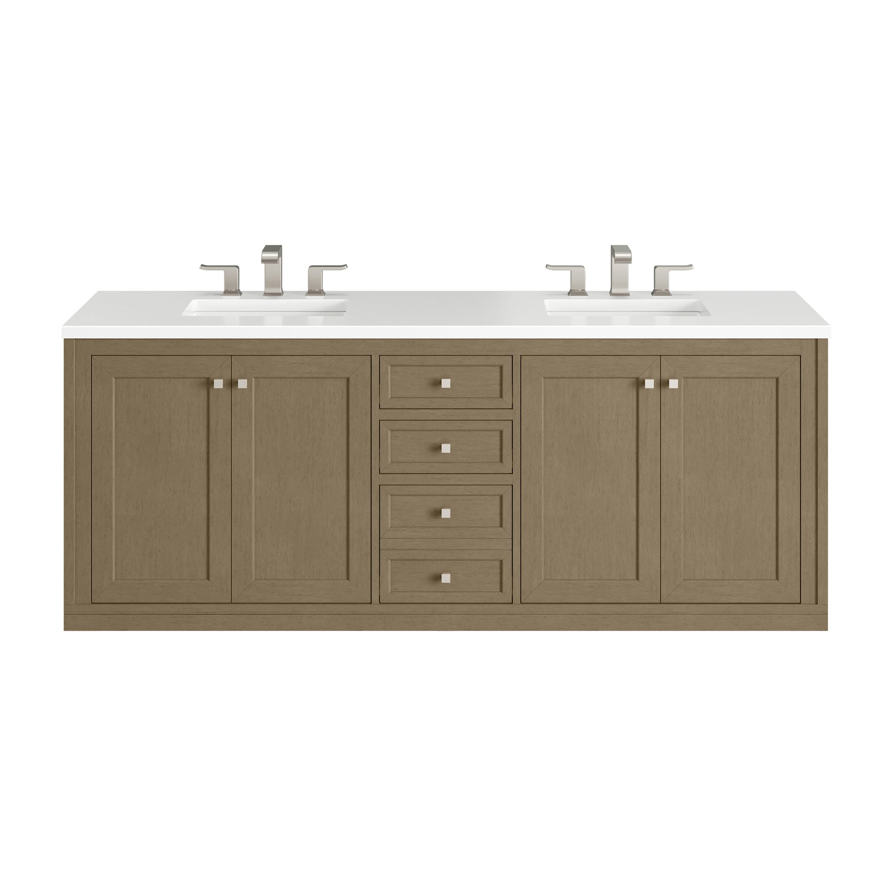 The sophisticated details and clean lines of the Chicago 72" Double Vanity by James Martin Vanities make it the perfect choice for any bathroom. Featuring a Walnut Whisper finish, this vanity offers ample storage with its two double-door cabinets, adjustable interior shelves, and three drawers (two standard; one double-deep). Brushed Nickel knobs and legs add a contemporary touch; or choose to forego the metal legs for a modern wall-mounted installation. The addition of a classic White Zeus SilestoneĀ® top with undermount sinks completes the look.