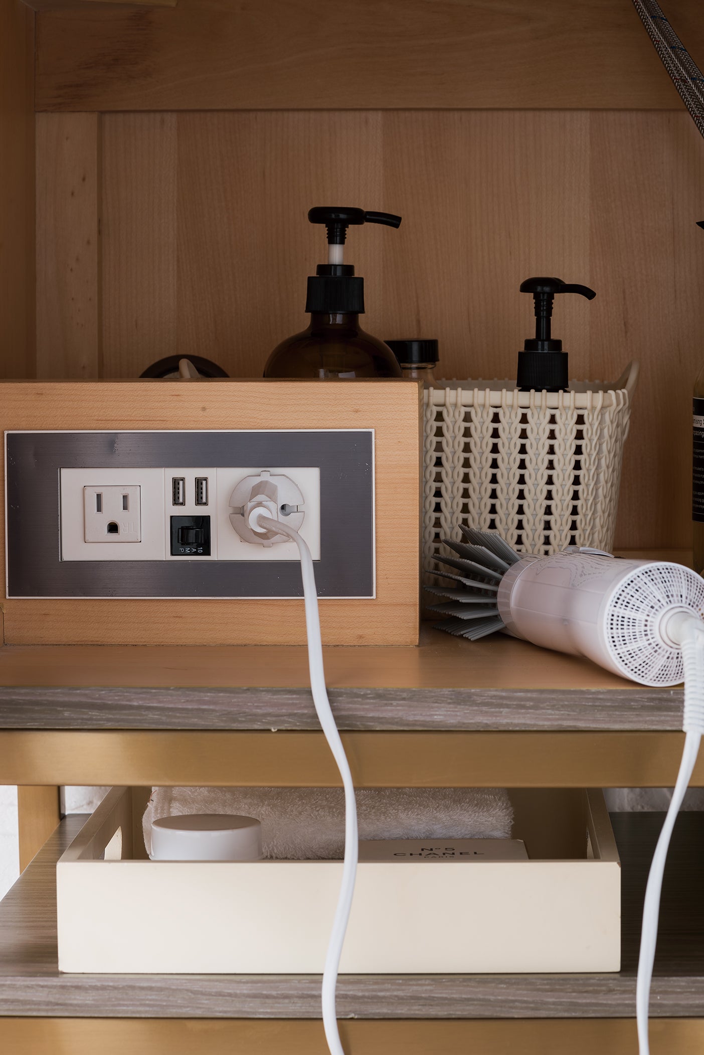 The Columbia 36" Ash Gray Single Vanity offers maximum storage with one soft-closing door, three soft-closing drawers, and lower shelf space. This cabinet includes premium features such as one solid bamboo drawer organizer and one 120 Volt UL Rated electrical component with two electrical and two USB outlets. The Matte Black finished base coordinates with the pulls. Glossy White Composite Stone countertop with integrated left side offset sink.