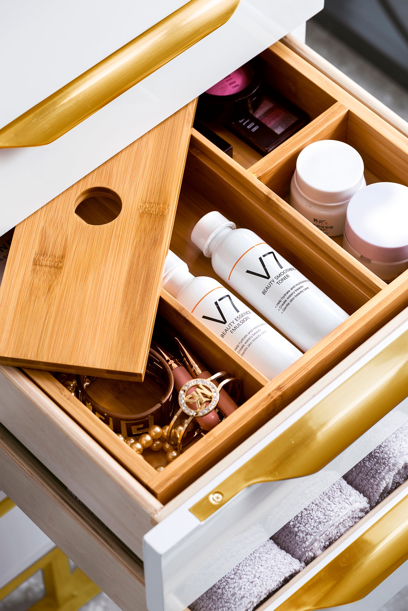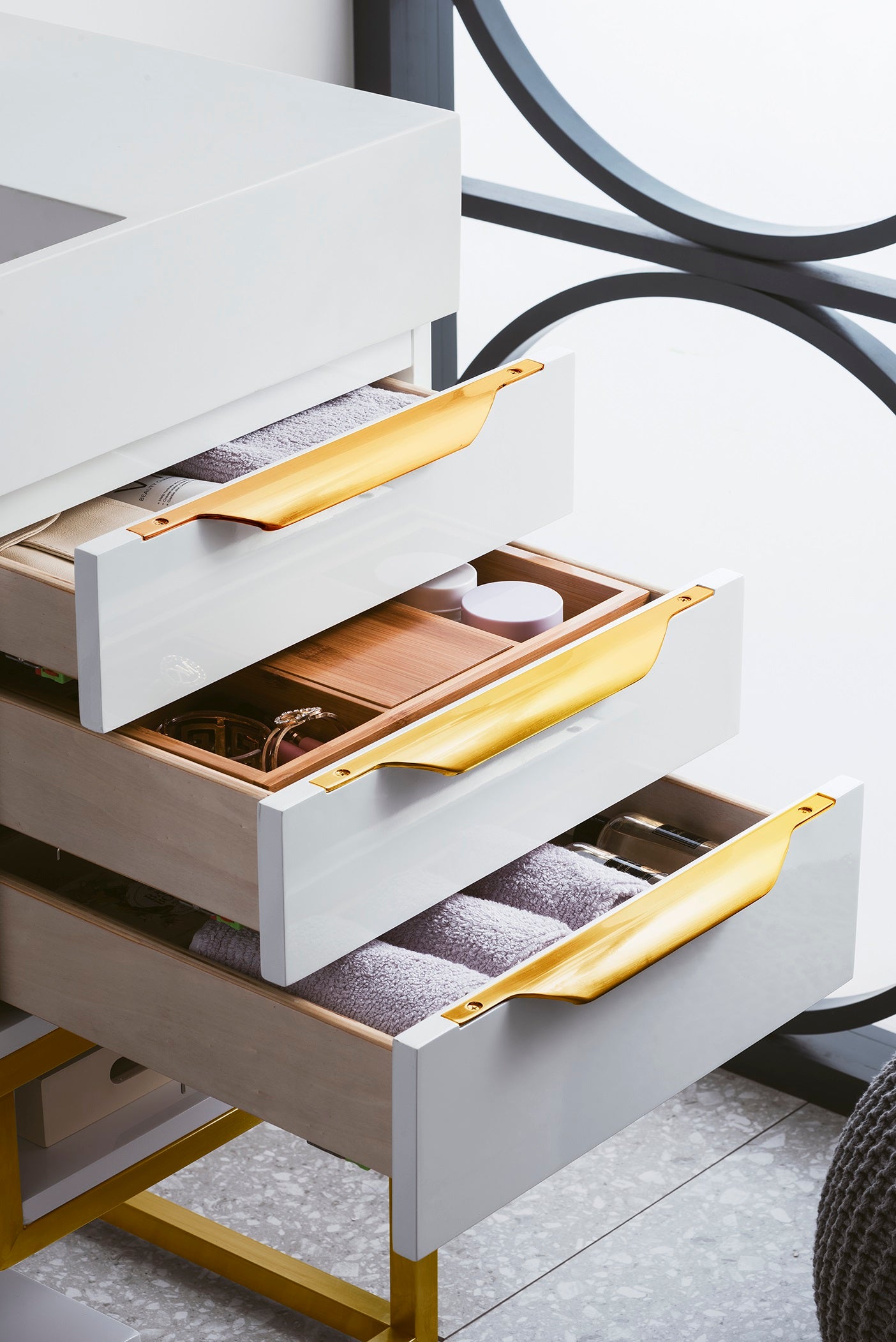 The Columbia 36" Glossy White Single Vanity offers maximum storage with one soft-closing door, three soft-closing drawers, and lower shelf space. This cabinet includes premium features such as one solid bamboo drawer organizer and one 120 Volt UL Rated electrical component with two electrical and two USB outlets. The Radiant Gold finished base coordinates with the pulls. Glossy White Composite Stone countertop with integrated left side offset sink.