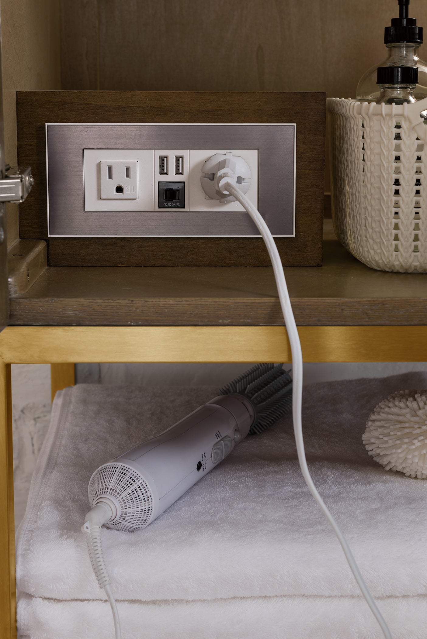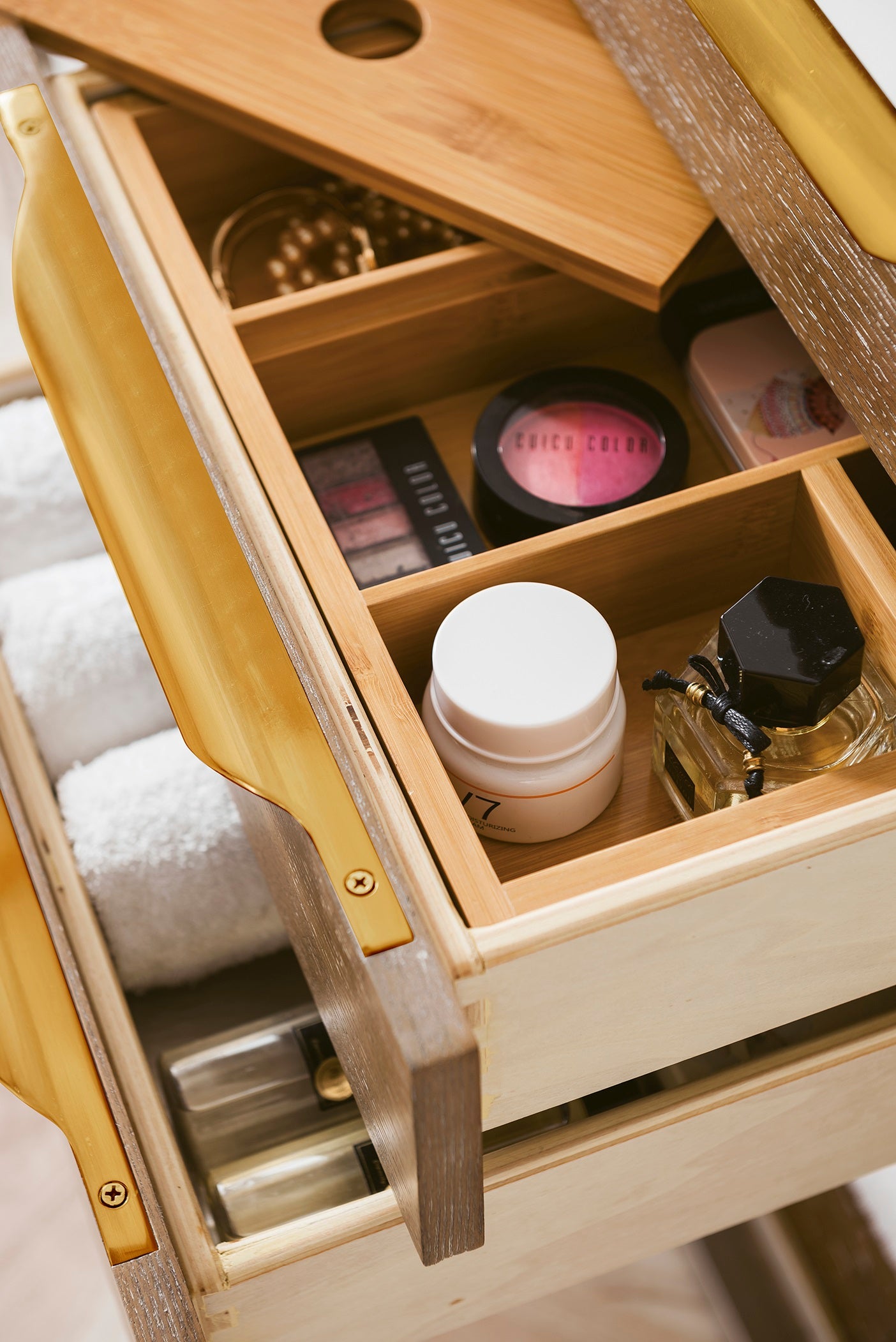 The Columbia 36" Latte Oak Single Vanity offers maximum storage with one soft-closing door, three soft-closing drawers, and lower shelf space. This cabinet includes premium features such as one solid bamboo drawer organizer and one 120 Volt UL Rated electrical component with two electrical and two USB outlets. The Radiant Gold finished base coordinates with the pulls. Glossy White Composite Stone countertop with integrated left side offset sink.