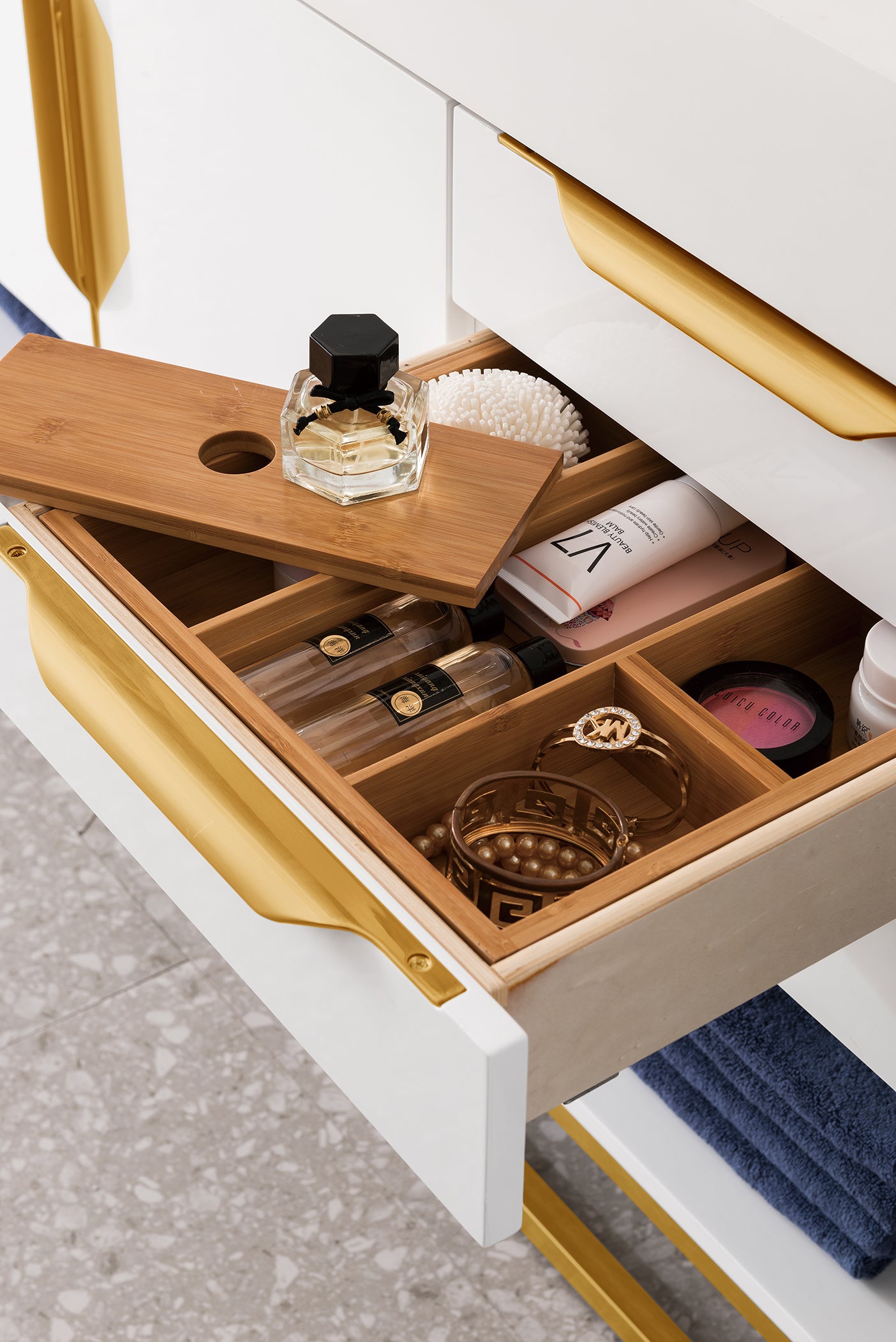 The Columbia 48" Glossy White Single Vanity offers maximum storage with two soft-closing doors, three soft-closing drawers, and lower shelf space. This cabinet includes premium features such as one solid bamboo drawer organizer and one 120 Volt UL Rated electrical component with two electrical and two USB outlets. The Radiant Gold finished base coordinates with the pulls. Glossy White Composite Stone countertop with integrated sink included.