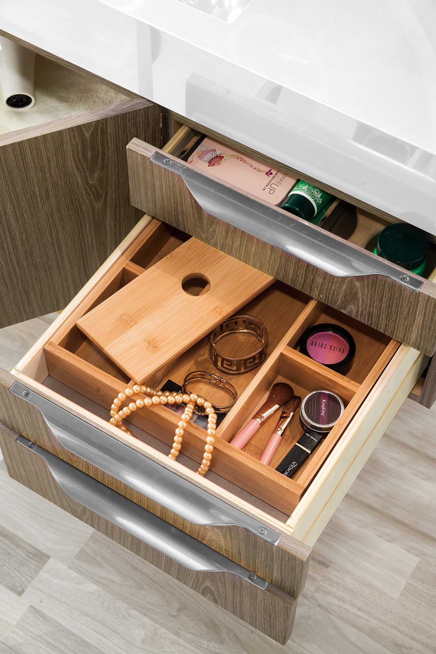 The Columbia 48" Ash Gray Single Vanity offers maximum storage with two soft-closing doors and three soft-closing drawers. This cabinet includes premium features such as one solid bamboo drawer organizer and one 120 Volt UL Rated electrical component with two electrical and two USB outlets. Cabinet includes Brushed Nickel door and drawer pulls. Glossy White Composite Stone countertop with integrated sink included. This wall-mounted vanity includes heavy duty mounting brackets to create a modern look.
