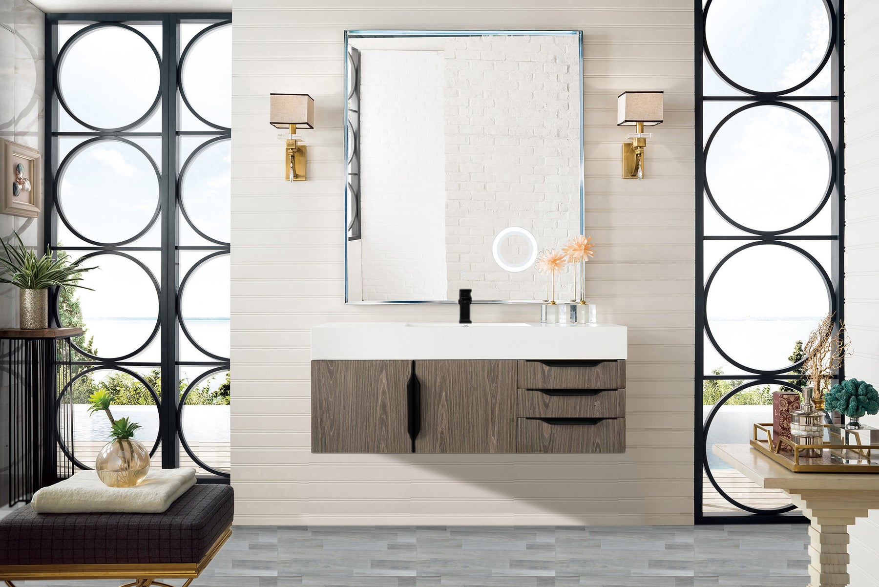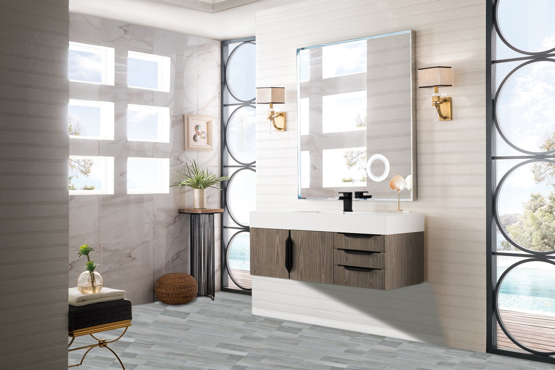 The Columbia 48" Ash Gray Single Vanity offers maximum storage with two soft-closing doors and three soft-closing drawers. This cabinet includes premium features such as one solid bamboo drawer organizer and one 120 Volt UL Rated electrical component with two electrical and two USB outlets. Cabinet includes Matte Black door and drawer pulls. Glossy White Composite Stone countertop with integrated sink included. This wall-mounted vanity includes heavy duty mounting brackets to create a modern look.