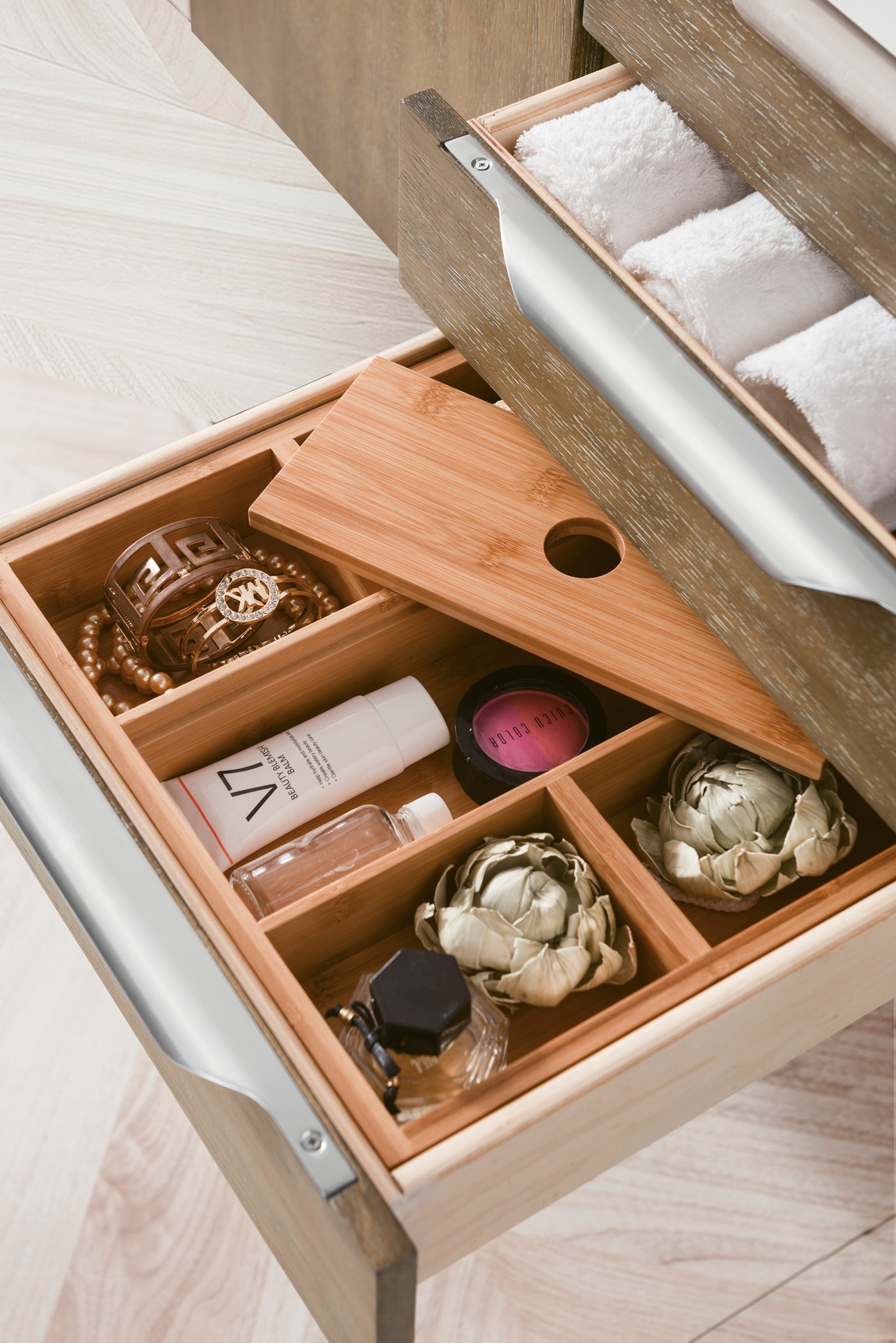 The Columbia 48" Latte Oak Single Vanity offers maximum storage with two soft-closing doors and three soft-closing drawers. This cabinet includes premium features such as one solid bamboo drawer organizer and one 120 Volt UL Rated electrical component with two electrical and two USB outlets. Cabinet includes Brushed Nickel door and drawer pulls. Glossy White Composite Stone countertop with integrated sink included. This wall-mounted vanity includes heavy duty mounting brackets to create a modern look.