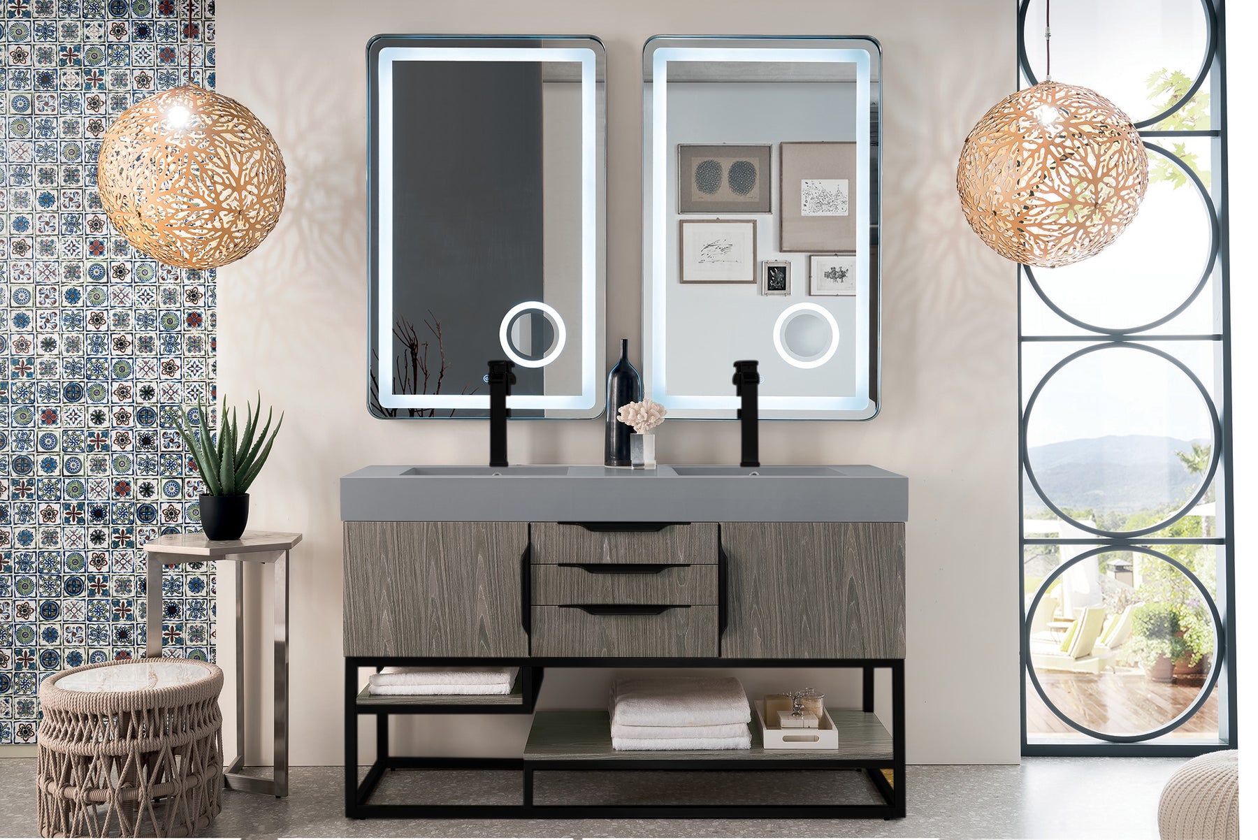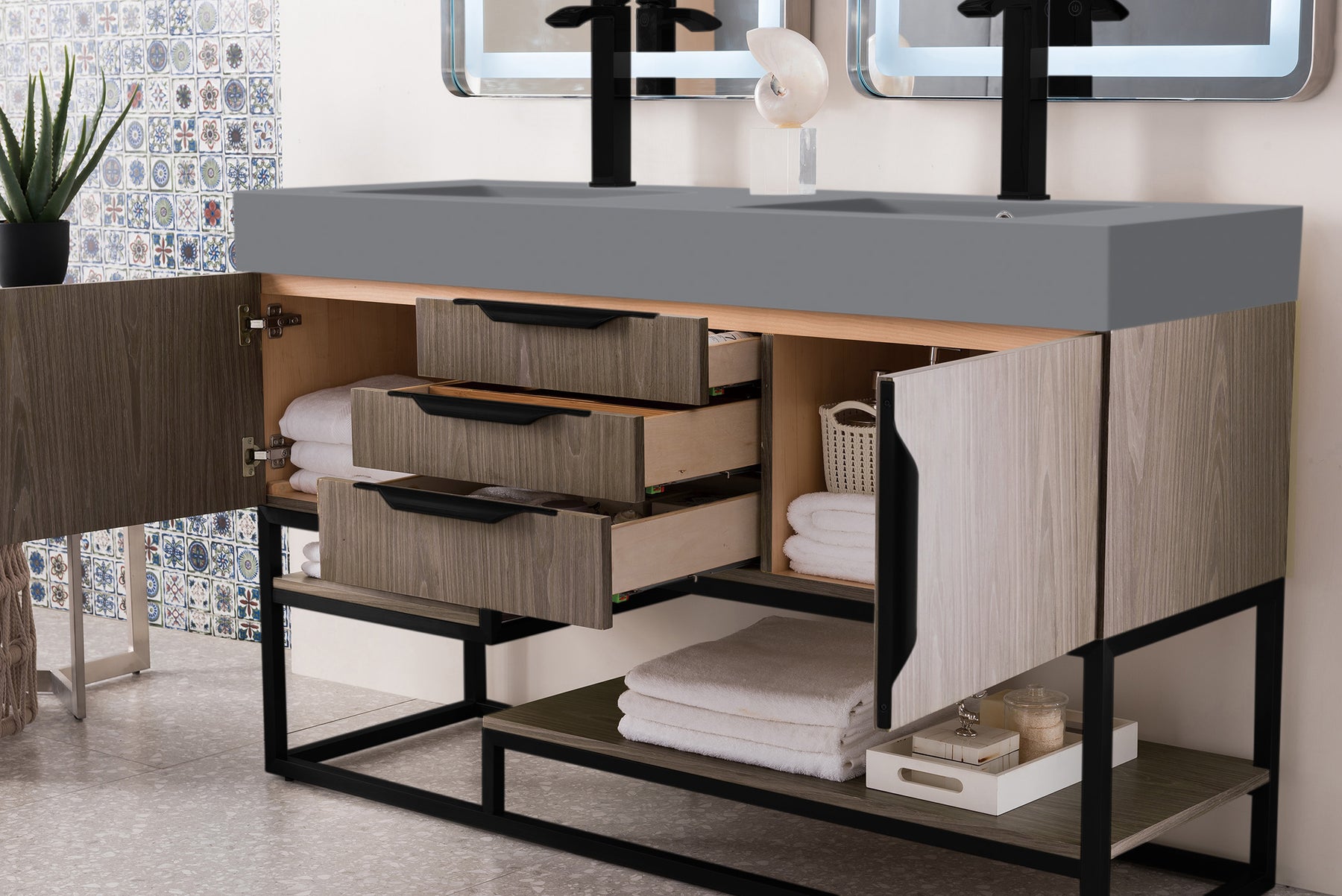 The Columbia 59" Ash Gray Double Vanity offers maximum storage with two soft-closing doors, three soft-closing drawers, and lower shelf space. This cabinet includes premium features such as one solid bamboo drawer organizer and one 120 Volt UL Rated electrical component with two electrical and two USB outlets. The Matte Black finished base coordinates with the pulls. Dusk Grey Glossy Composite Stone countertop with integrated sink included.