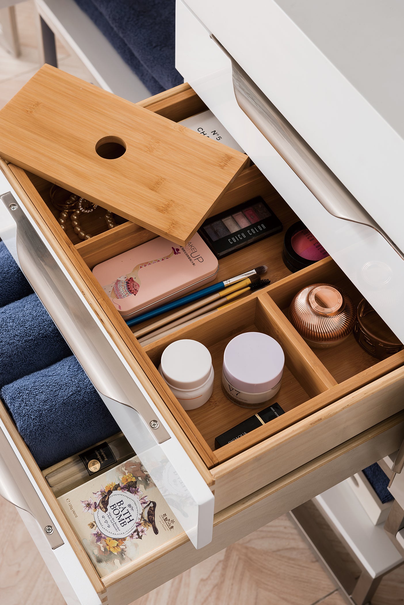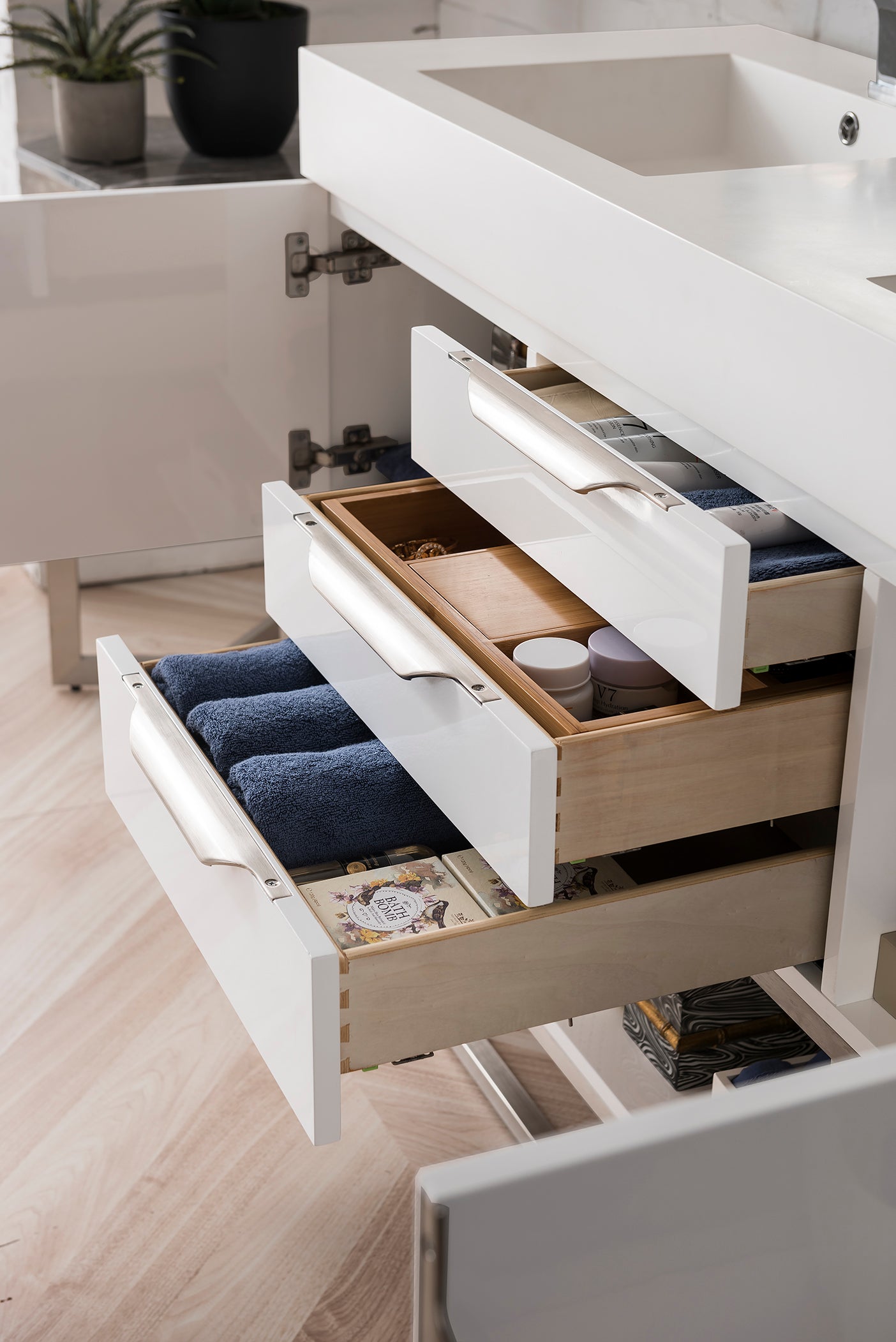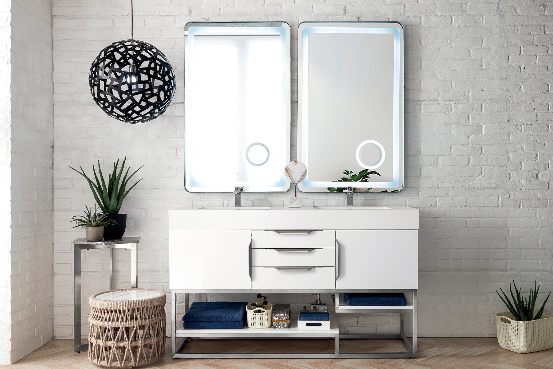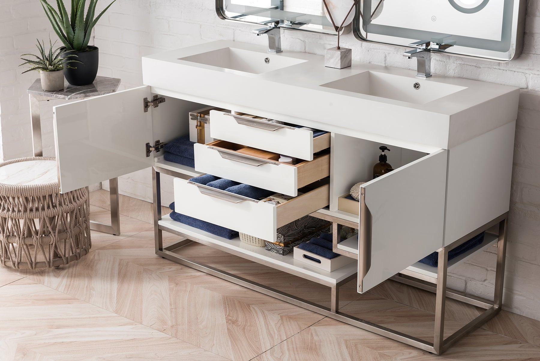 The Columbia 59" Glossy White Double Vanity offers maximum storage with two soft-closing doors, three soft-closing drawers, and lower shelf space. This cabinet includes premium features such as one solid bamboo drawer organizer and one 120 Volt UL Rated electrical component with two electrical and two USB outlets. The Brushed Nickel finished base coordinates with the pulls. Glossy White Composite Stone countertop with integrated sink included.