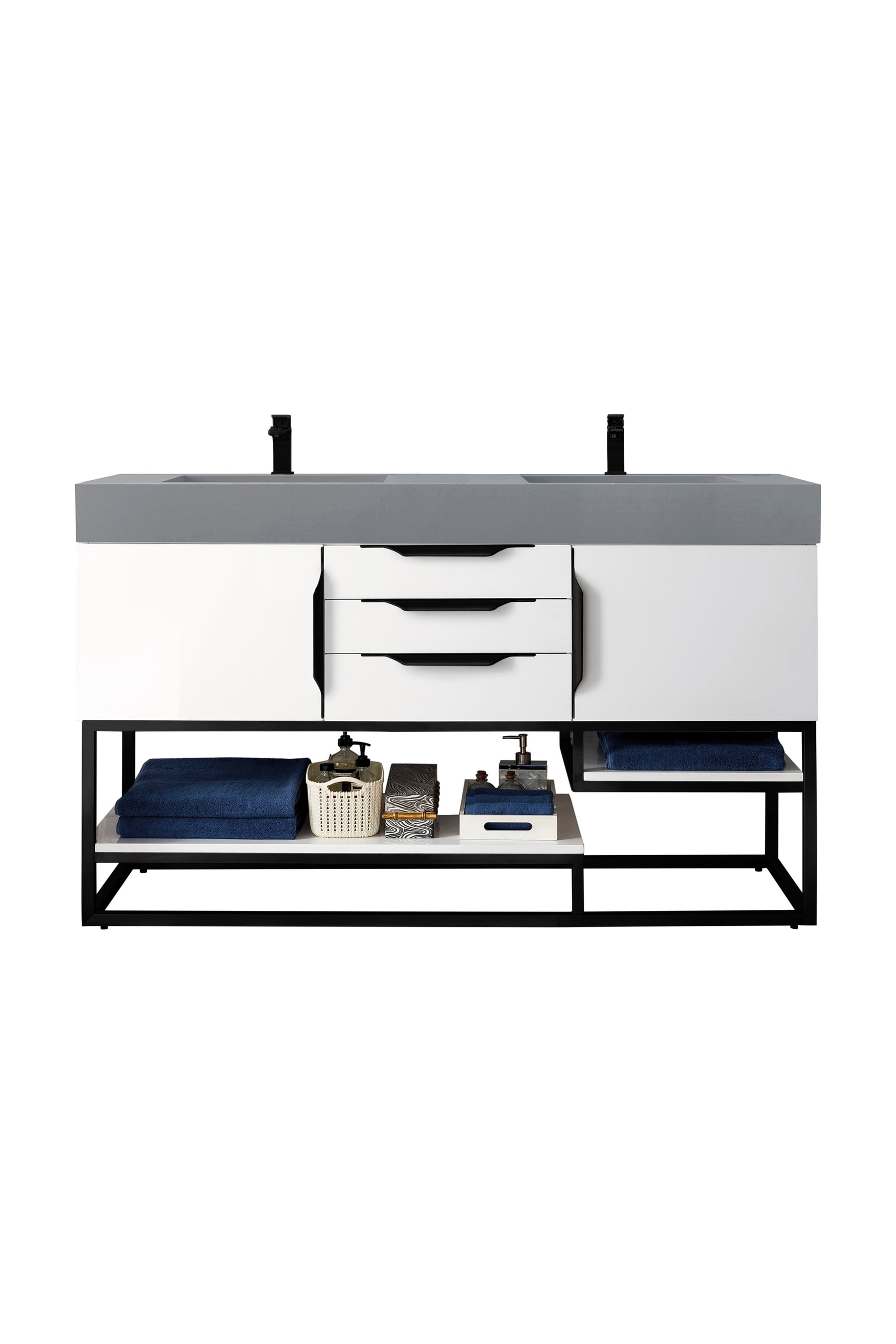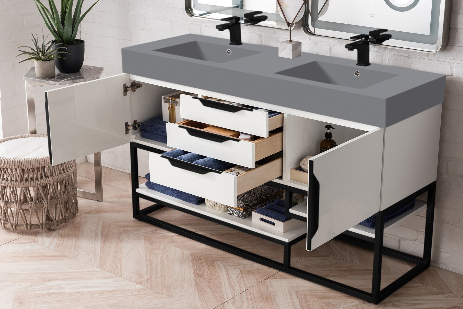 The Columbia 59" Glossy White Double Vanity offers maximum storage with two soft-closing doors, three soft-closing drawers, and lower shelf space. This cabinet includes premium features such as one solid bamboo drawer organizer and one 120 Volt UL Rated electrical component with two electrical and two USB outlets. The Matte Black finished base coordinates with the pulls. Dusk Grey Glossy Composite Stone countertop with integrated sink included.