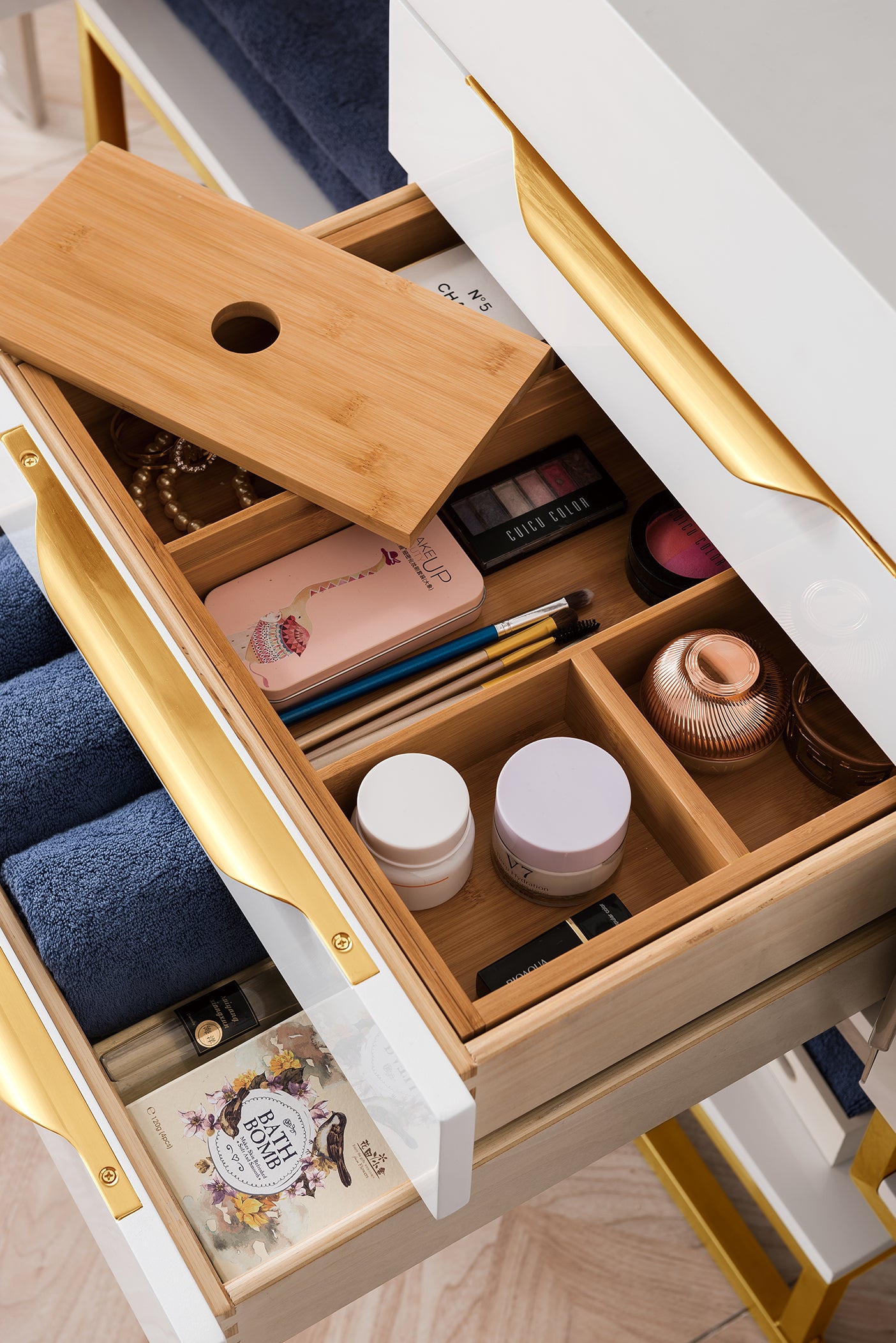 The Columbia 59" Glossy White Double Vanity offers maximum storage with two soft-closing doors, three soft-closing drawers, and lower shelf space. This cabinet includes premium features such as one solid bamboo drawer organizer and one 120 Volt UL Rated electrical component with two electrical and two USB outlets. The Radiant Gold finished base coordinates with the pulls. Glossy White Composite Stone countertop with integrated sink included.