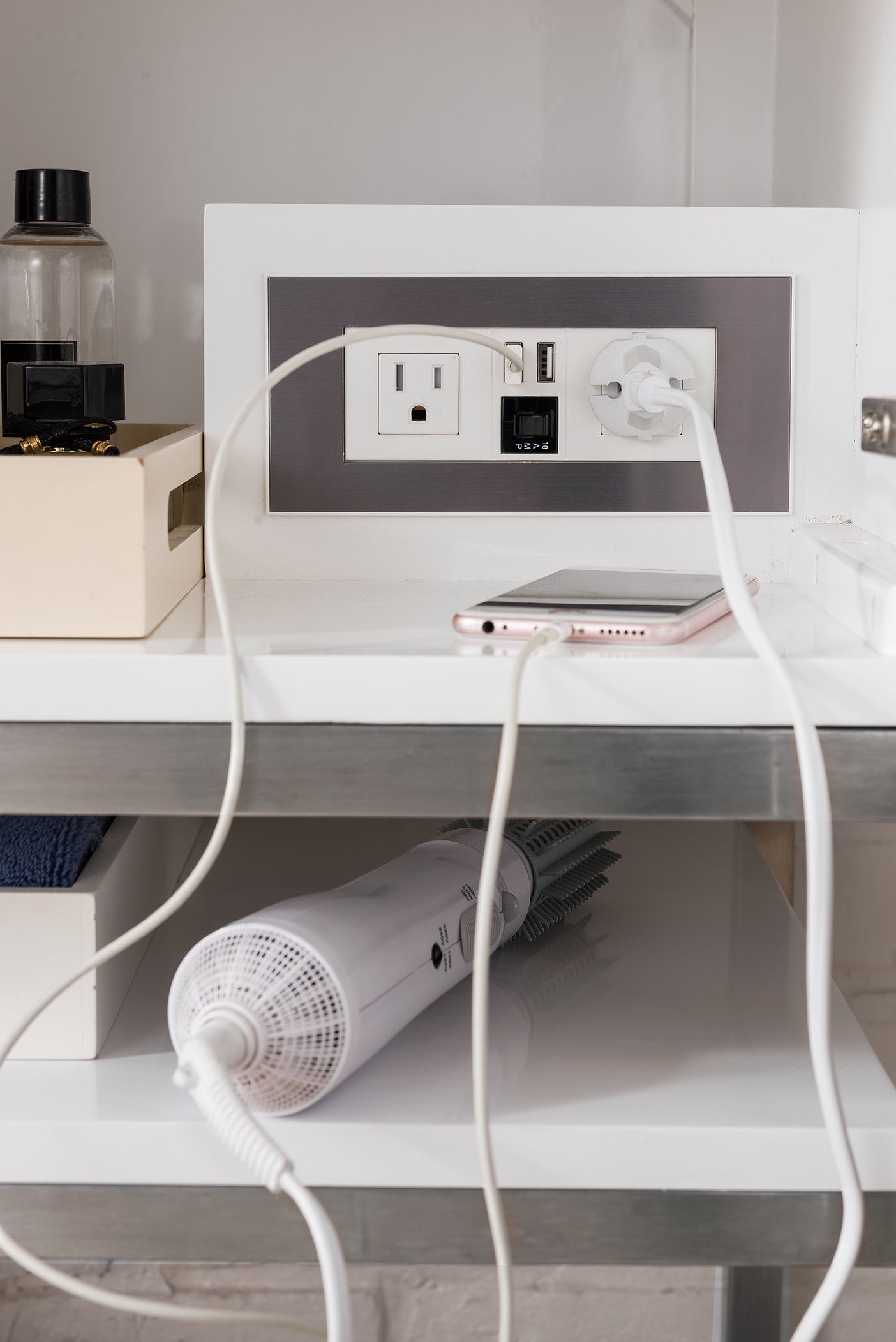 The Columbia 59" Glossy White Double Vanity offers maximum storage with two soft-closing doors, three soft-closing drawers, and lower shelf space. This cabinet includes premium features such as one solid bamboo drawer organizer and one 120 Volt UL Rated electrical component with two electrical and two USB outlets. The Brushed Nickel finished base coordinates with the pulls. Dusk Grey Glossy Composite Stone countertop with integrated sink included.