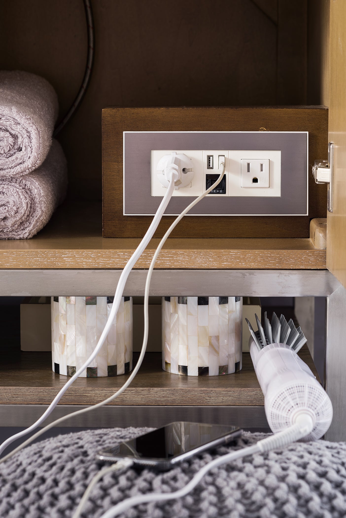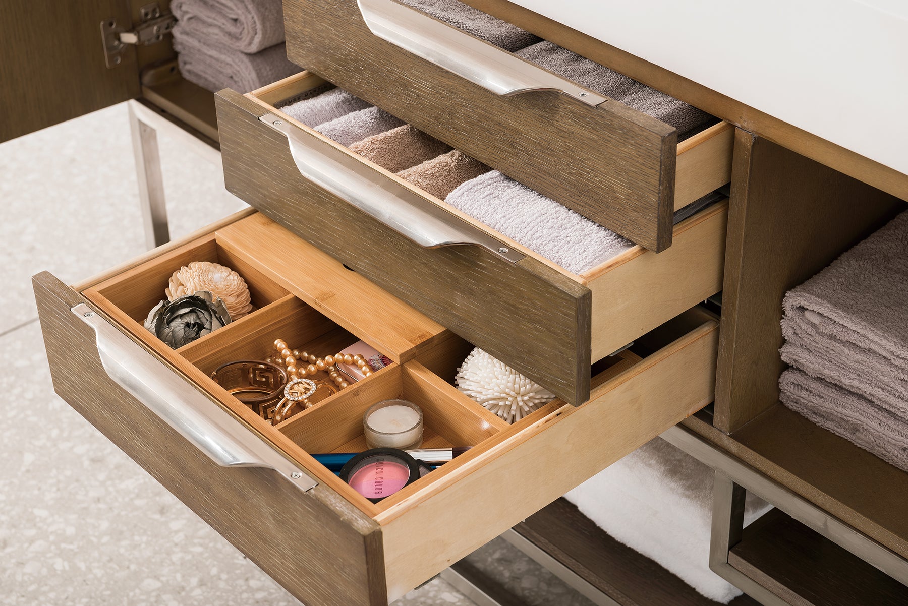 The Columbia 59" Latte Oak Double Vanity offers maximum storage with two soft-closing doors, three soft-closing drawers, and lower shelf space. This cabinet includes premium features such as one solid bamboo drawer organizer and one 120 Volt UL Rated electrical component with two electrical and two USB outlets. The Brushed Nickel finished base coordinates with the pulls. Glossy White Composite Stone countertop with integrated sink included.