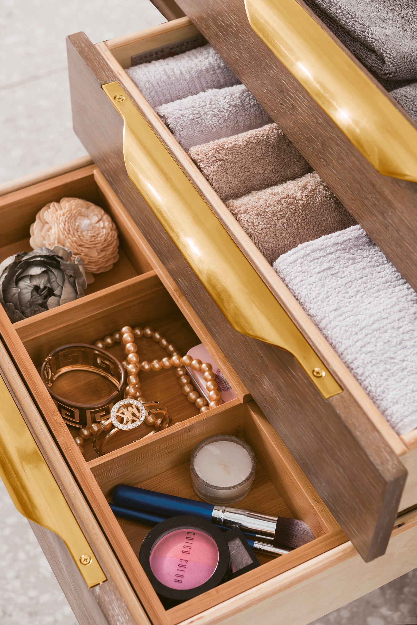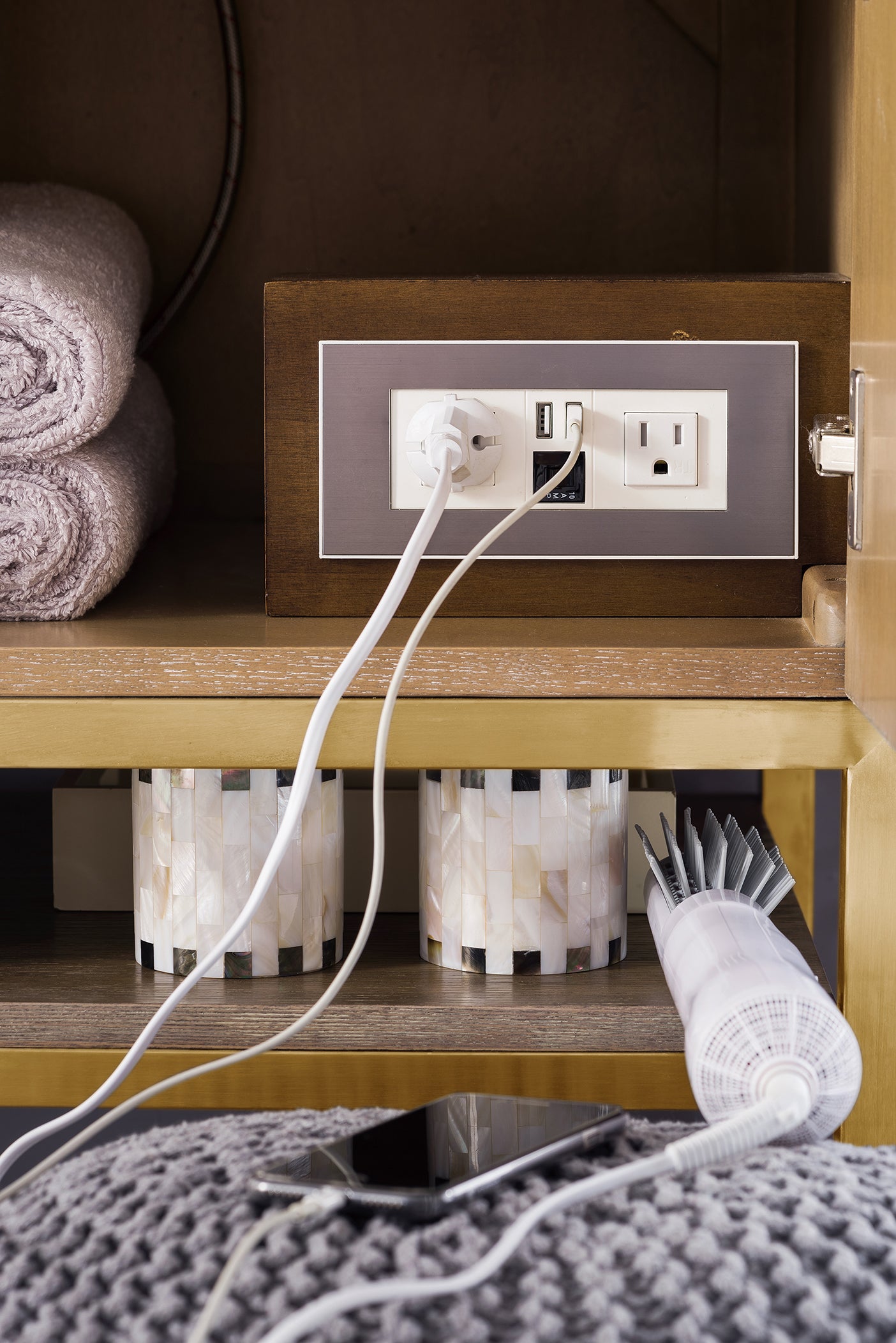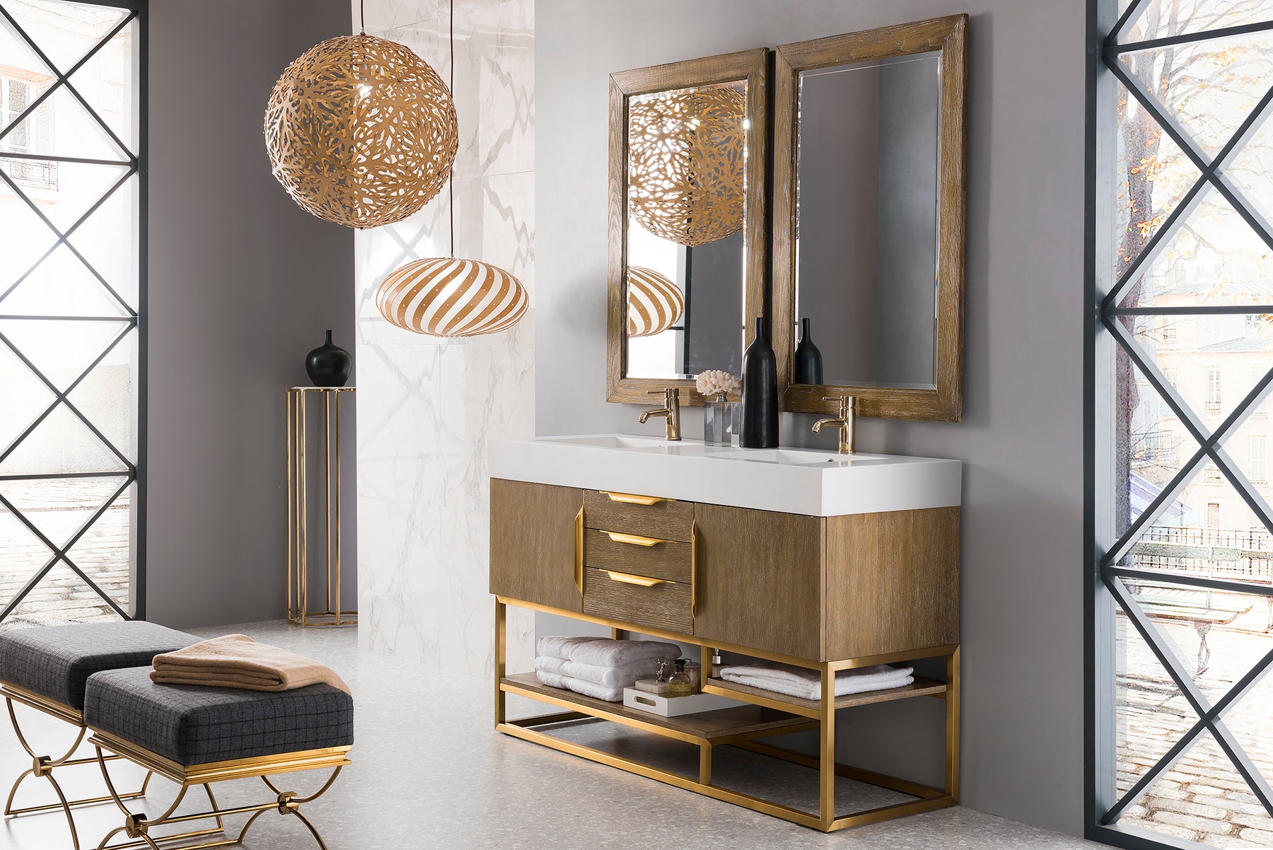 The Columbia 59" Latte Oak Double Vanity offers maximum storage with two soft-closing doors, three soft-closing drawers, and lower shelf space. This cabinet includes premium features such as one solid bamboo drawer organizer and one 120 Volt UL Rated electrical component with two electrical and two USB outlets. The Radiant Gold finished base coordinates with the pulls. Glossy White Composite Stone countertop with integrated sink included.