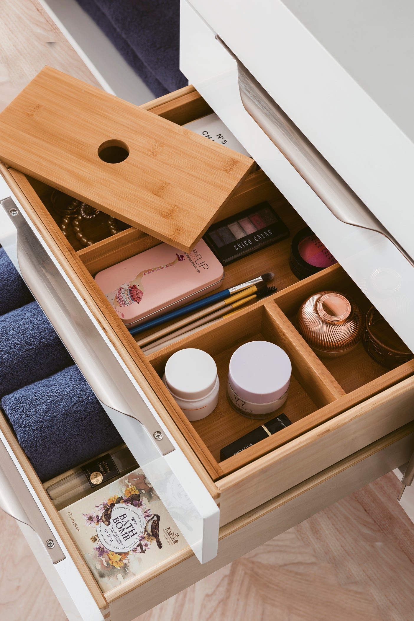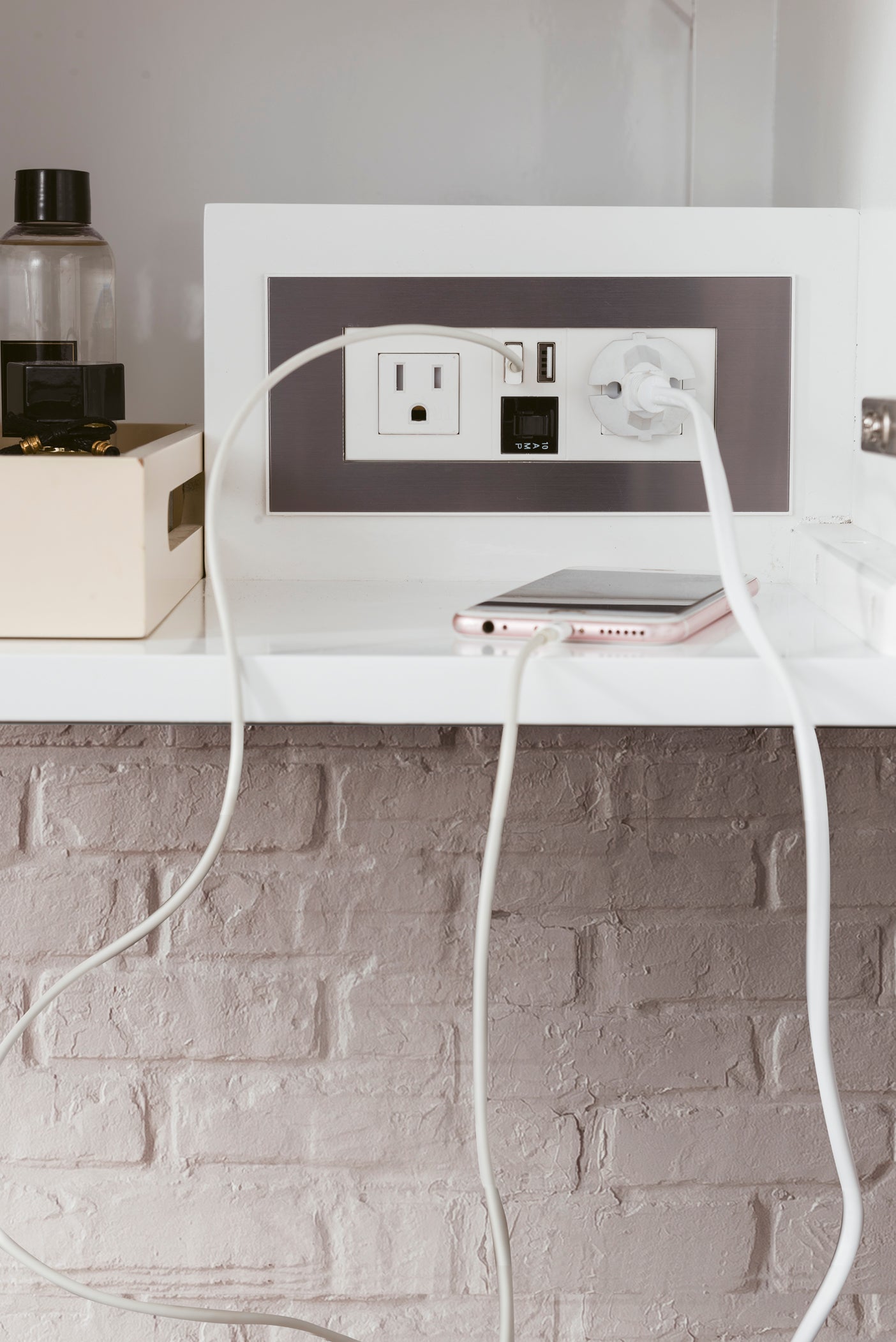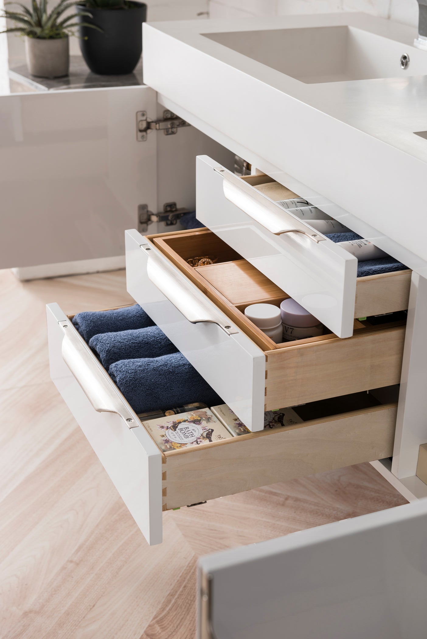 The Columbia 59" Glossy White Double Vanity offers maximum storage with two soft-closing doors and three soft-closing drawers. This cabinet includes premium features such as one solid bamboo drawer organizer and one 120 Volt UL Rated electrical component with two electrical and two USB outlets. Cabinet includes Brushed Nickel door and drawer pulls. Glossy White Composite Stone countertop with integrated sink included. This wall-mounted vanity includes heavy duty mounting brackets to create a modern look.