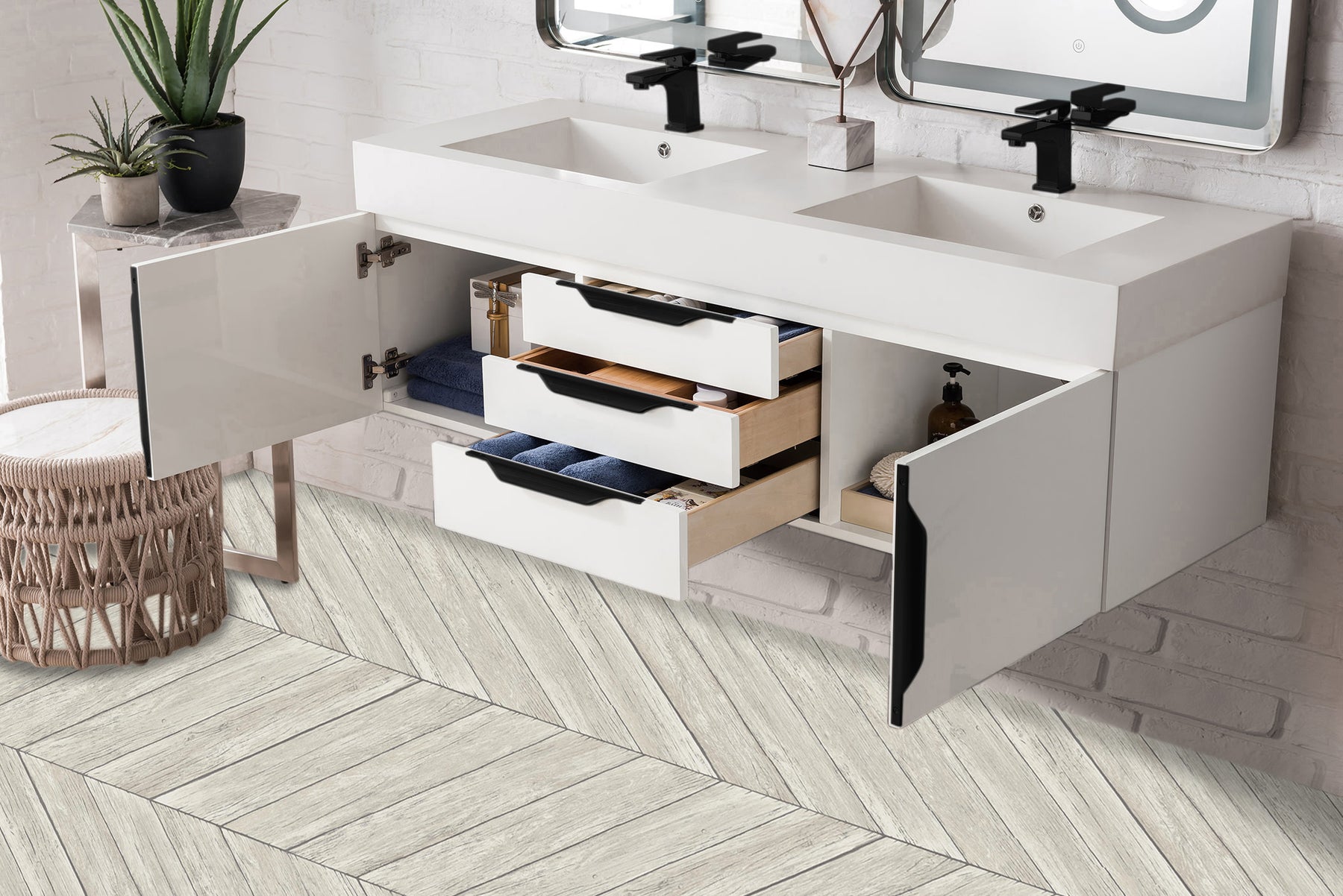 The Columbia 59" Glossy White Double Vanity offers maximum storage with two soft-closing doors and three soft-closing drawers. This cabinet includes premium features such as one solid bamboo drawer organizer and one 120 Volt UL Rated electrical component with two electrical and two USB outlets. Cabinet includes Matte Black door and drawer pulls. Glossy White Composite Stone countertop with integrated sink included. This wall-mounted vanity includes heavy duty mounting brackets to create a modern look.