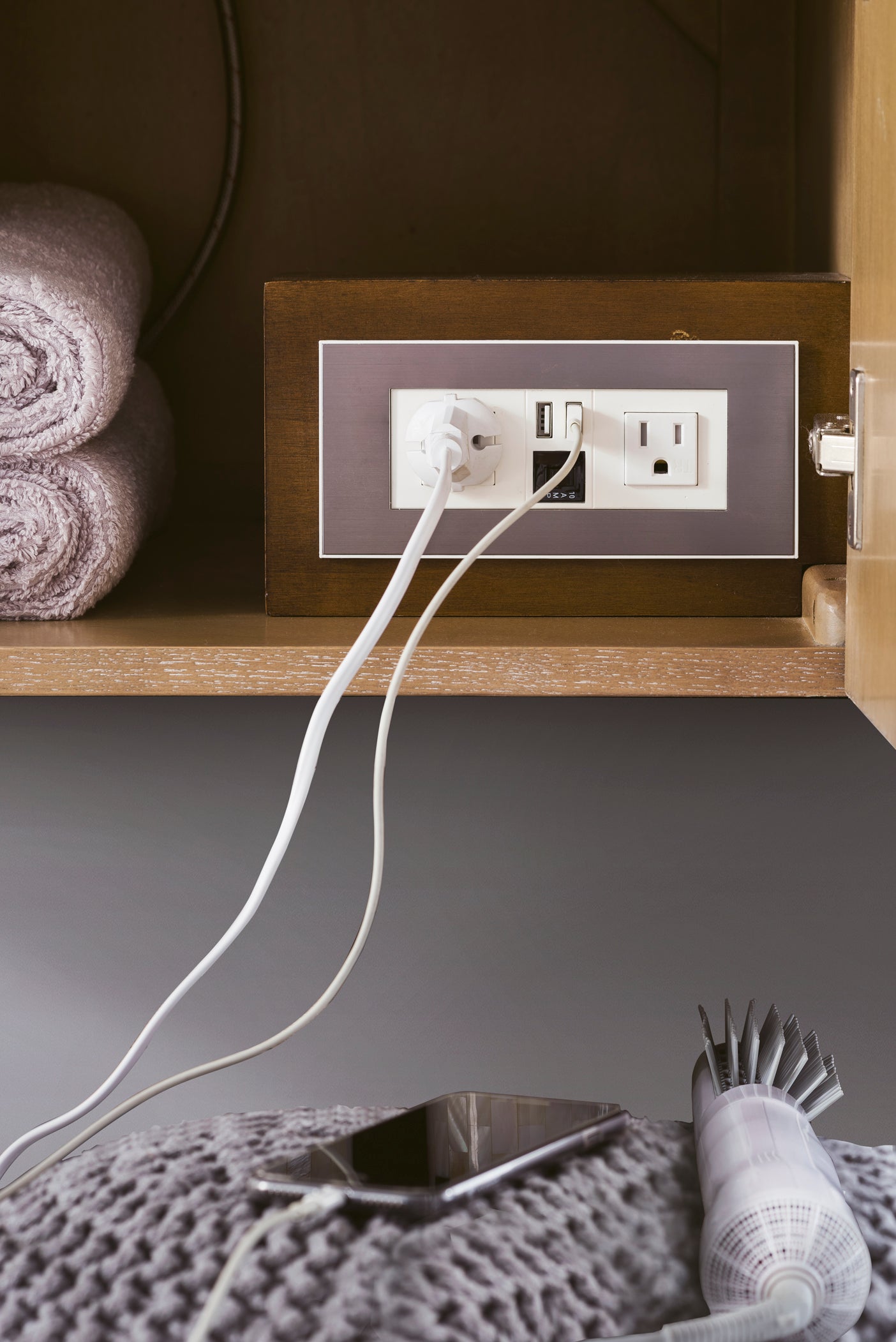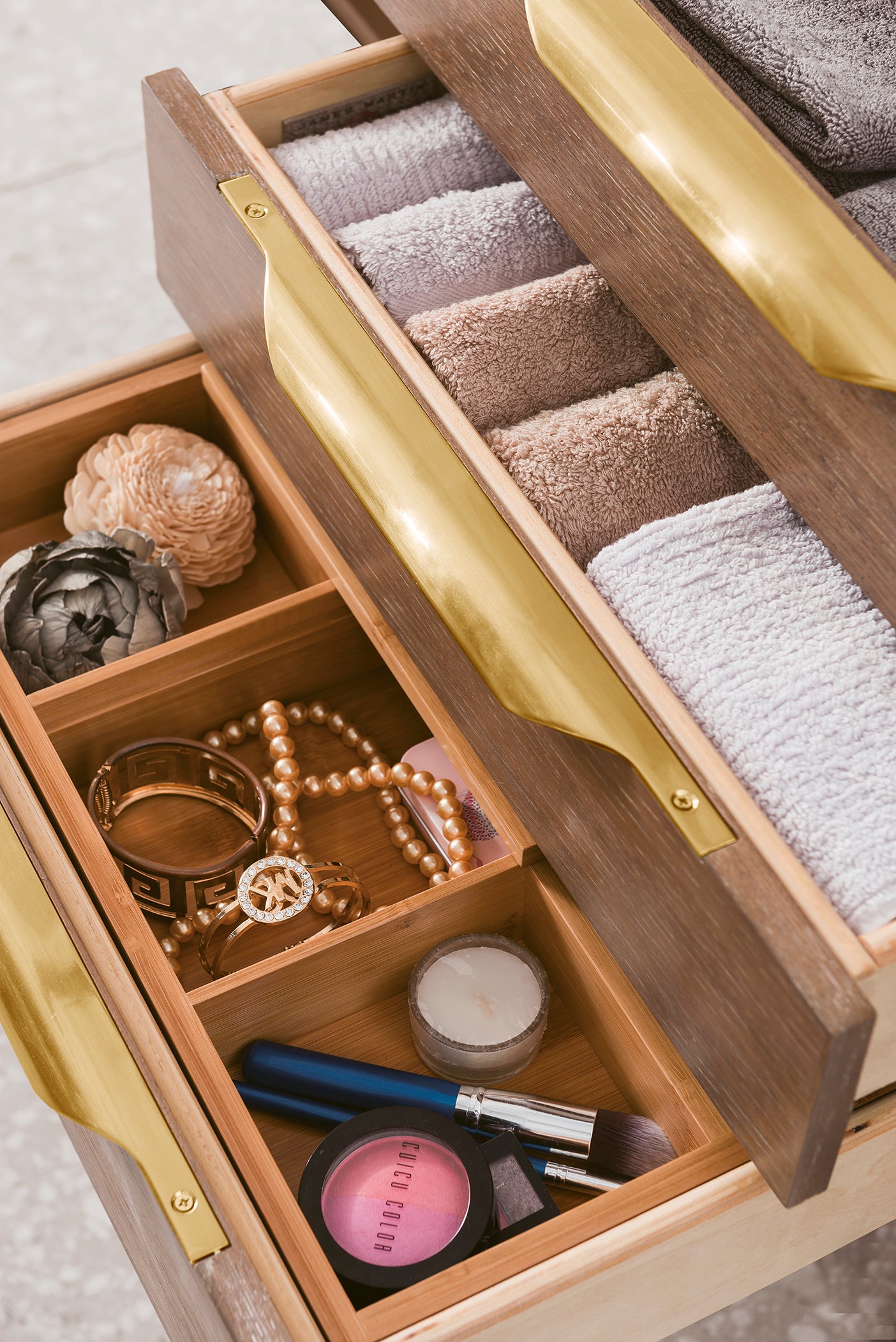 The Columbia 59" Latte Oak Double Vanity offers maximum storage with two soft-closing doors and three soft-closing drawers. This cabinet includes premium features such as one solid bamboo drawer organizer and one 120 Volt UL Rated electrical component with two electrical and two USB outlets. Cabinet includes Radiant Gold door and drawer pulls. Glossy White Composite Stone countertop with integrated sink included. This wall-mounted vanity includes heavy duty mounting brackets to create a modern look.