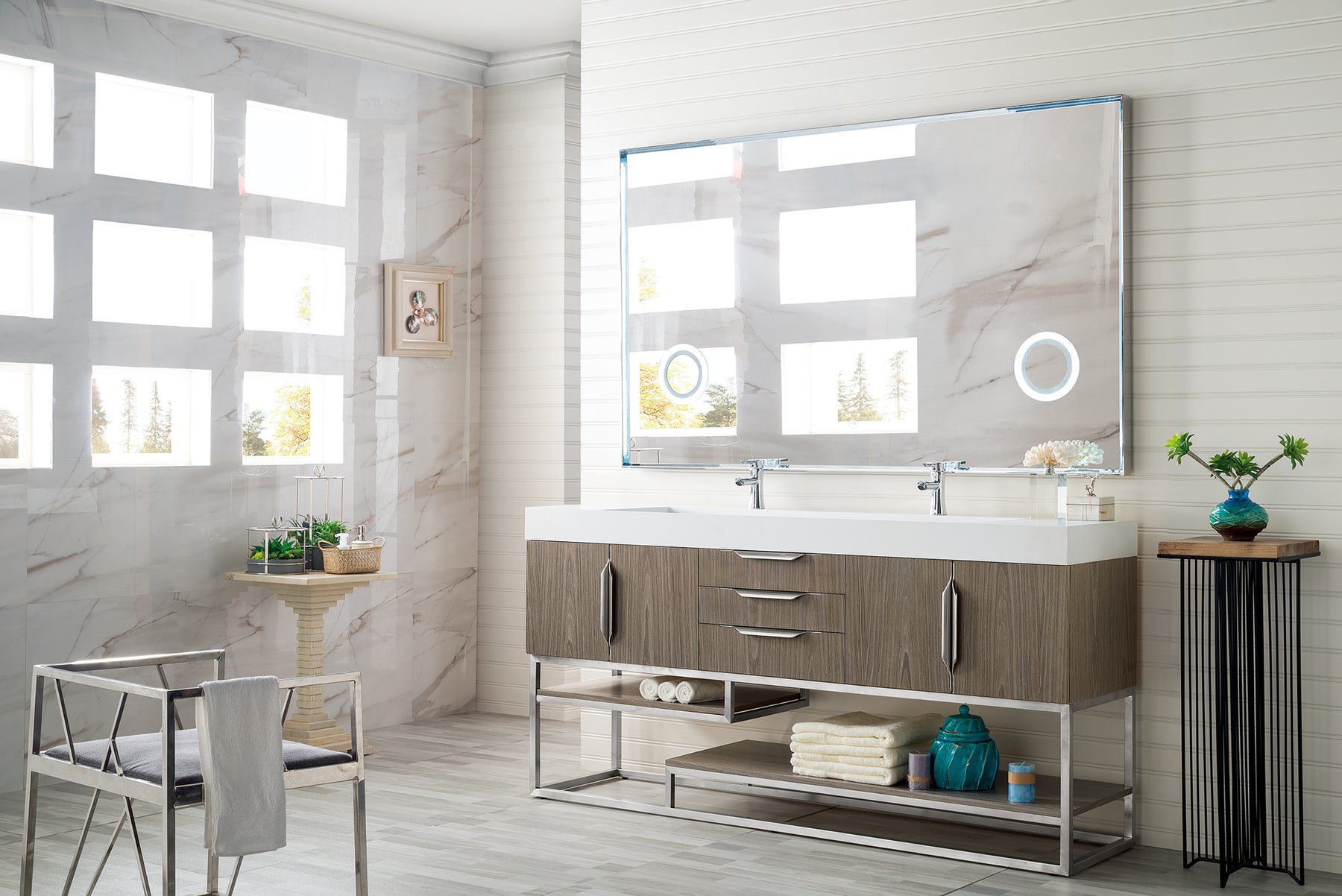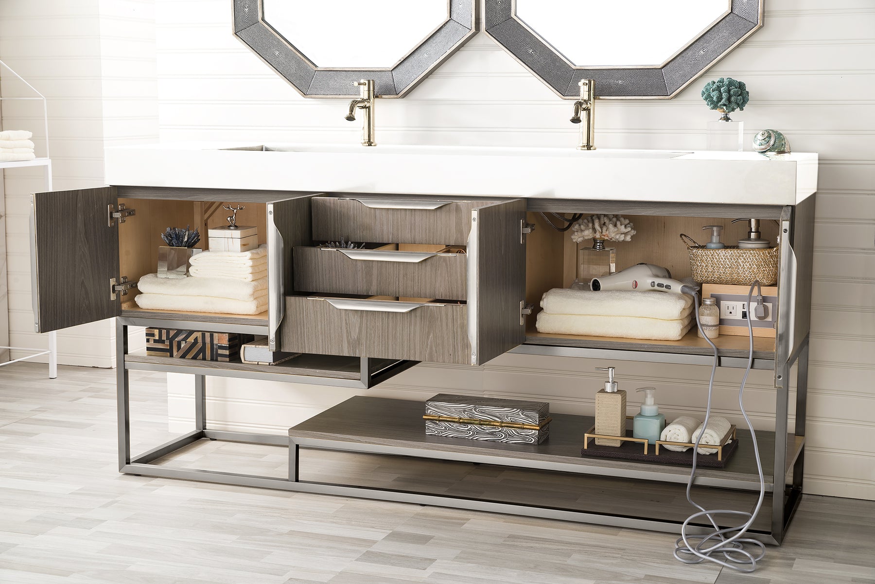 The Columbia 72" Ash Gray Double Vanity offers maximum storage with four soft-closing doors, three soft-closing drawers, and lower shelf space. This cabinet includes premium features such as one solid bamboo drawer organizer and one 120 Volt UL Rated electrical component with two electrical and two USB outlets. The Brushed Nickel finished base coordinates with the pulls. Glossy White Composite Stone countertop with integrated wide, angled trough-style sink.