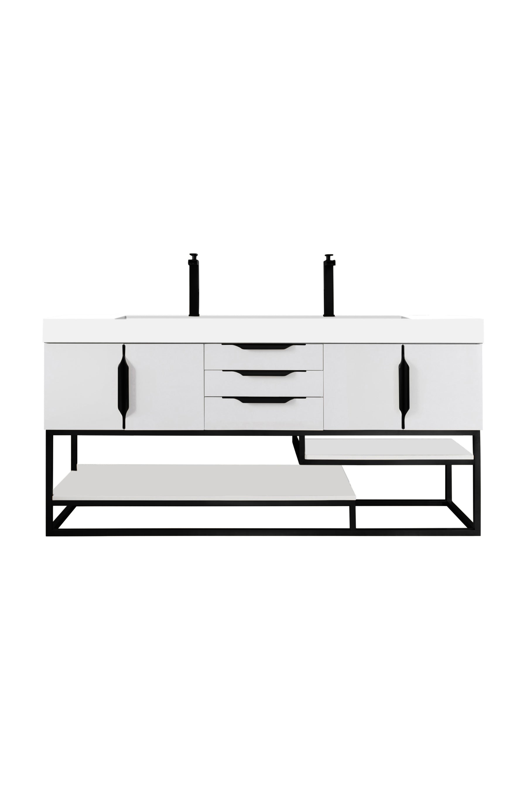 The Columbia 72" Glossy White Double Vanity offers maximum storage with two soft-closing doors, three soft-closing drawers, and lower shelf space. This cabinet includes premium features such as one solid bamboo drawer organizer and one 120 Volt UL Rated electrical component with two electrical and two USB outlets. The Matte Black finished base coordinates with the pulls. Glossy White Composite Stone countertop with integrated wide, angled trough-style sink.