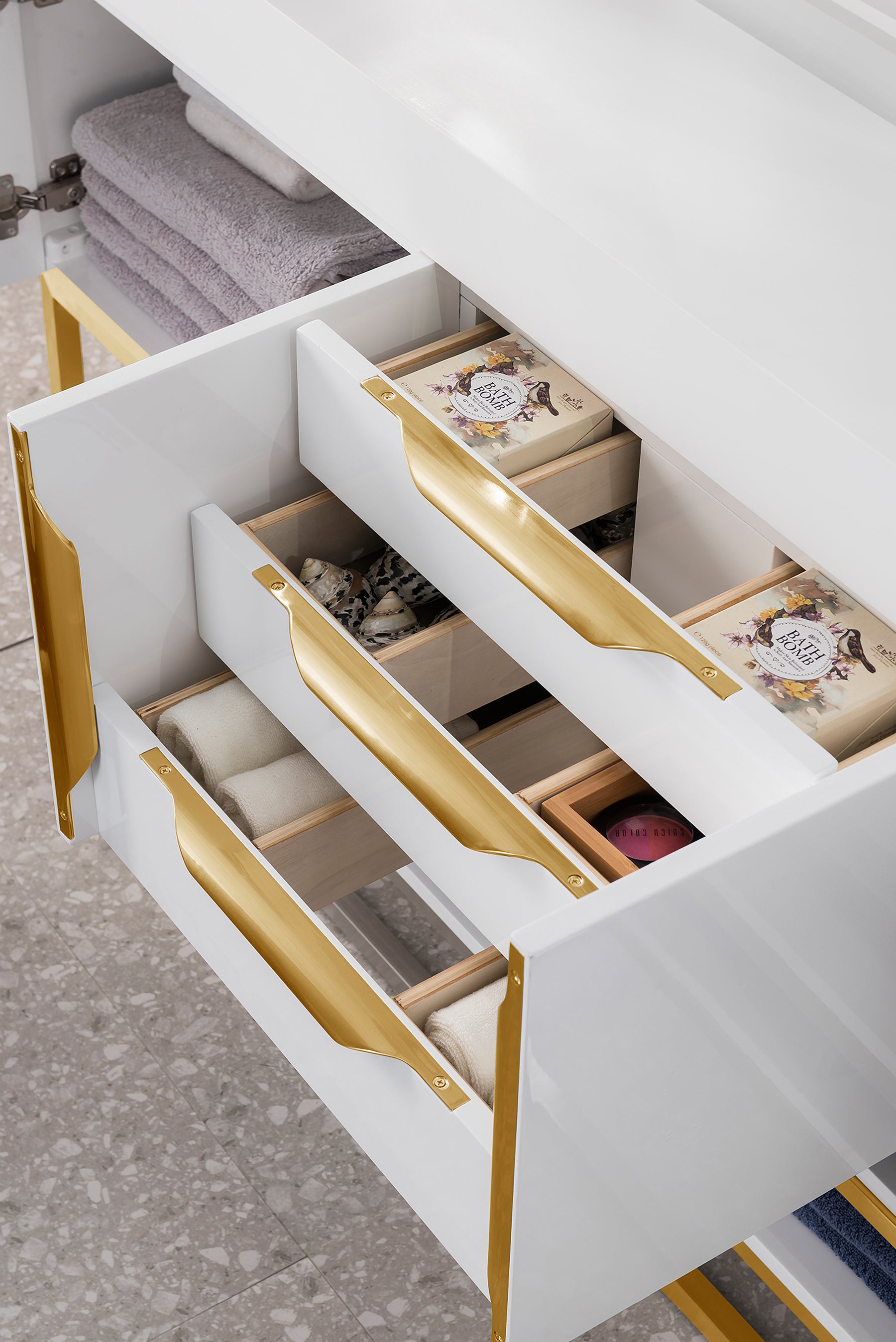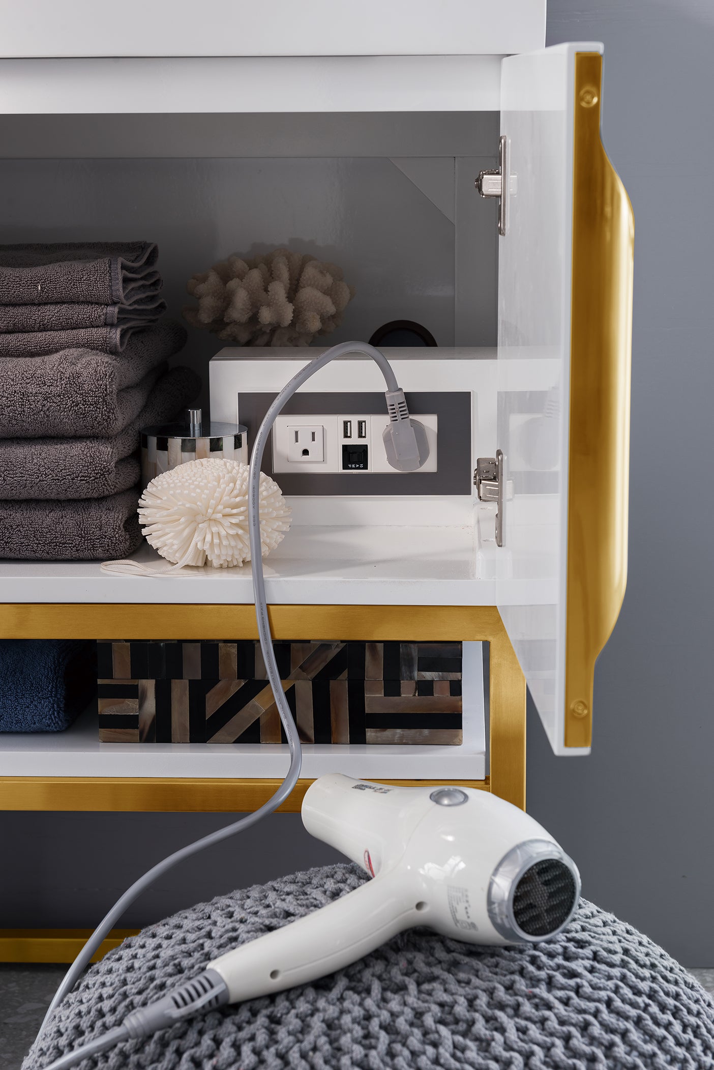 The Columbia 72" Glossy White Double Vanity offers maximum storage with two soft-closing doors, three soft-closing drawers, and lower shelf space. This cabinet includes premium features such as one solid bamboo drawer organizer and one 120 Volt UL Rated electrical component with two electrical and two USB outlets. The Radiant Gold finished base coordinates with the pulls. Glossy White Composite Stone countertop with integrated wide, angled trough-style sink.