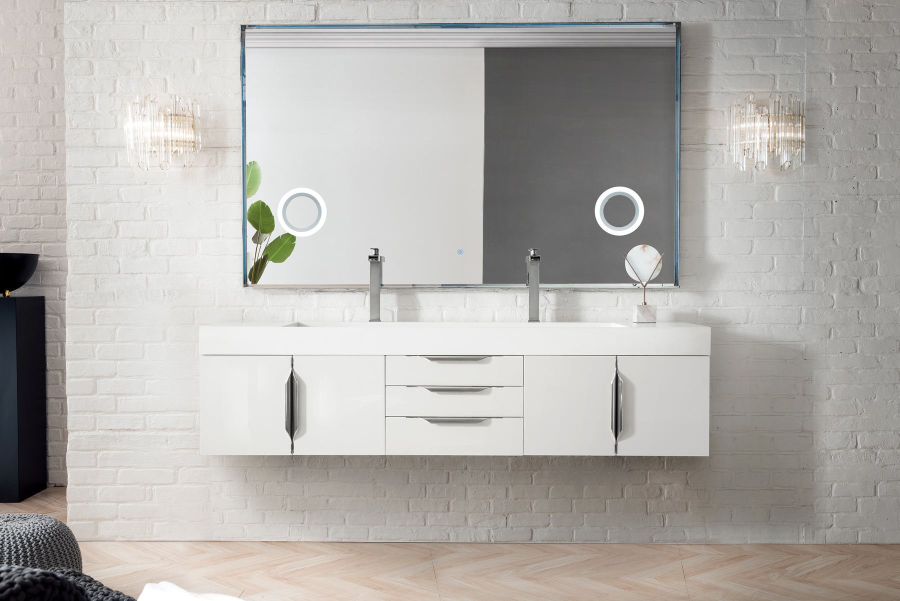 The Columbia 72" Glossy White Double Vanity offers maximum storage with four soft-closing doors and three soft-closing drawers. This cabinet includes premium features such as one solid bamboo drawer organizer and one 120 Volt UL Rated electrical component with two electrical and two USB outlets. Cabinet includes Brushed Nickel door and drawer pulls. Glossy White Composite Stone countertop with integrated wide, angled trough-style sink. This wall-mounted vanity includes heavy duty mounting brackets to create a modern look.