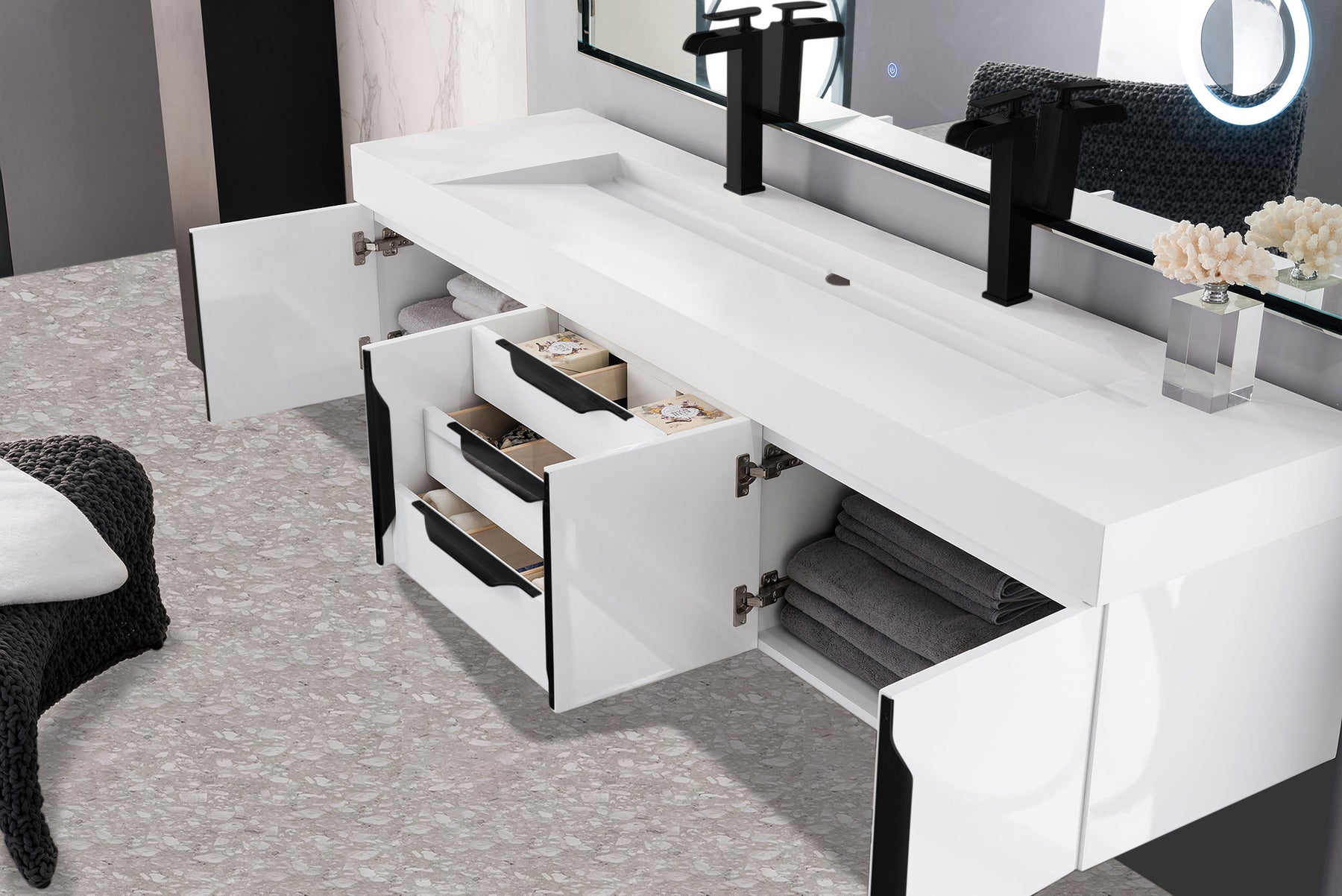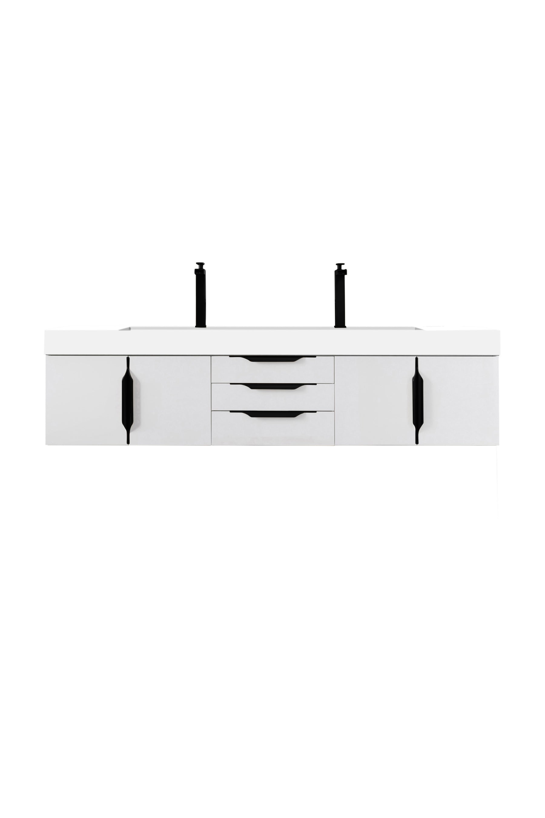 The Columbia 72" Glossy White Double Vanity offers maximum storage with two soft-closing doors and three soft-closing drawers. This cabinet includes premium features such as one solid bamboo drawer organizer and one 120 Volt UL Rated electrical component with two electrical and two USB outlets. Cabinet includes Matte Black door and drawer pulls. Glossy White Composite Stone countertop with integrated wide, angled trough-style sink. This wall-mounted vanity includes heavy duty mounting brackets to create a modern look.