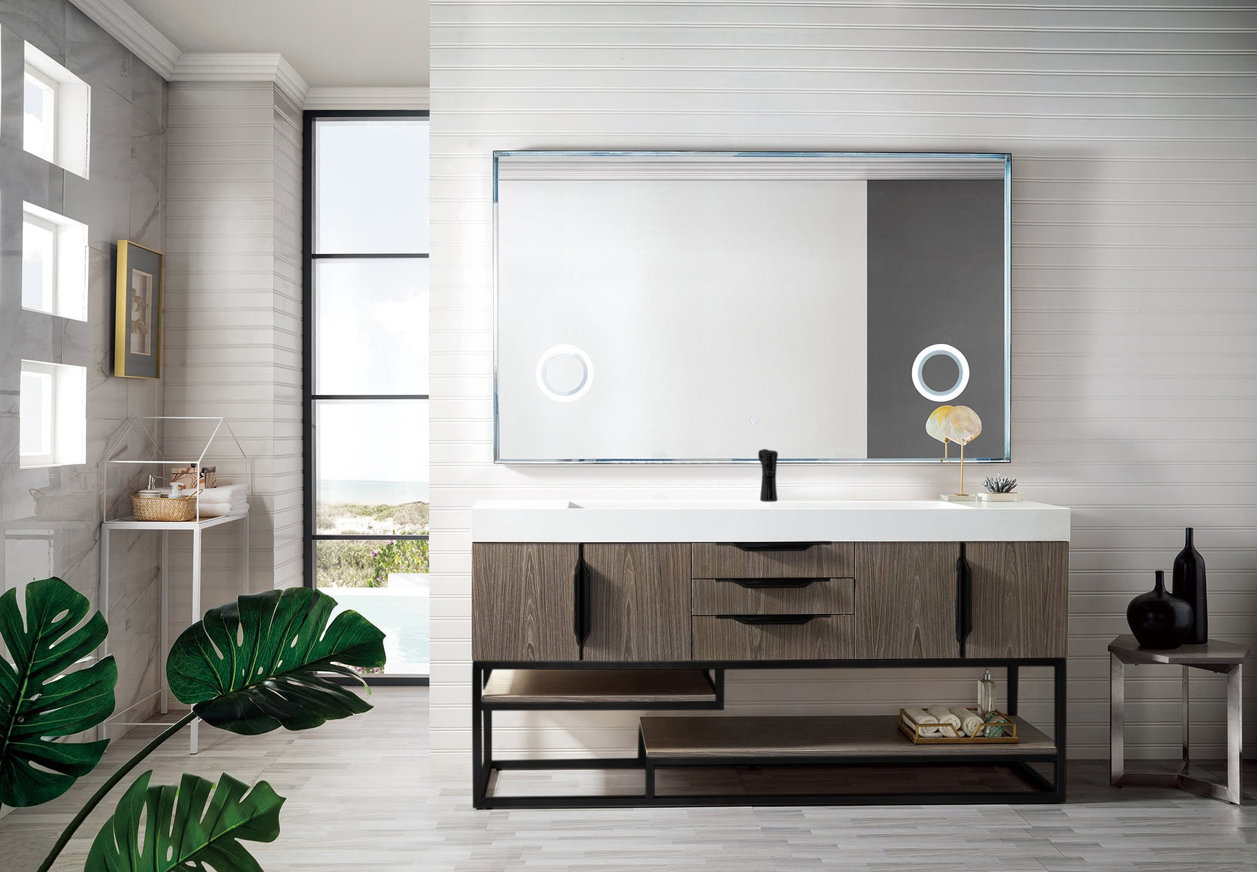 The Columbia 72" Ash Gray Single Vanity offers maximum storage with two soft-closing doors, three soft-closing drawers, and lower shelf space. This cabinet includes premium features such as one solid bamboo drawer organizer and one 120 Volt UL Rated electrical component with two electrical and two USB outlets. The Matte Black finished base coordinates with the pulls. Glossy White Composite Stone countertop with integrated wide, angled trough-style sink.