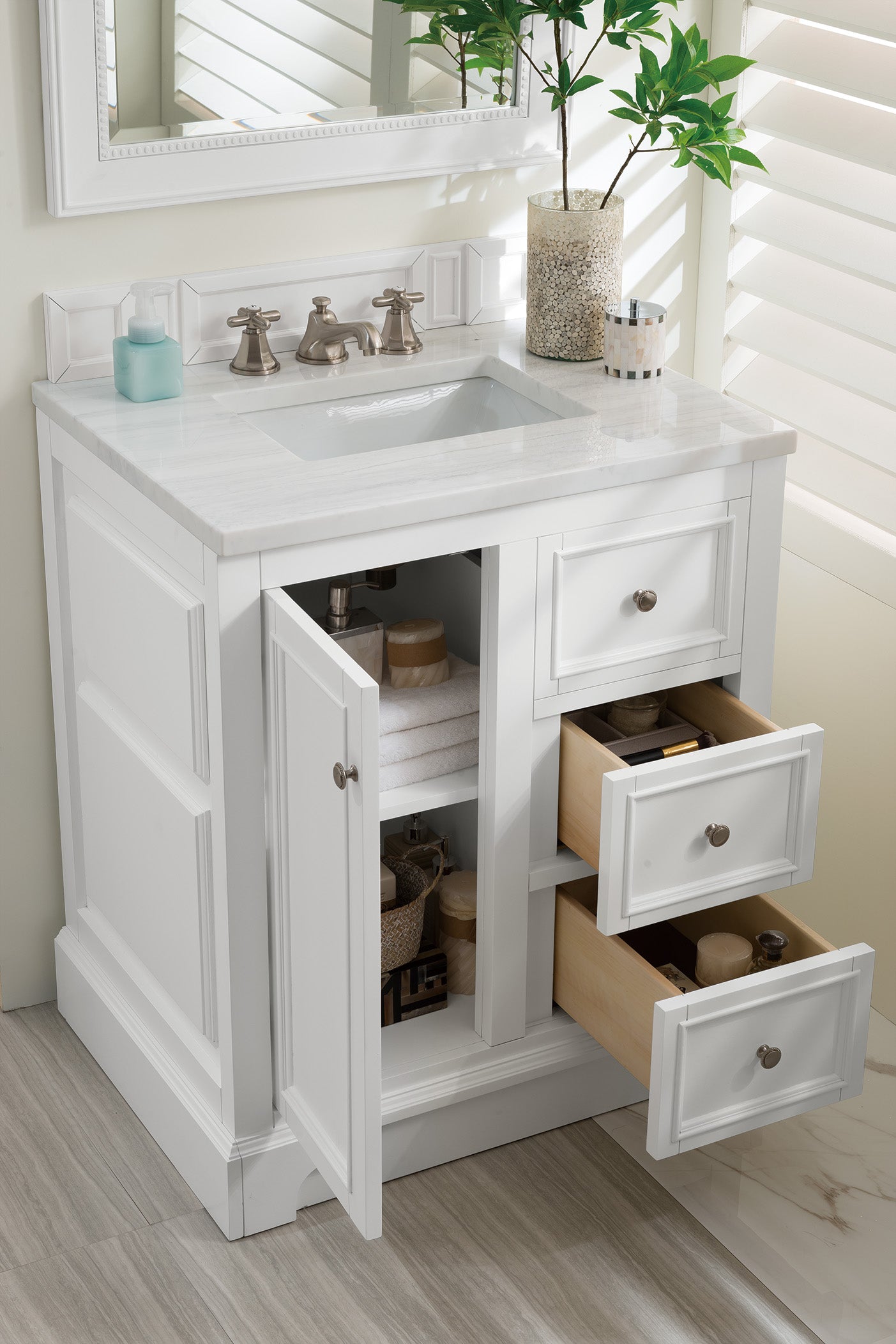 The De Soto 30" Bright White Single Vanity was designed to fulfill a wide range of tasks. Storage and convenience are foremost in this collection. The De Soto series provides ample storage in each of the six available widths and configurations. Cabinets are crafted from North American yellow poplar hardwoods and veneers. Low maintenance is provided with the full plinth base located behind the rounded bracket feet. Premium features in this series include beautiful faux-shagreen drawer organizers. Optional wood backsplash included. The look is completed with a 3 CM eased edge Arctic Fall Solid Surface top with one white ceramic rectangular sink.