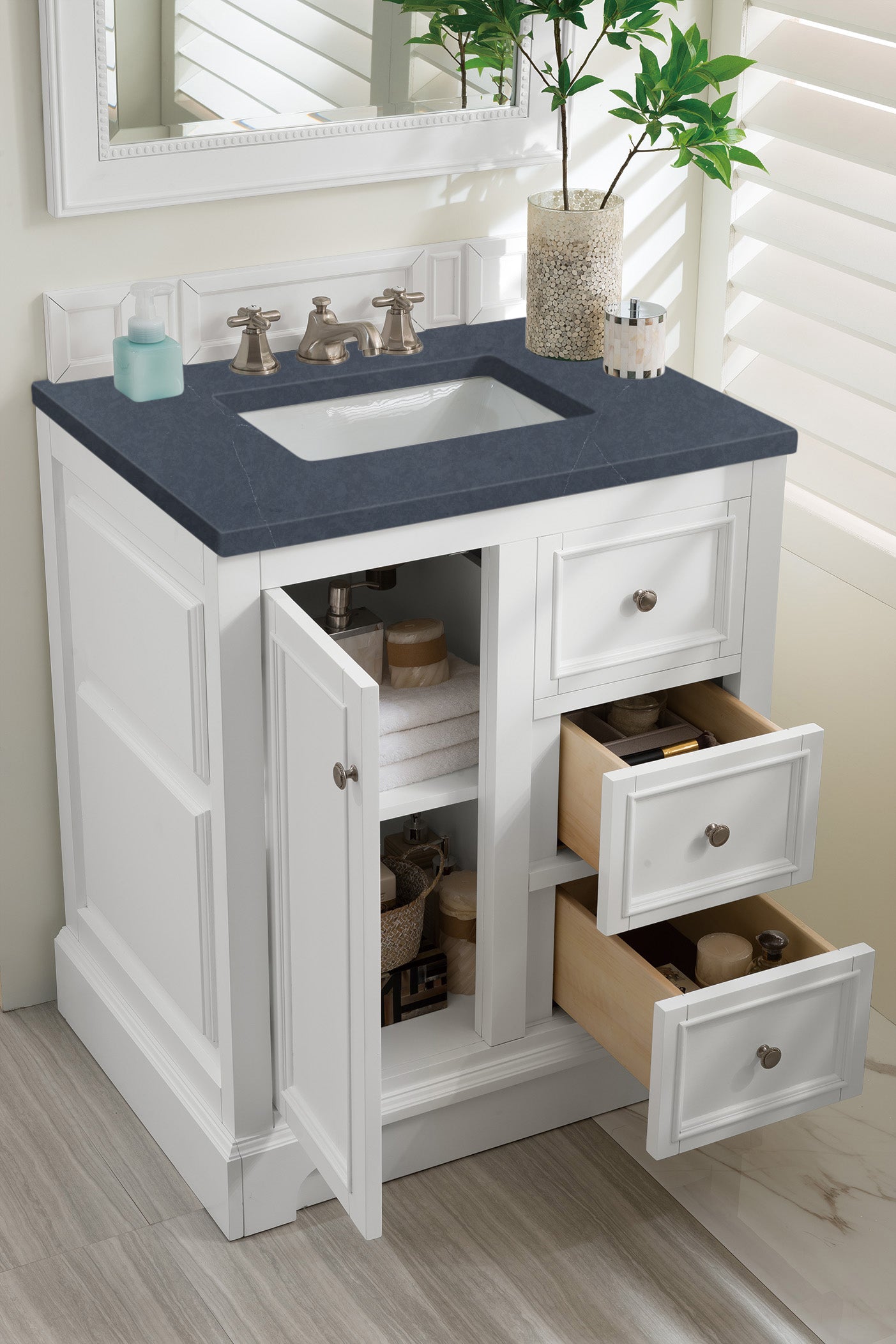 The De Soto 30" Bright White Single Vanity was designed to fulfill a wide range of tasks. Storage and convenience are foremost in this collection. The De Soto series provides ample storage in each of the six available widths and configurations. Cabinets are crafted from North American yellow poplar hardwoods and veneers. Low maintenance is provided with the full plinth base located behind the rounded bracket feet. Premium features in this series include beautiful faux-shagreen drawer organizers. Optional wood backsplash included. The look is completed with a 3 CM eased edge Charcoal Soapstone Silestone top with one white ceramic rectangular sink.