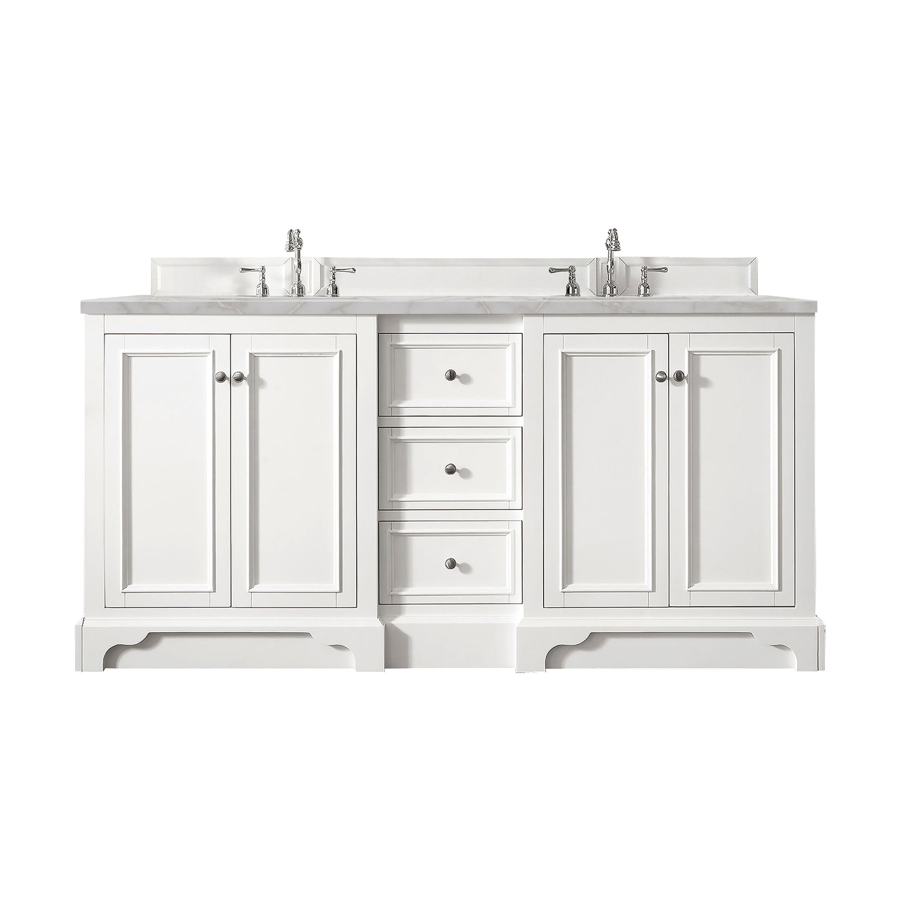 The De Soto 72" Bright White Double Vanity was designed to fulfill a wide range of tasks. Storage and convenience are foremost in this collection. The De Soto series provides ample storage in each of the six available widths and configurations. Cabinets are crafted from North American yellow Poplar hardwoods and veneers. Low maintenance is provided with the full plinth base located behind the rounded bracket feet. Premium features in this series include an electrical and USB outlet and beautiful faux-shagreen drawer organizers. Optional wood backsplash included. The Bright White finish is accented by the neutral background of the Victorian Silver Silestone top, boasting champagne metallic accents which seamlessly complete the look.