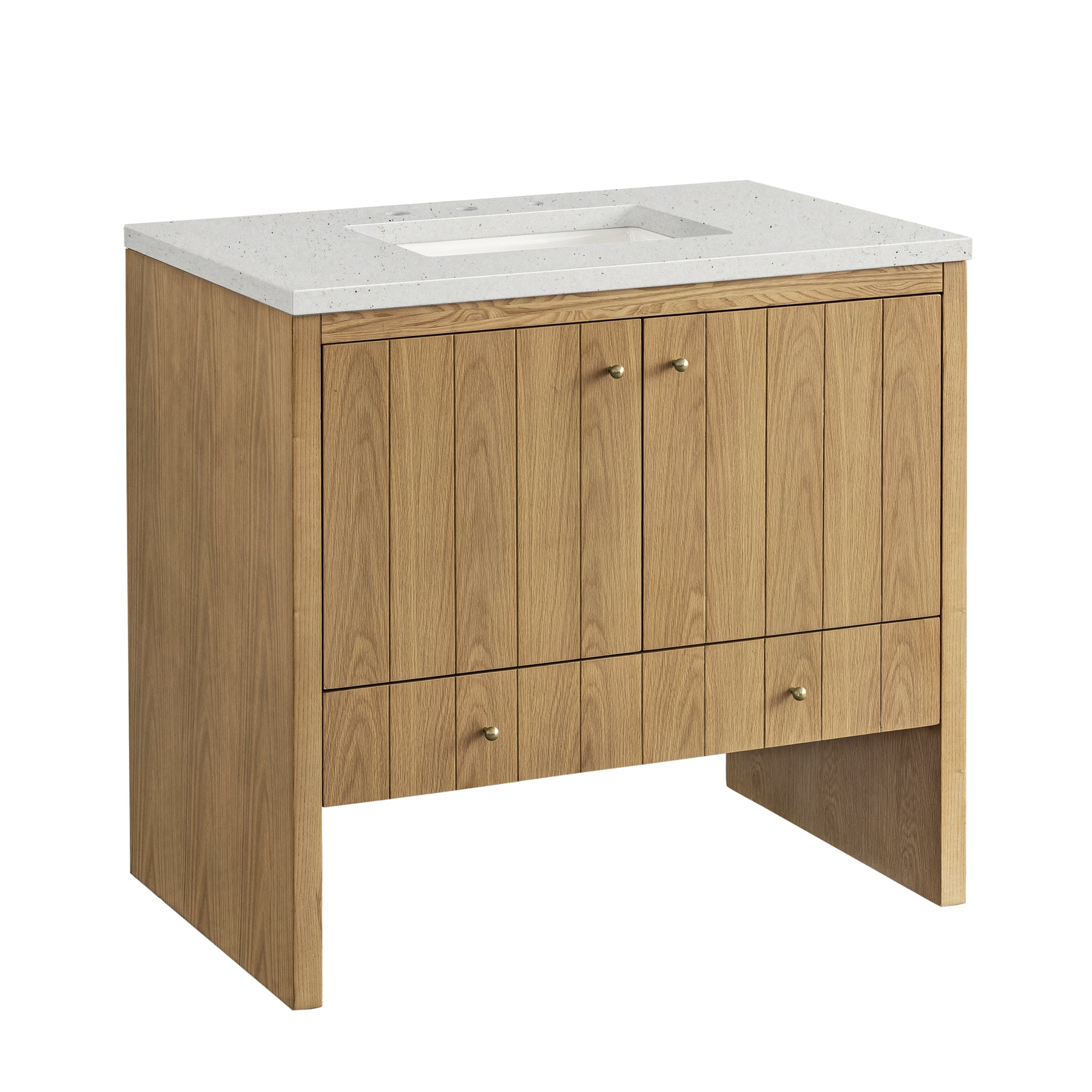 The cathedral grain Flat Cut Ash veneers and modern panel detailing on the doors and return panels give the Hudson collection the look of fine furnishings that is unexpected yet welcome for the bathroom space. The 36" vanity features one set of doors that offers a convenient dual power and USB outlet and ample storage. The lower drawer, with its removable bamboo storage organizer tray, allows for optimum organization. The Lime Delight Silestone top lends warm, textured beige tones to perfectly complement the Light Natural Oak finish on the vanity.