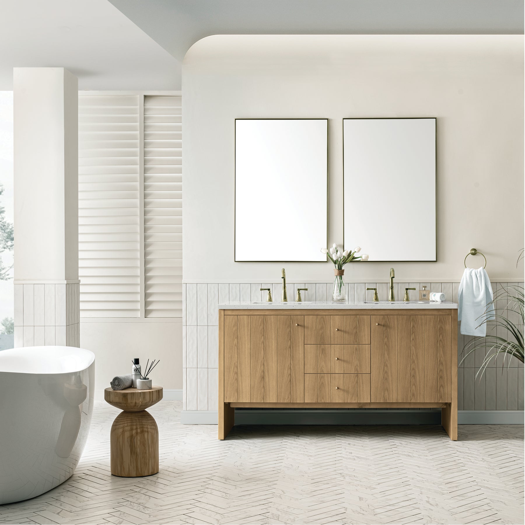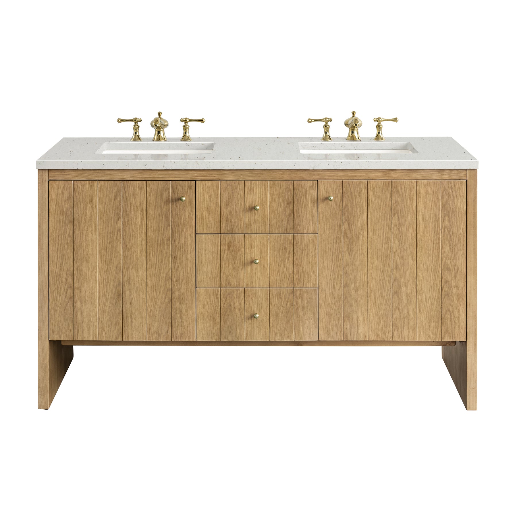 The cathedral grain Flat Cut Ash veneers and modern panel detailing on the doors and return panels give the Hudson collection the look of fine furnishings that is unexpected yet welcome for the bathroom space. The 60" Hudson Double Vanity features three generous drawers and one removable bamboo storage organizer tray, allowing for optimum organization. The right side door opens to reveal a convenient dual-power USB outlet while the left door conceals an additional drawer. The Lime Delight Silestone top lends warm, textured beige tones to perfectly complement the Light Natural Oak finish on the vanity.