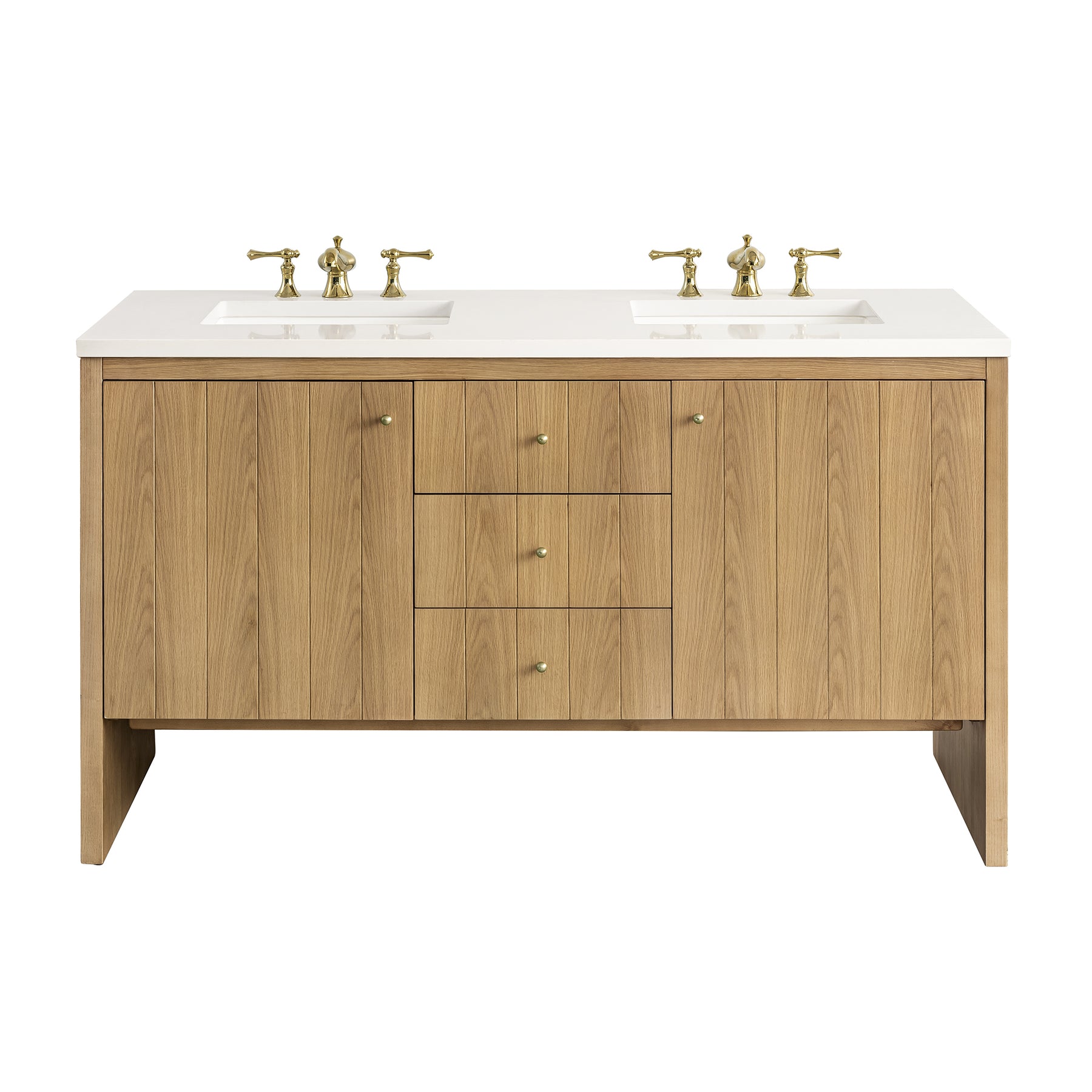 The cathedral grain Flat Cut Ash veneers and modern panel detailing on the doors and return panels give the Hudson collection the look of fine furnishings that is unexpected yet welcome for the bathroom space. The 60" Hudson Double Vanity features three generous drawers and one removable bamboo storage organizer tray, allowing for optimum organization. The right side door opens to reveal a convenient dual-power USB outlet while the left door conceals an additional drawer. The 3 CM White Zeus top provides the perfect final touch.