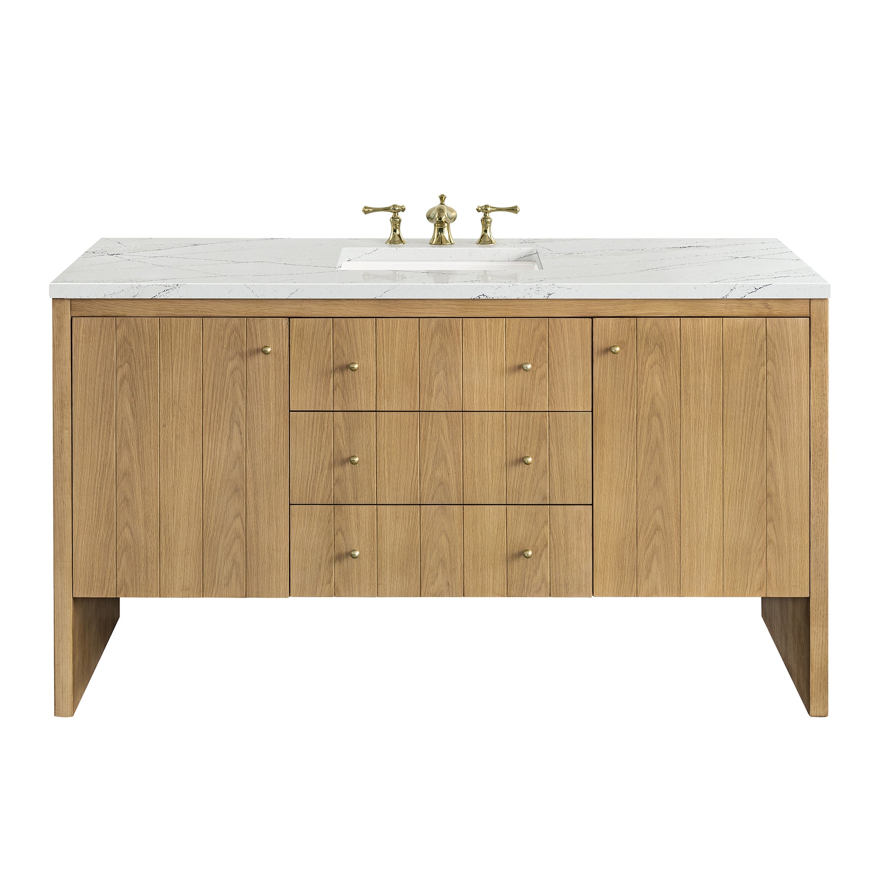 The cathedral grain Flat Cut Ash veneers and modern panel detailing on the doors and return panels give the Hudson collection the look of fine furnishings that is unexpected yet welcome for the bathroom space. The 60" Hudson Double Vanity features two generous drawers, one tip-out style drawer, and one removable bamboo storage organizer tray, allowing for optimum organization. The right side door reveals a convenient dual-power USB outlet, while the left conceals an additional drawer. The 3 CM Ethereal Noctis Silestone top provides the perfect final touch.