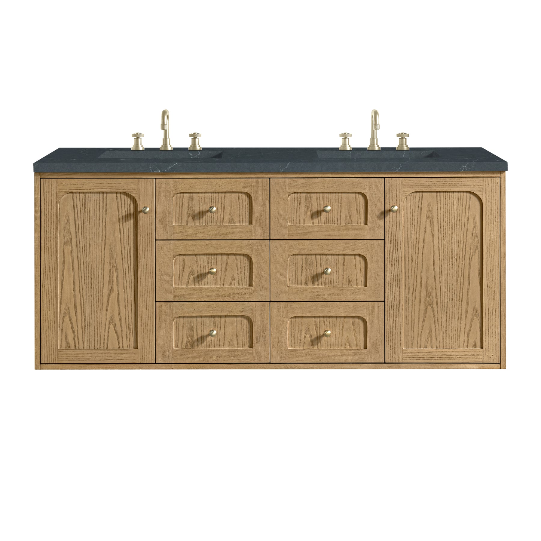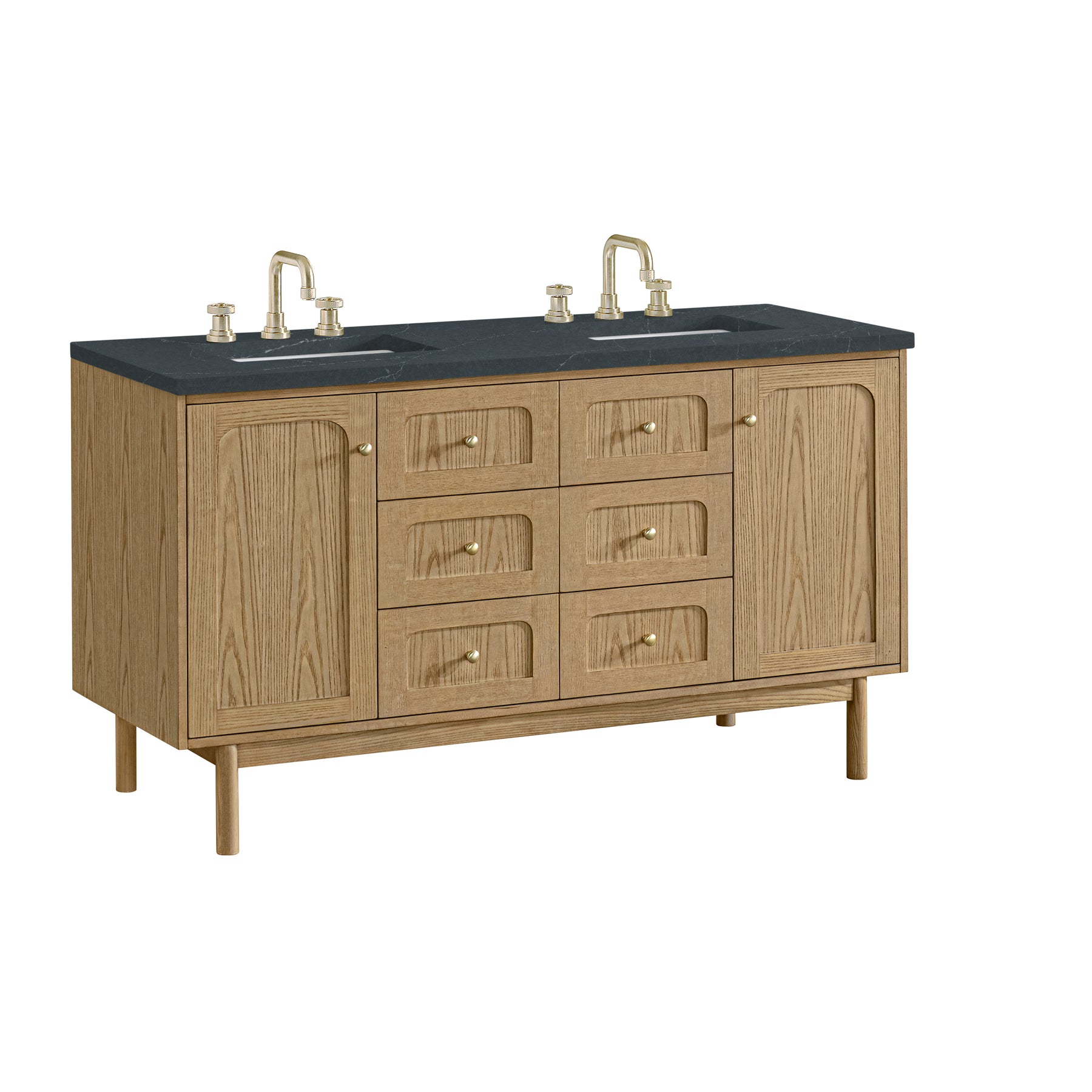 A modern interpretation of mid-century design, the Laurent 60" Double Vanity features organic charm with soft, rounded picture-frame details. Its Light Natural Oak finish over cathedral grain Ash veneers highlights the beautiful, natural wood texture, while Champagne Brass knobs lend a touch of elegance. Designed for versatility, this vanity offers two top-row tip-out drawers, four generously sized full-extension drawers, and a removable bamboo drawer organizer. The two-door cabinet door opens to adjustable shelves and a conveniently integrated USB/120V power unit. Choose to install the Laurent as a freestanding vanity with the modern wood base, or float it on your wall using our durable French cleat hardware. Perfectly crafted and beautifully appointed, Laurent brings an understated elegance to any bathroom. The addition of a matte Charcoal Soapstone Silestone top completes the look.