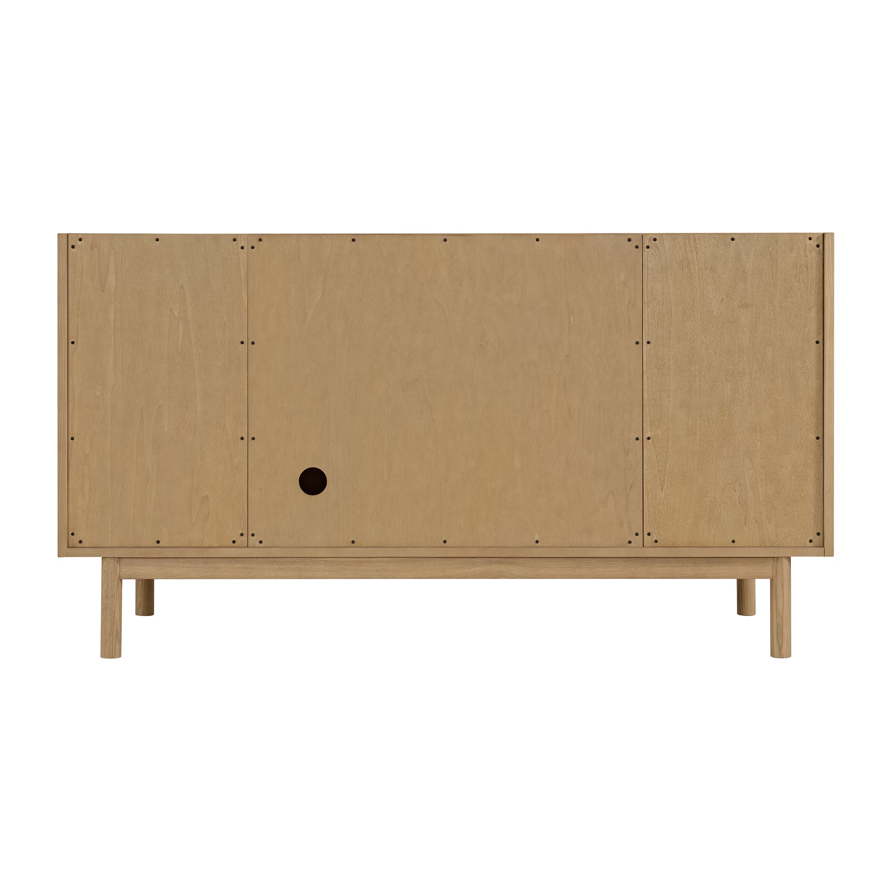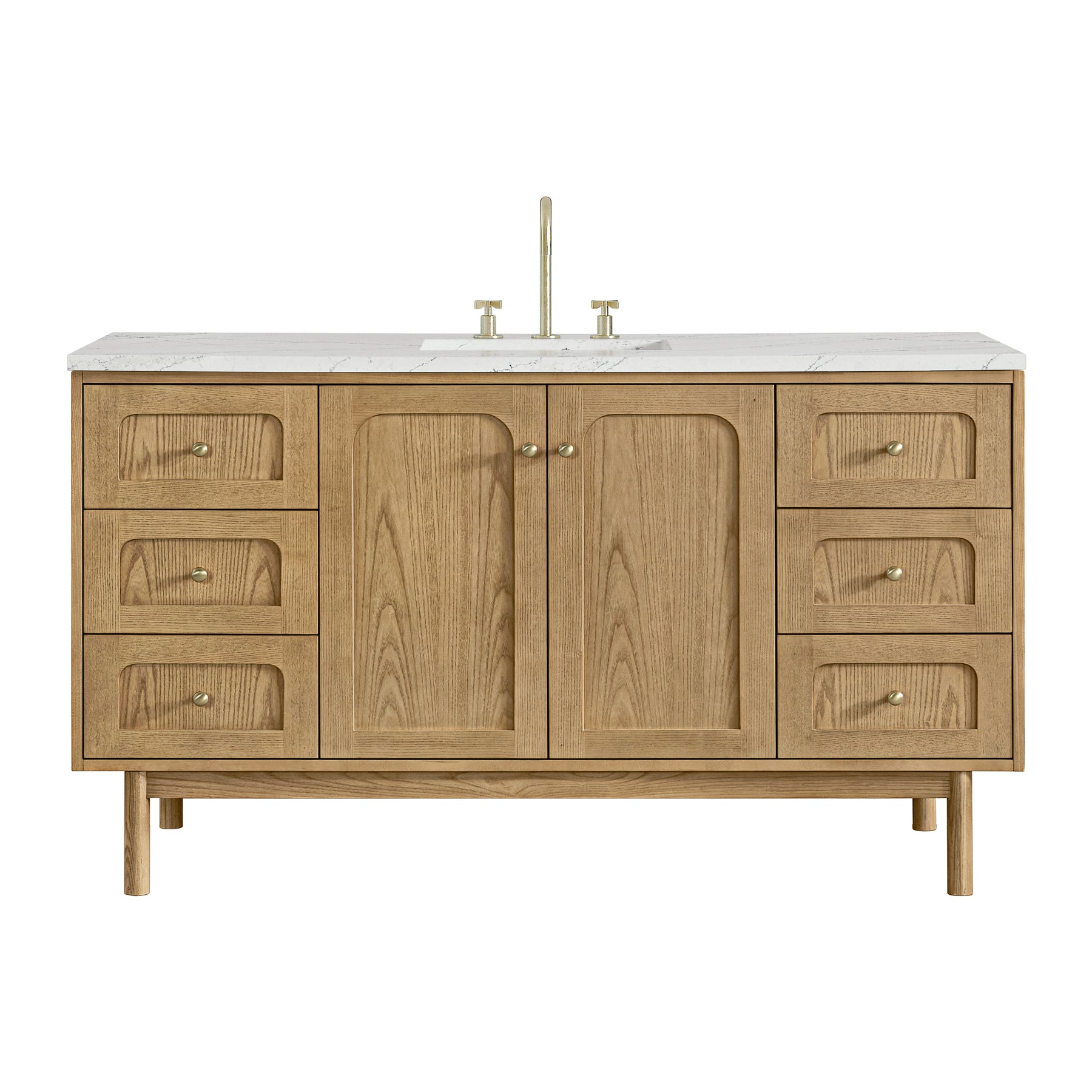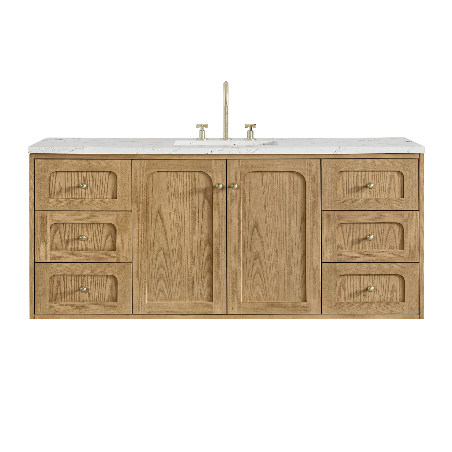 A modern interpretation of mid-century design, the Laurent 60" Single Vanity features organic charm with soft, rounded picture-frame details. Its Light Natural Oak finish over cathedral grain Ash veneers highlights the beautiful, natural wood texture, while Champagne Brass knobs lend a touch of elegance. Designed for versatility, this vanity offers six generously sized full-extension drawers and a removable bamboo drawer organizer. The two-door cabinet opens to an adjustable shelf and a conveniently integrated USB/120V power unit. Choose to install the Laurent as a freestanding vanity with the modern wood base, or float it on your wall using our durable French cleat hardware. Perfectly crafted and beautifully appointed, Laurent brings an understated elegance to any bathroom. The striking Ethereal Noctis Silestone top completes the look.