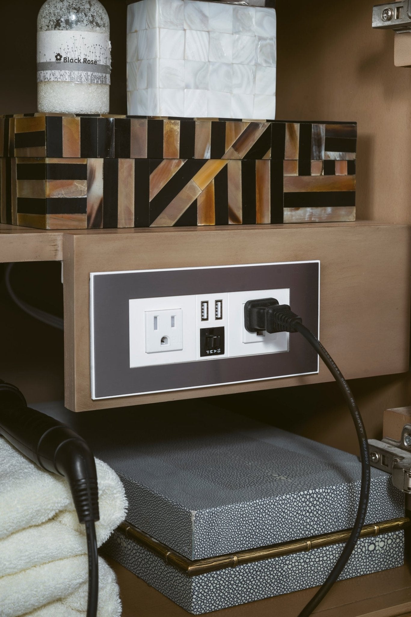 The Linear 72" Whitewashed Walnut Double Vanity features spacious storage options with four doors, two shelves, and three drawers. Cabinet exterior is made from solid American Walnut, highlighted by clean lines and Satin Nickel finish knobs. Premium features include one faux shagreen drawer organizer and one 120 Volt UL Rated electrical component with two electrical and two USB outlets. The look is completed with a Glossy White Composite Stone integrated top and sink. The recessed interior drawer is designed to only extend and open half way.